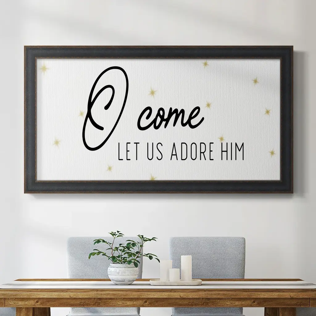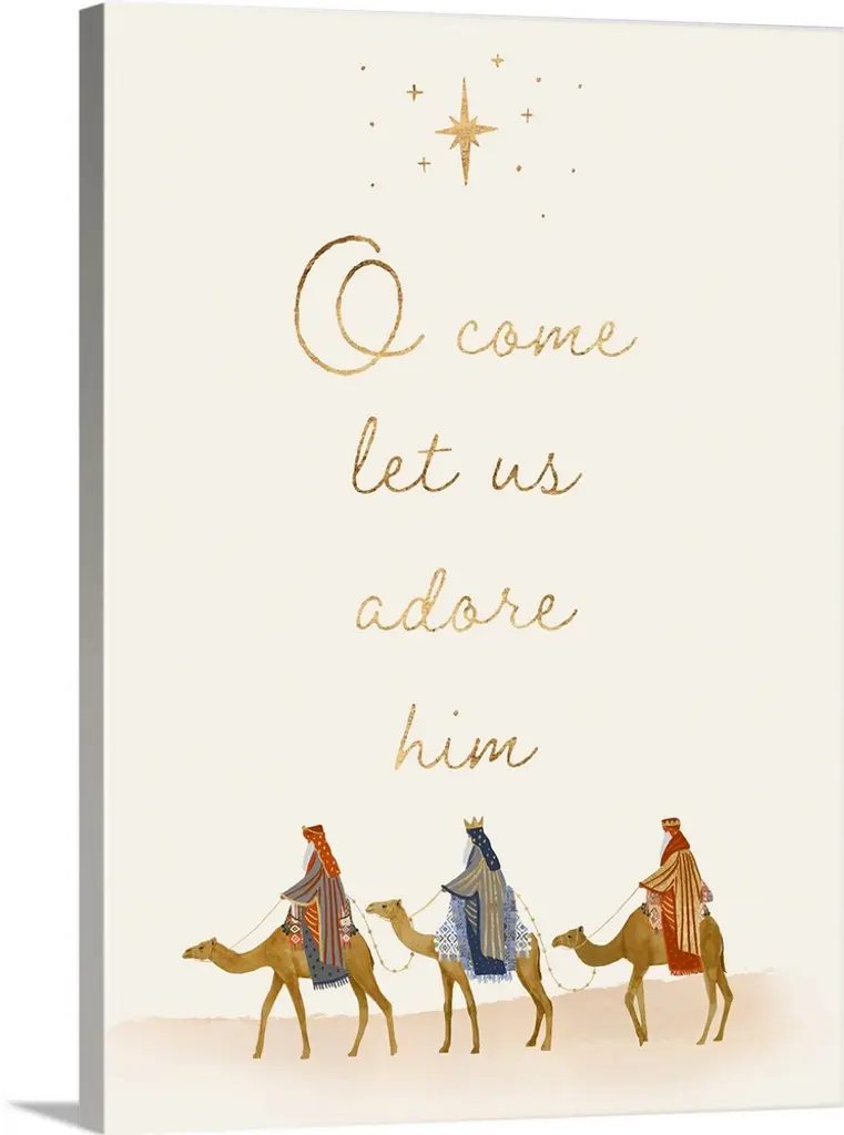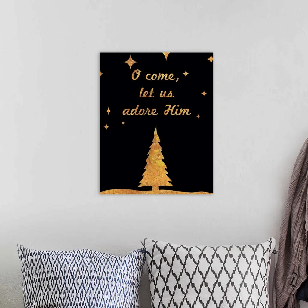 "O Come, Let Us Adore Him" in gold and black.