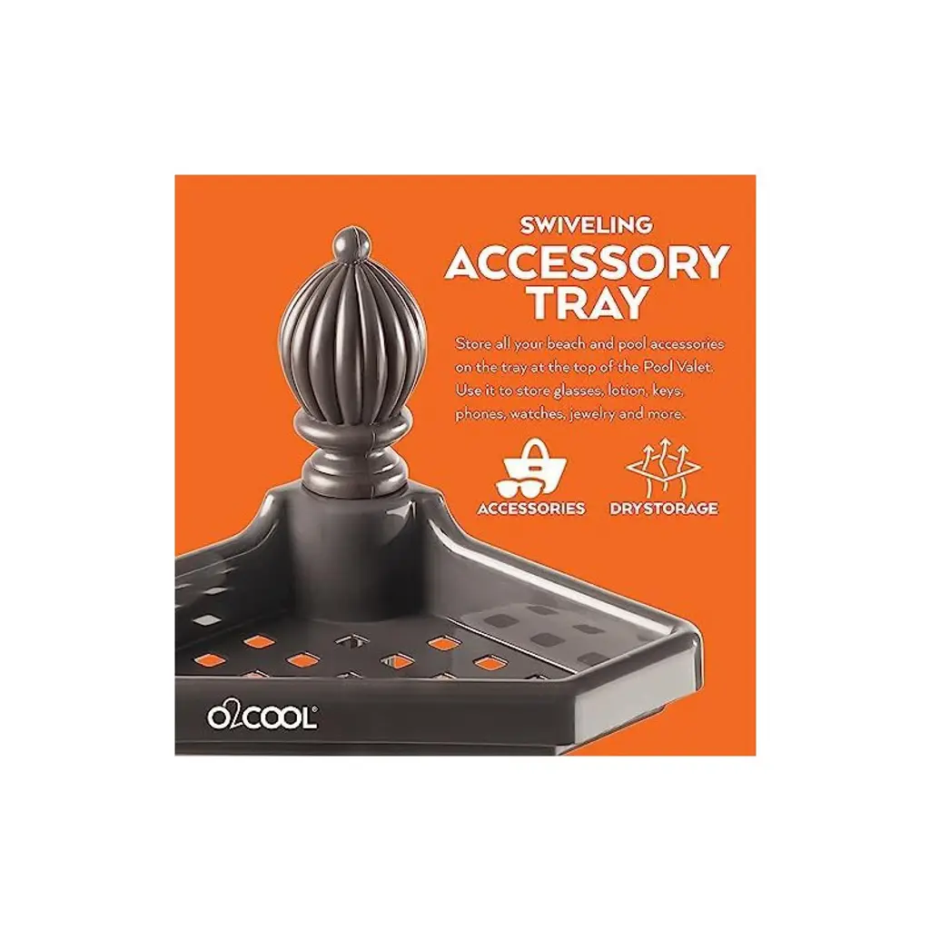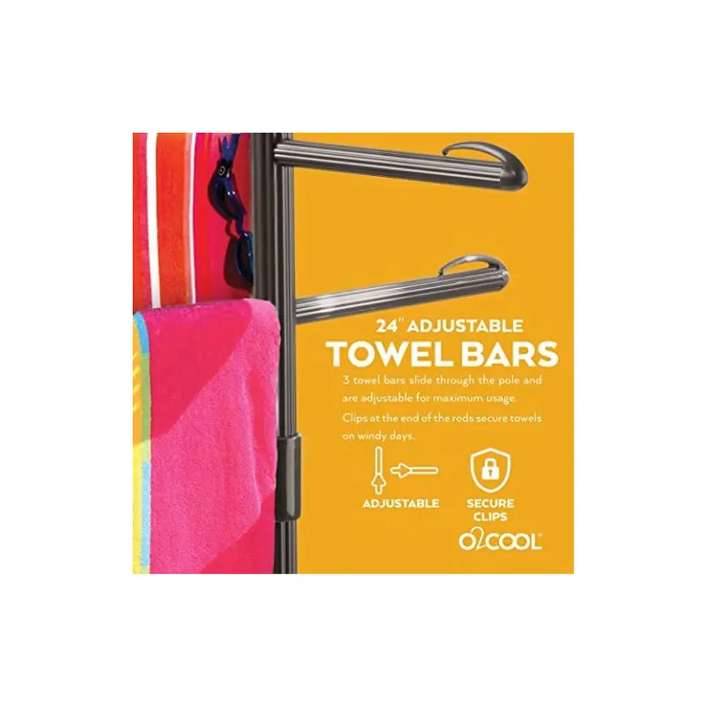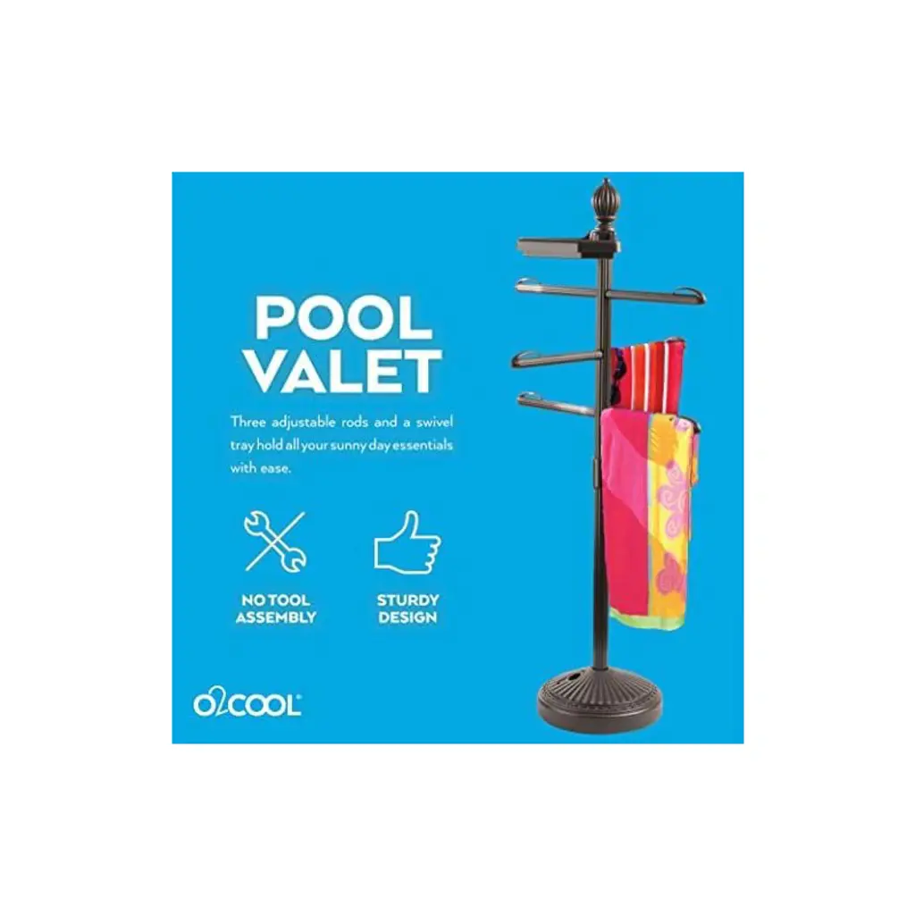 Never worry about wet towels left on the pool side, patio or spa again or dry towels getting soaked! Our O2COOL Bronze Metal Pool & Spa Valet is the perfect poolside companion. This adjustable pool and patio towel holder neatly holds towels, bathing suits and accessories. It also comes with a swivel accessory tray on top which is great for holding sun tan lotion, small misting fans, sunglasses, drinks, and other poolside necessities. The three 24-inch adjustable towel bars provide many options for holding all your wet pool gear or pool toys. Our large towel bar clips in place to securely hold wet or dry towels. The base can be weighted down with sand or water for extra strength and stability. Our Pool & Spa Valet is UV and weather resistant. Available in two colors: white or bronze. Part of our Pool, Patio & Beach offering, be sure to check out our other great O2COOL products including clip-on beverage holders, chaise organizer, and BocaClips!