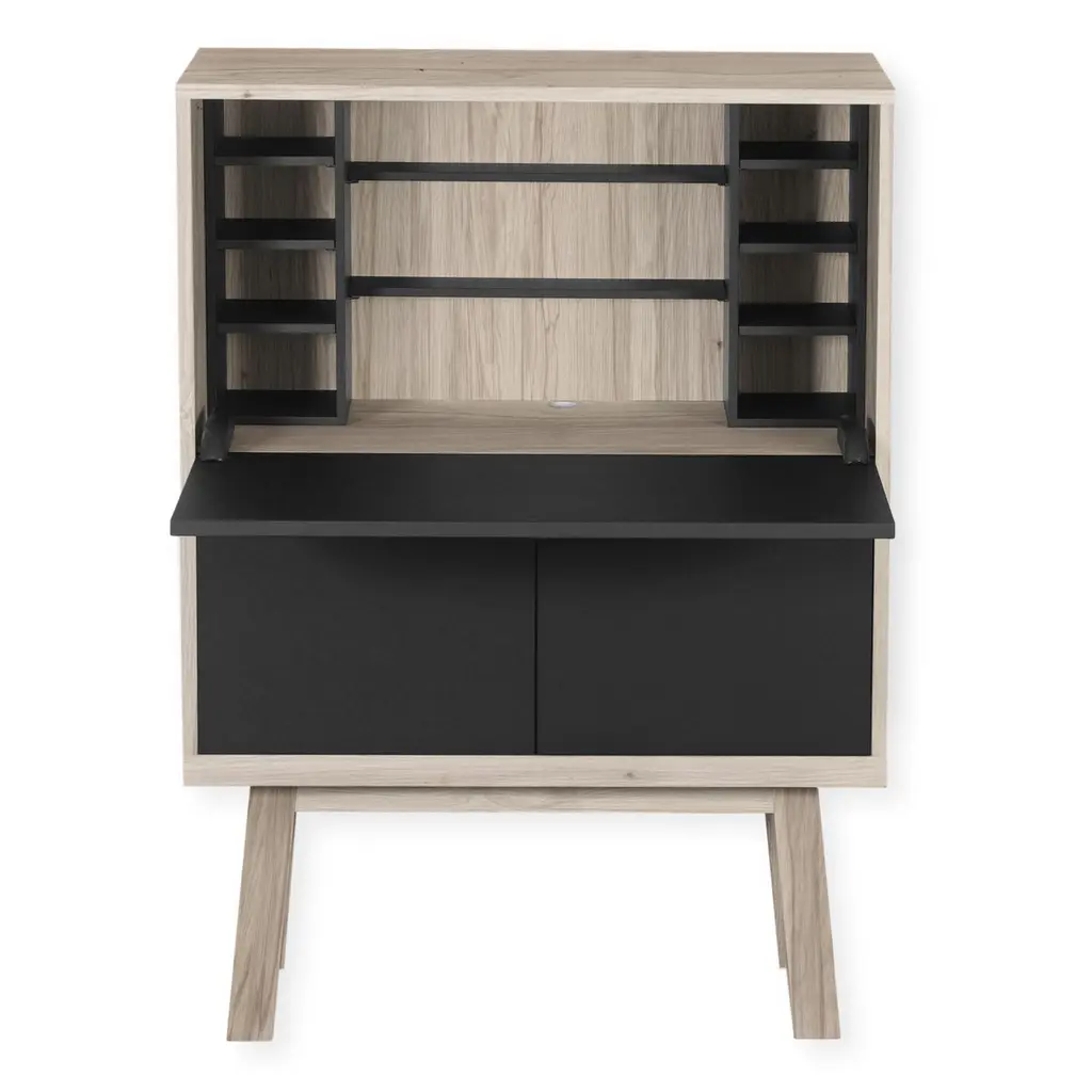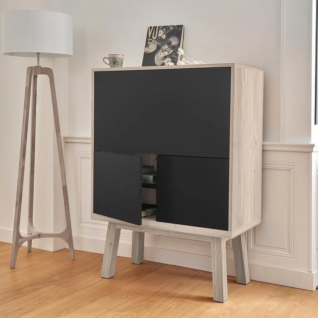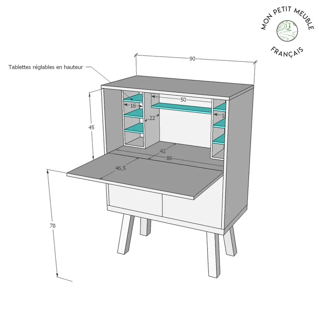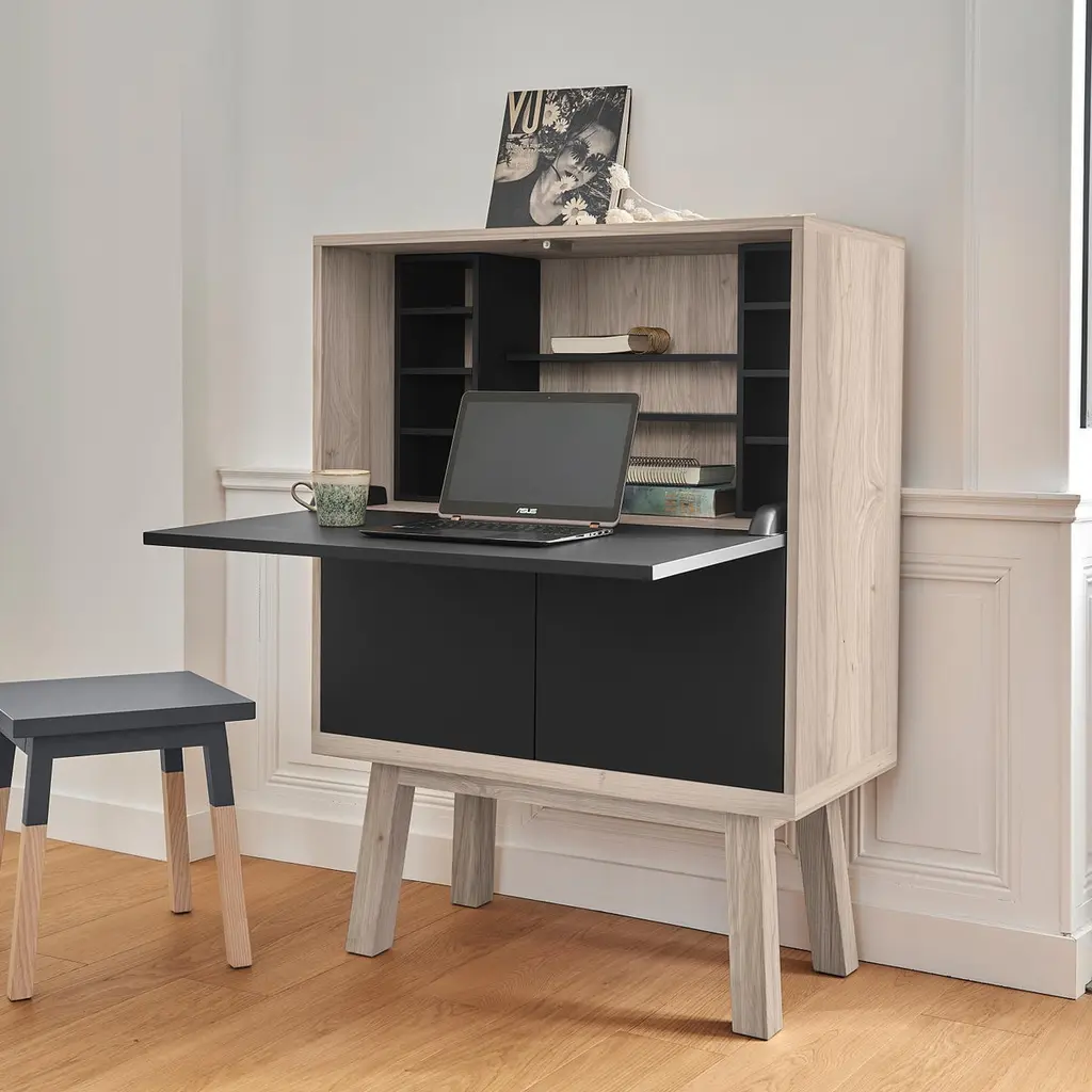 This secretary desk belongs to our ÉGÉE COLLECTION designed by the Parisian designer Eric Gizard. Eric adopts for this collection the refined codes of Scandinavian design, combining natural materials and sobriety of lines and adds very beautiful muted and "trendy" colours.This special edition is made of French oak. You are free to choose another lacquer other than the presented matte black that we display here. We offer 11 standard colours.For all dimensions, we kindly advise to have a look at the scheme with dimensions in the pictureThe dimensions of the box itself are width 90 cm / 35.4'' x height 90 cm / 35.4'' x depth 46 cm / 18;11''Height of the feet is 35 cm / 13.8''Useful height behind the lower hinged doors is 37 cm / 14.6''Overall width of each compartment behind the hinged doors is 42 cm / 16.5'' and useful width is 38 cm / 15.0'' due to the hinges. The vertical interior divider can be moved during the manufacture process to allow the installation of printers with a width> 42 cm / 16.5''.The upper working part is fitted with a flap door on a "push-loose" opening for an efficient work with your laptop and smartphone. The storage space inside the cube and behind the flap is for your screen or to store your paperwork in the removable shelves. The lower part with the 2 hinged doors opens with a "push-to-release" pressure in the middle of the flap. The horizontal 2 shelves are on cleats and removable. The cable passage is made made in the middle of niche behind the flap and at the back of each low removable shelf. MON PETIT MEUBLE FRANÇAISoffers you exlusively 100% French products. The solid wood comes exclusively from sustainably managed and PEFC certified French forests.The manufacture and finishes are of very high-end quality, carried out in workshops in Mayenne, France.