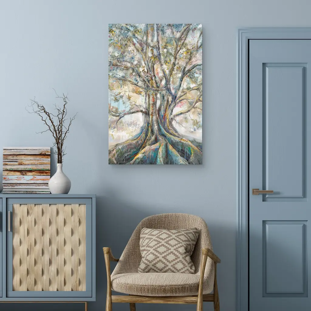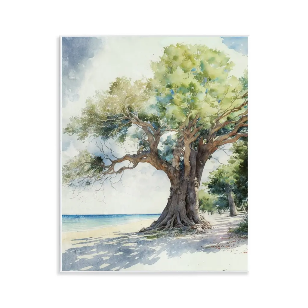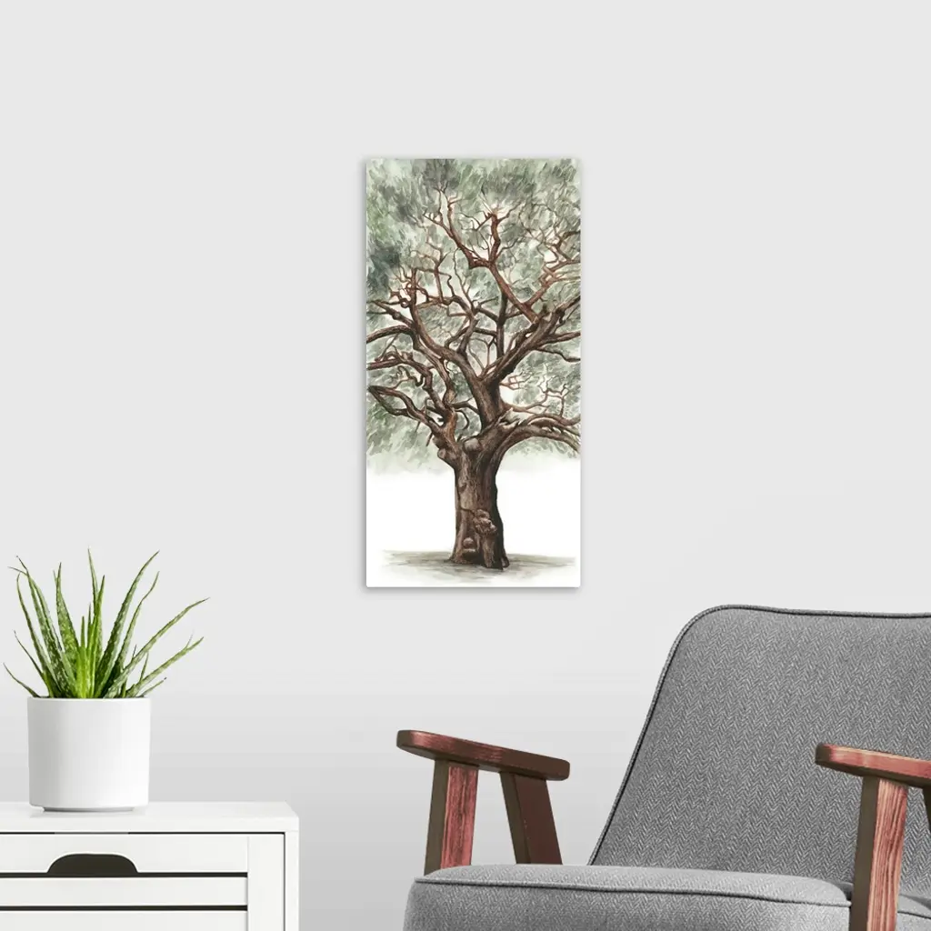 Contemporary illustration of a tall, sturdy oak tree on white.