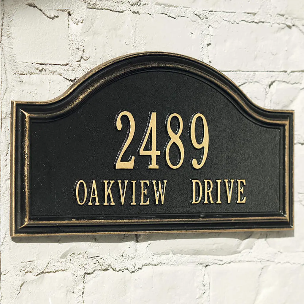 Identify your home in distinguished style with our Oakview Address Plaques. These handsome plaques are crafted of sturdy cast-aluminum to resist weather's worst. Each arching address plaque features a rustproof aluminum casting with a fused powdercoated finish that performs beautifullyPersonalize the standard plaque with up to five 3" numerals on first line and seventeen capitalized 1-1/4" letters on secondPersonalize the estate plaque with up to five 4" numerals on first line and seventeen capitalized 1-3/4" letters on secondIncludes stakes for in-ground installation Please check for accuracy; personalized orders cannot be modified, cancelled, or returned after being placedMade in USA. At Frontgate, our primary focus is quality. We guarantee that every product we sell will stand up to the supreme test – our customers' satisfaction. To learn more about our policies, visit our Shipping & Processing, Returns & Exchanges and Warranty & Price Guarantee pages.