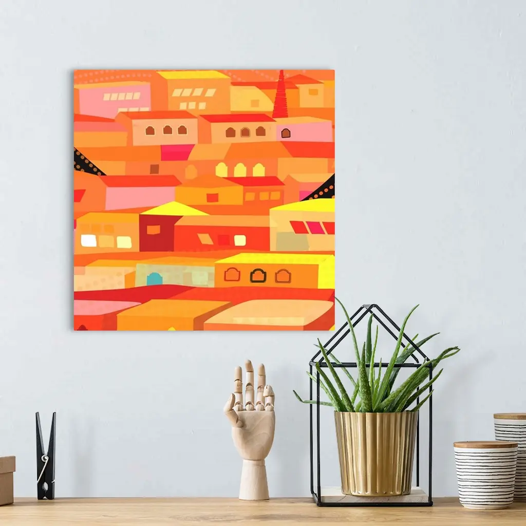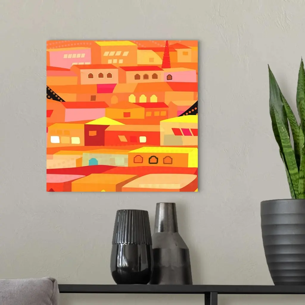 Artistic digital illustration in hues of vibrant orange of a village along a hillside.