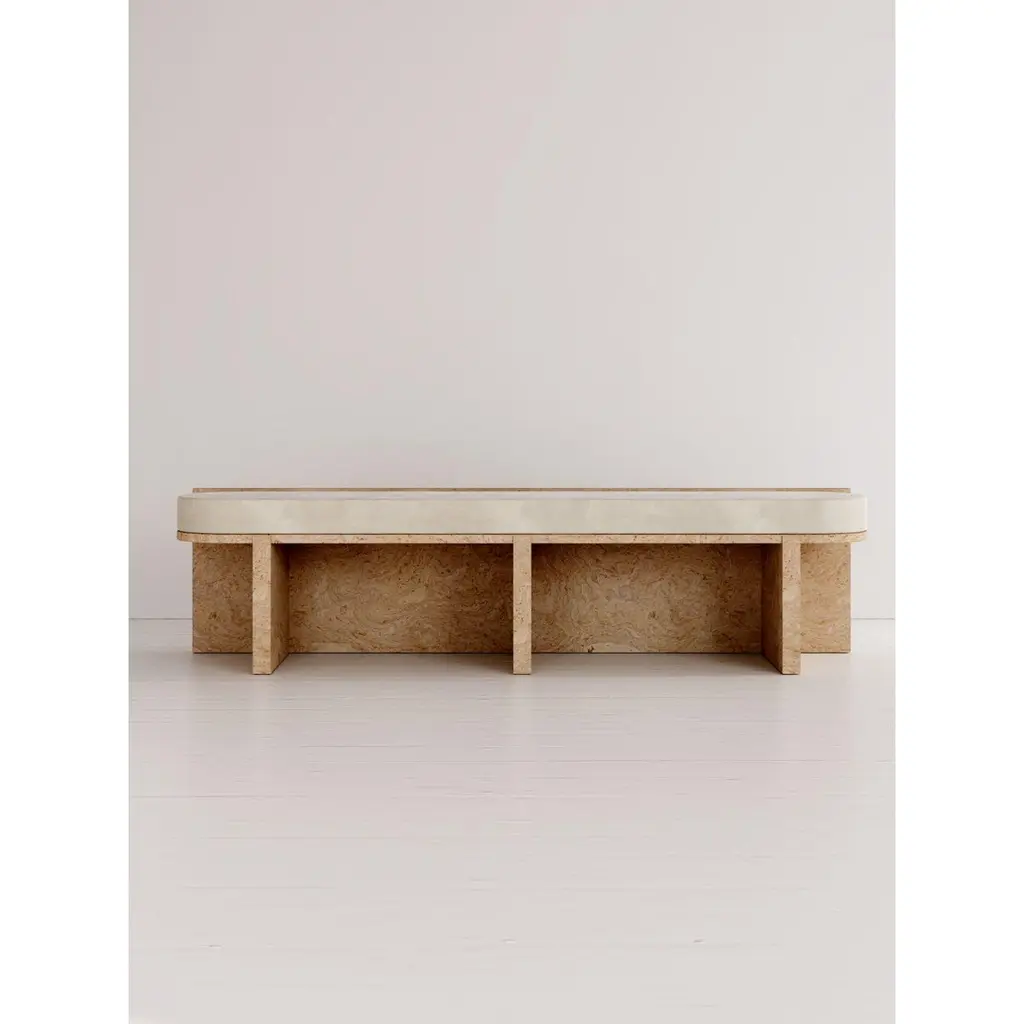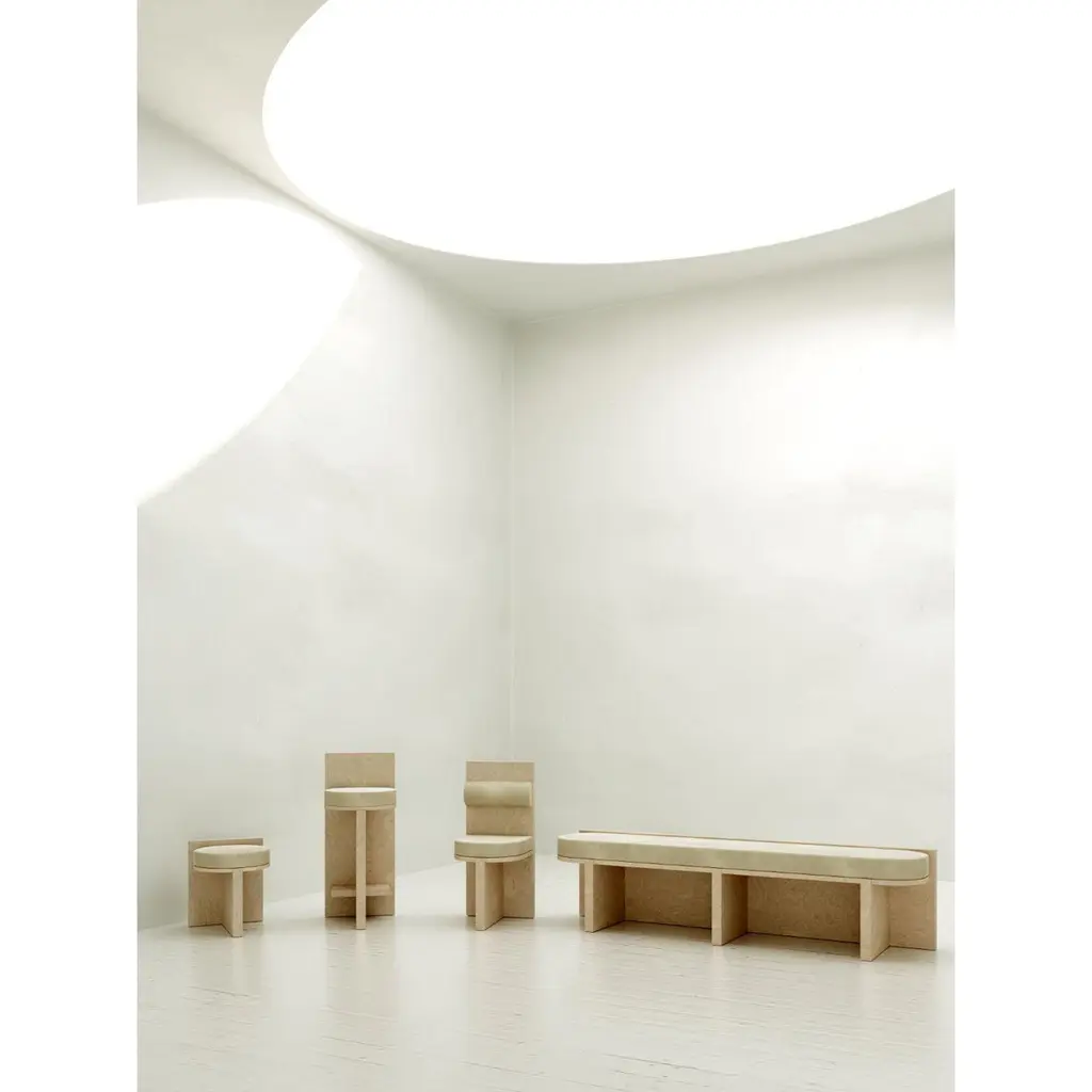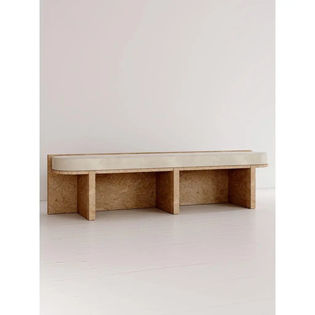 Object 03 beige seating by VoltaDimensions: D 45 x W 200 x H 50 cmMaterials: Cork and VelvetAlso available in diffentent colours. Please contact us.MEÏ COLLECTIONThe Meï collection was born from the desire to highlight the cork material. A material known for its common and popular use, cork deserves special attention in terms of its aesthetic, constructive and ecological properties. Starting from cork, the volta agency has developed with the Trizzano workshops several methods of compression to recycl this material. The patterns that were created then revealed all the subtlety of this material. To sublimate it even more, several colorimetric shades have been developed. The cork is thus bathed and colored, giving it a whole new image.The agencyVolta practices in the fields of architecture and interior design. Created in 2016 by Agathe Lavaud, she articulates her work around attention to detail and a tandem between contemporaneity and tradition. The agency considers each project as unique. She begins a personalized search for each, both in terms of volumes and material, guided by the existing context.