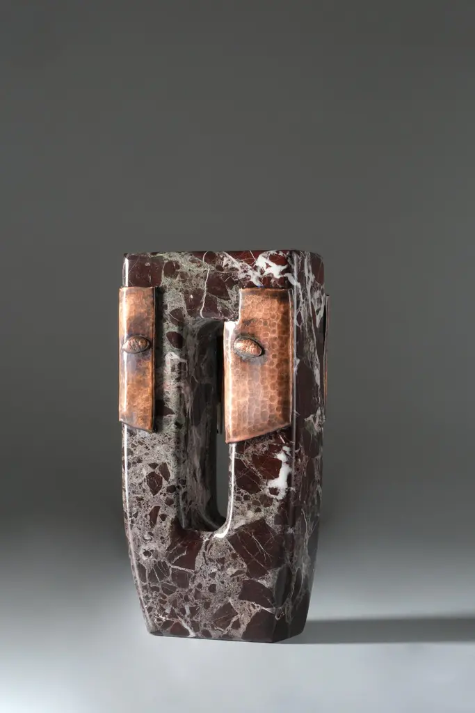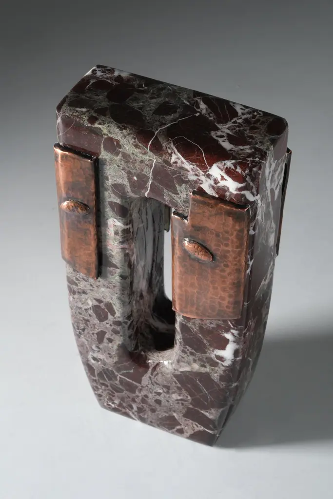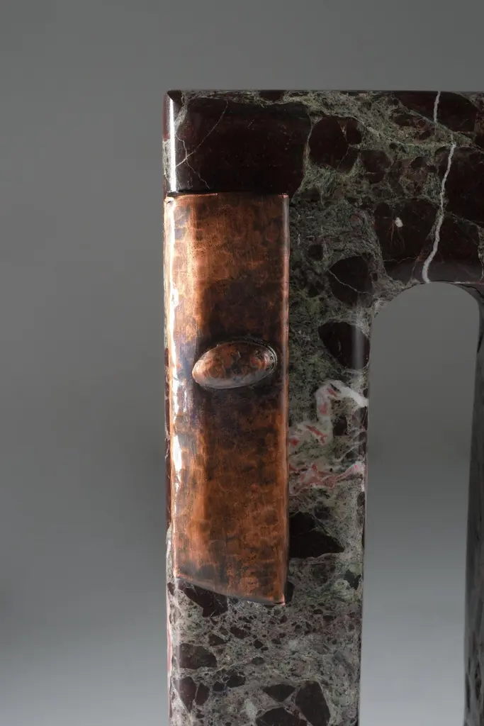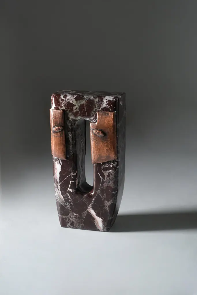 Object C by Ayse Zelal TugrulOne of a KindDimensions: D 7 x W 15 x H 27 cm.Materials: Marble, copper.The letter “C” is inspired by the ancient symbol that was thought to represent the moon in Göbeklitepe, reflecting the lunar cycles.Zelal, born in Diyarbakir, in the ancient lands of the Tigris and Euphrates, received her education in Istanbul, Boston, and Milan. From a background in civil engineering and a master's degree in architecture, she seamlessly transitions into her role as a designer, combining engineering precision with artistic vision. Today, his work draws inspiration from the ancestral heritage of Mesopotamia, where copper and natural stone are central elements. Copper symbolizes the surviving legacy of ancient civilizations and the passage of time, while natural stone embodies the pure elegance of the earth. Through the natural processes of aging and oxidation, each piece acquires a distinctive character, evoking the narrative of evolution. Zelal's work, not aiming to be a historical artifact, represents the search for form within artistic expression.