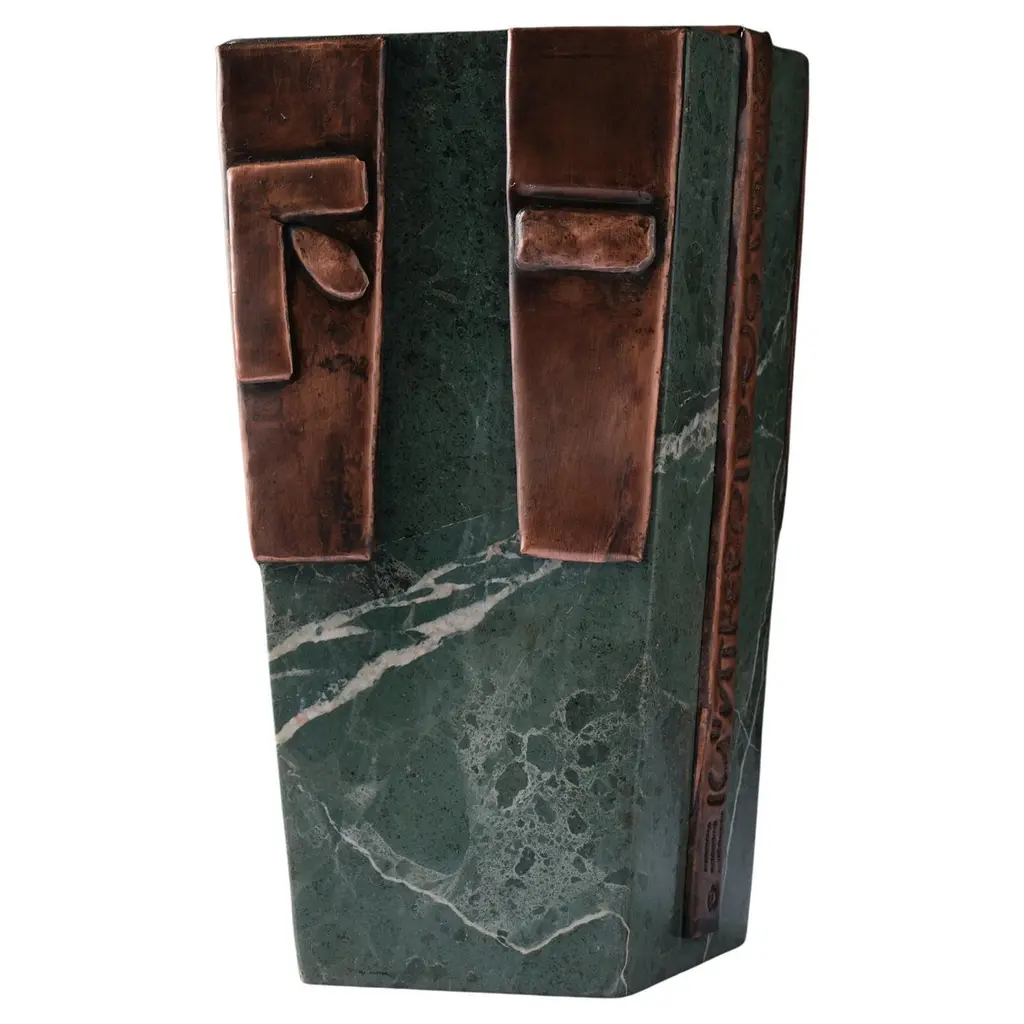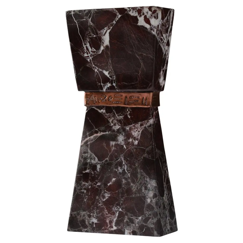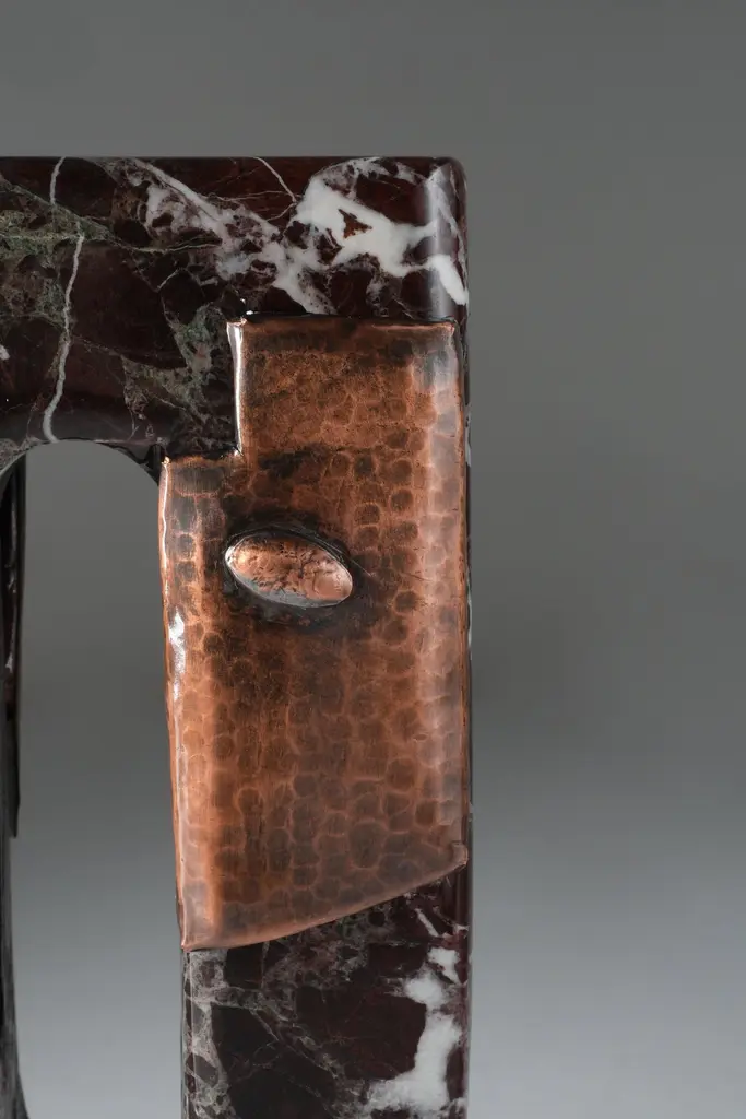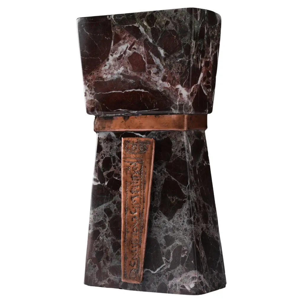 Object C by Ayse Zelal TugrulOne of a KindDimensions: D 7 x W 15 x H 27 cm.Materials: Marble, copper.The letter “C” is inspired by the ancient symbol that was thought to represent the moon in Göbeklitepe, reflecting the lunar cycles.Zelal, born in Diyarbakir, in the ancient lands of the Tigris and Euphrates, received her education in Istanbul, Boston, and Milan. From a background in civil engineering and a master's degree in architecture, she seamlessly transitions into her role as a designer, combining engineering precision with artistic vision. Today, his work draws inspiration from the ancestral heritage of Mesopotamia, where copper and natural stone are central elements. Copper symbolizes the surviving legacy of ancient civilizations and the passage of time, while natural stone embodies the pure elegance of the earth. Through the natural processes of aging and oxidation, each piece acquires a distinctive character, evoking the narrative of evolution. Zelal's work, not aiming to be a historical artifact, represents the search for form within artistic expression.