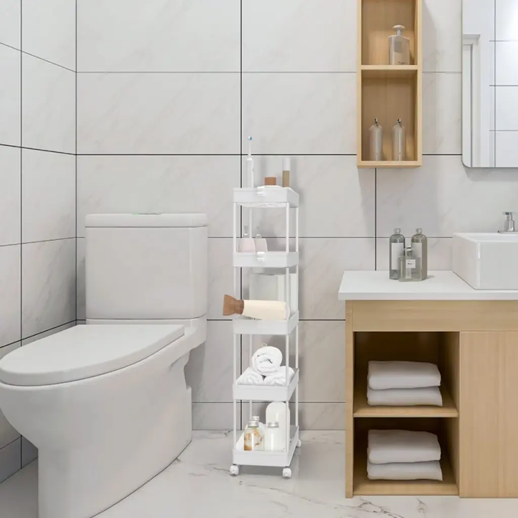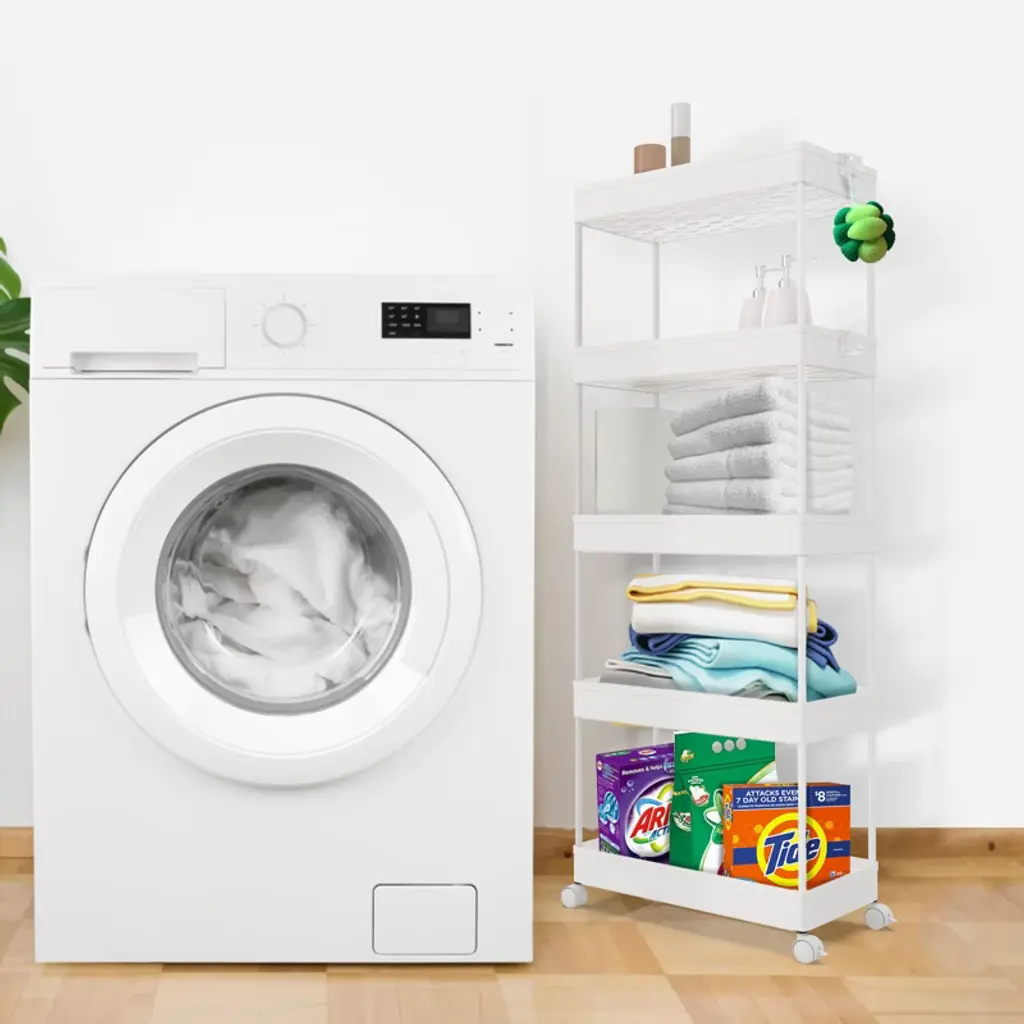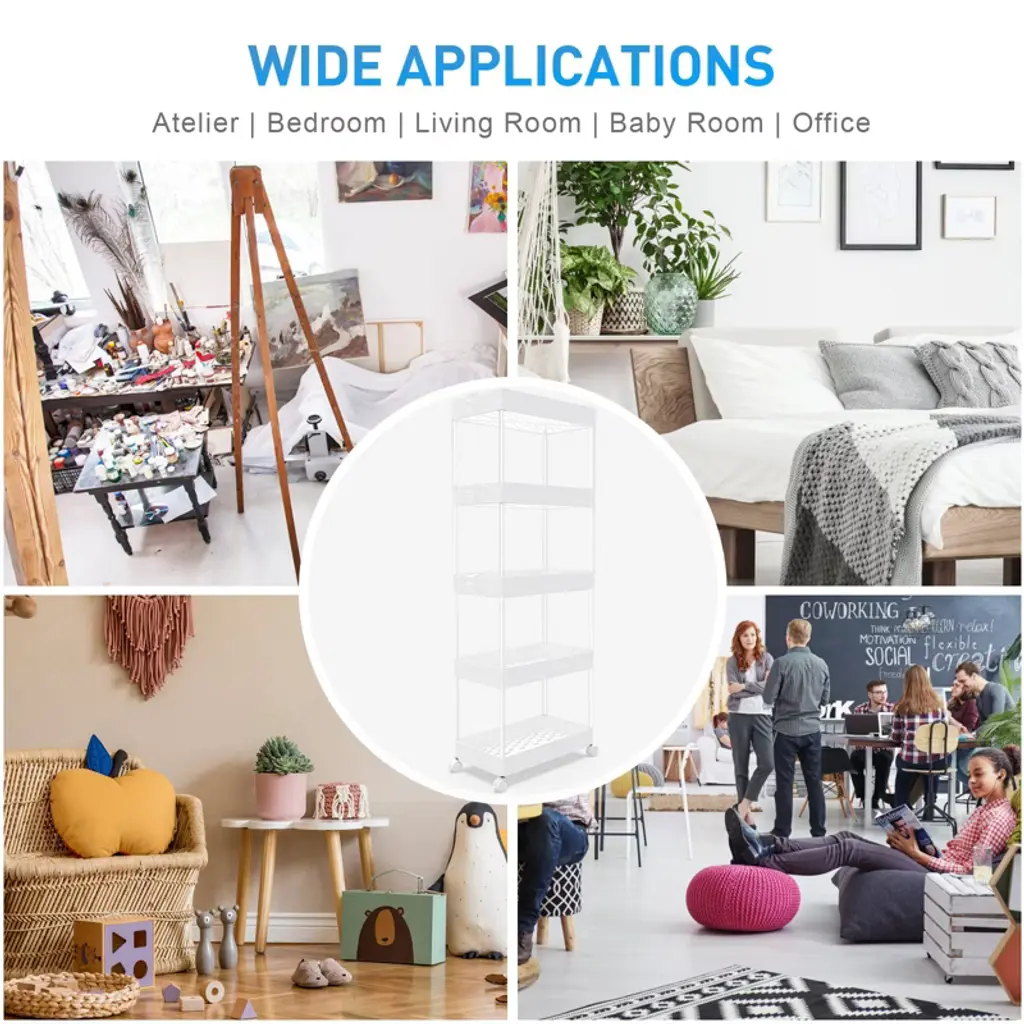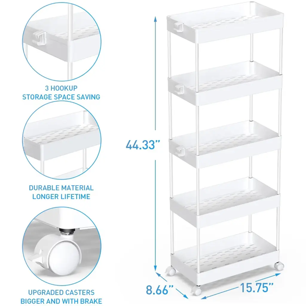 The 5-tier Rolling storage utility cart is 8.66 in design which can be used in tight spaces in your home for storage. Suitable for closets, kitchens, bathrooms, garages, laundry rooms, offices.