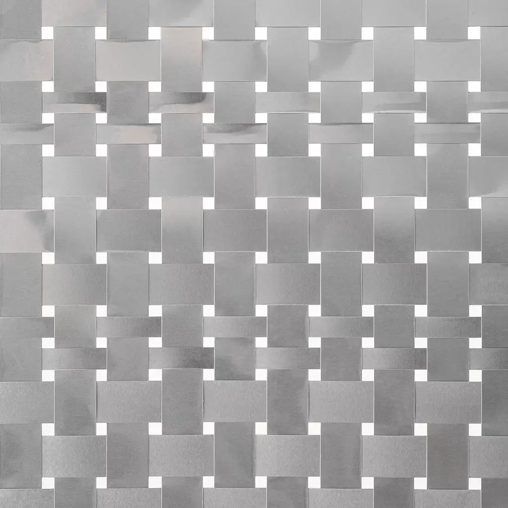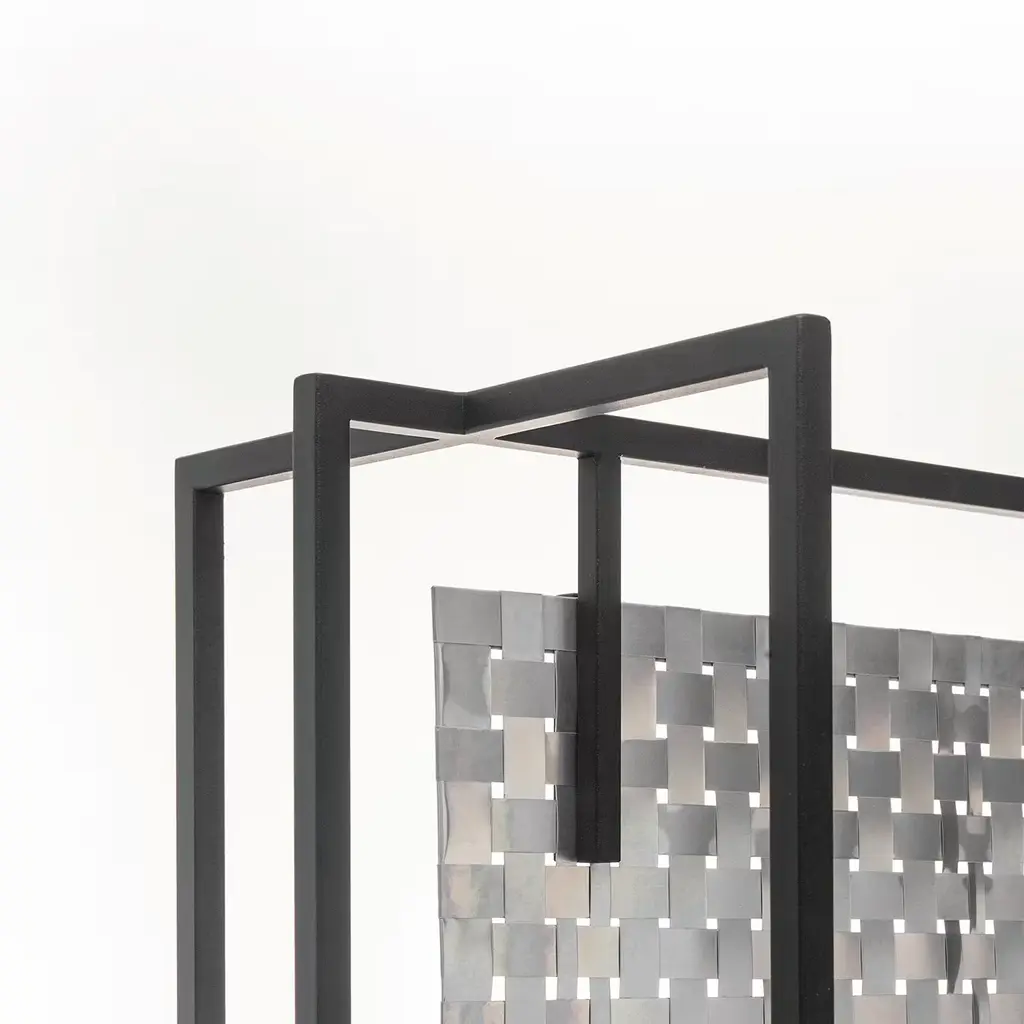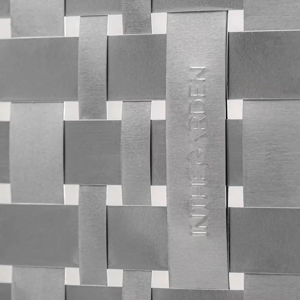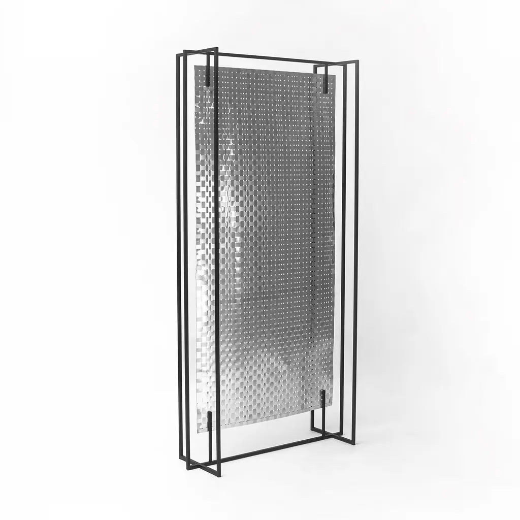 This dual-function floor panel can be used as a room divider or decorative backdrop. Its hand-woven aluminum-foil canvas features one opaque side, and the other with a slightly reflective surface in champagne-gold. Its thin, geometric structure is painted in black, which frames the piece with an exclusive touch. Made from recycled aluminum generated from industrial waste.