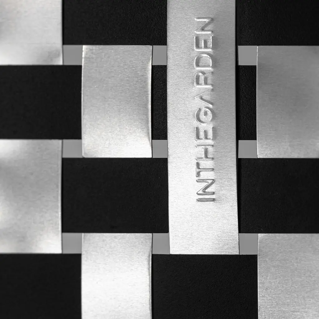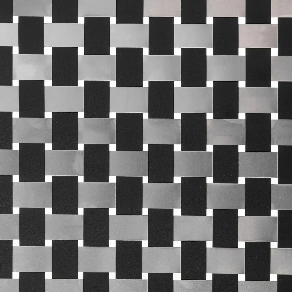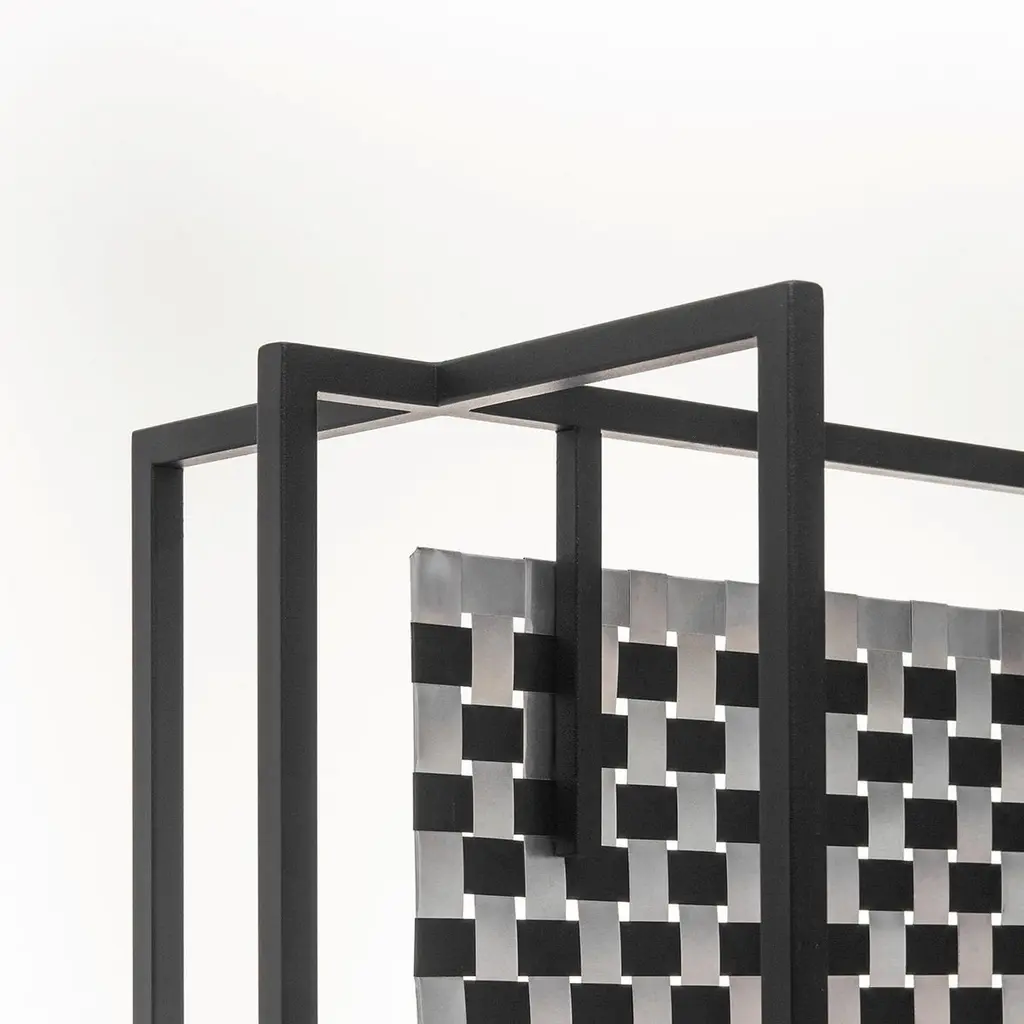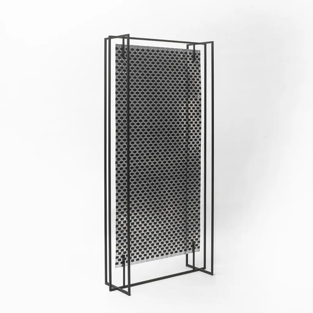 This versatile, double-sided floor panel can be used in the middle of a room to divide a space, as well as a decorative backdrop when placed against a wall. Its 60s-style, Op-Art design is achieved through weaving black and natural aluminum foil into its canvas. All aluminum was recovered from industrial waste.