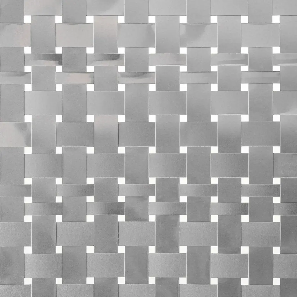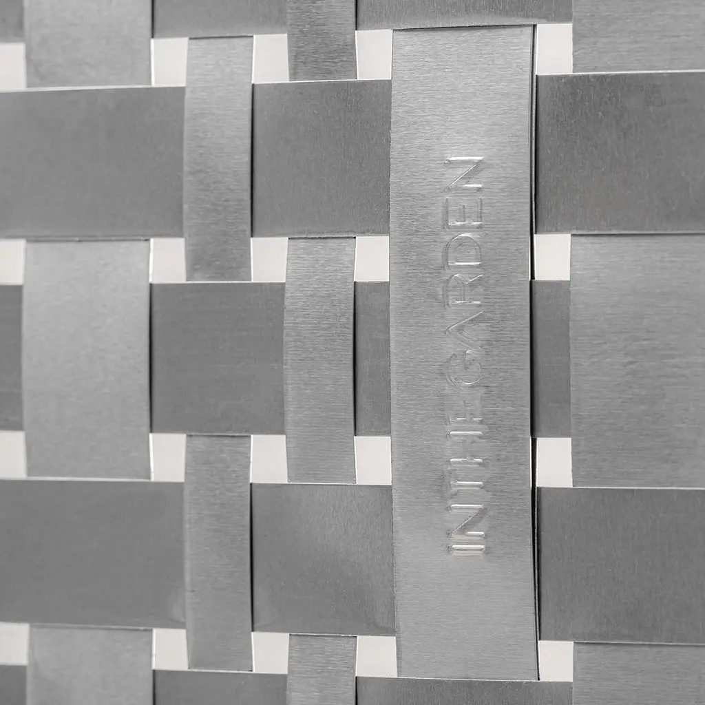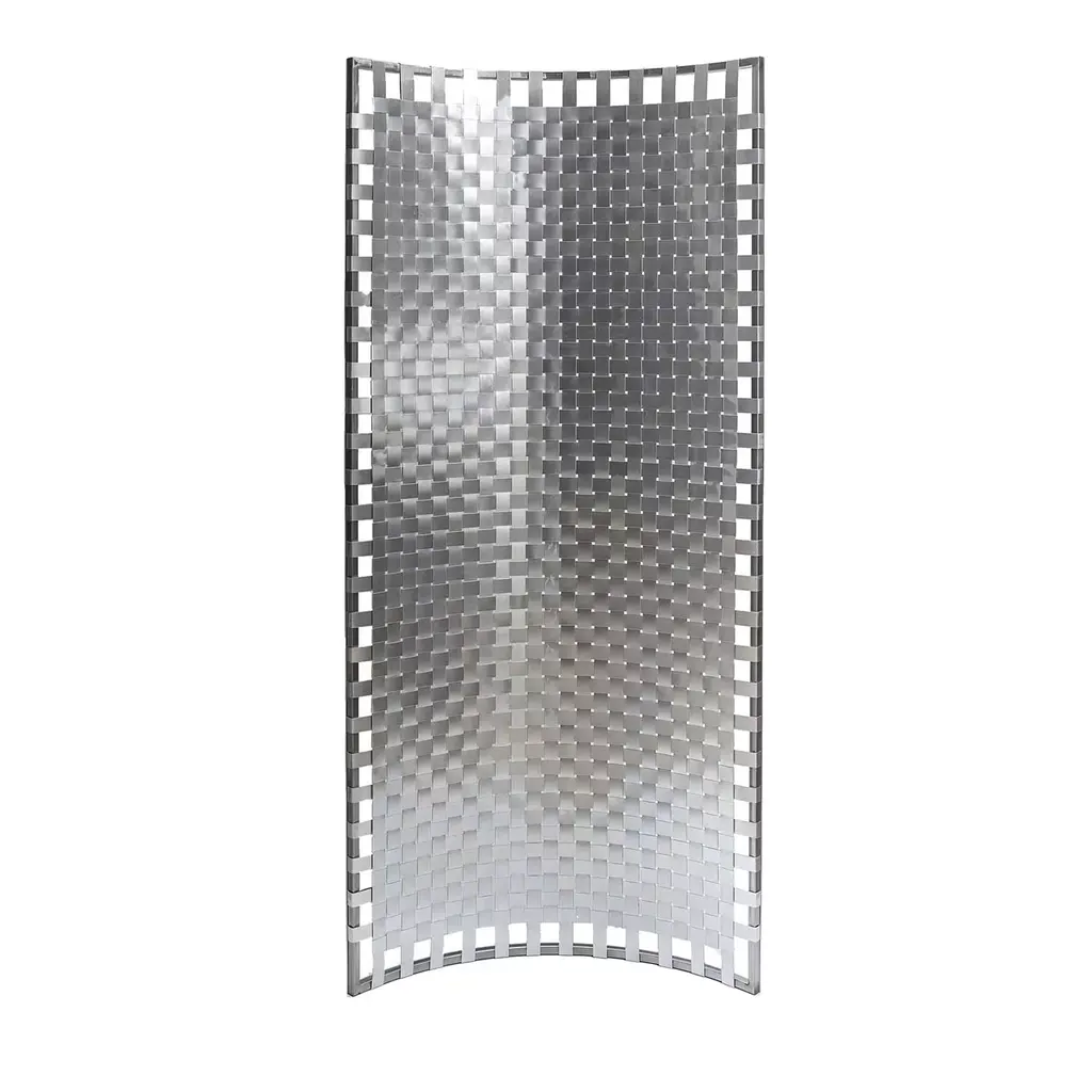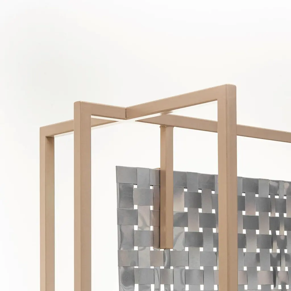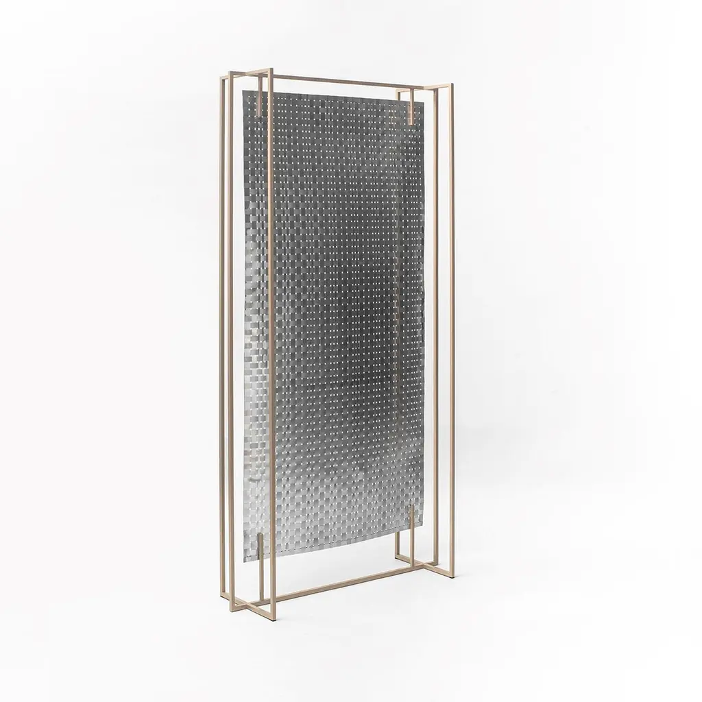 This dual-purpose floor panel can be placed in the middle of a space as a room divider, as well as being placed against the wall as a decorative backdrop. Its handwoven canvas includes aluminum foil, which gives one side a lustrous, reflective sheen, while the other has an opaque finish in champagne-gold. A thin, gold-colored, iron frame completes the look.