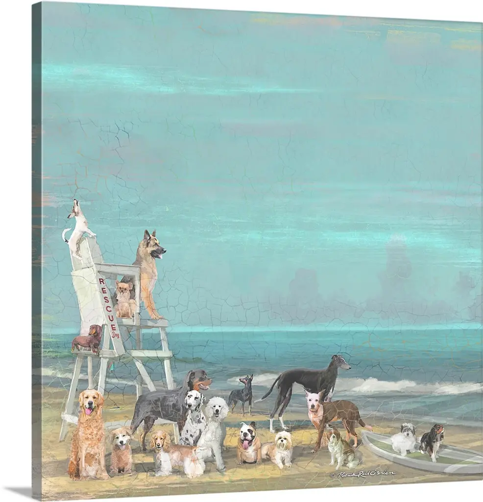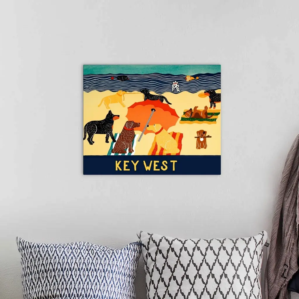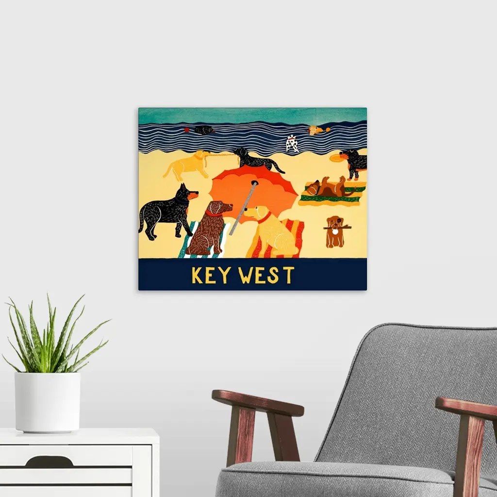 Illustration of multiple breeds of dogs having a beach day with "Key West" written on the bottom.