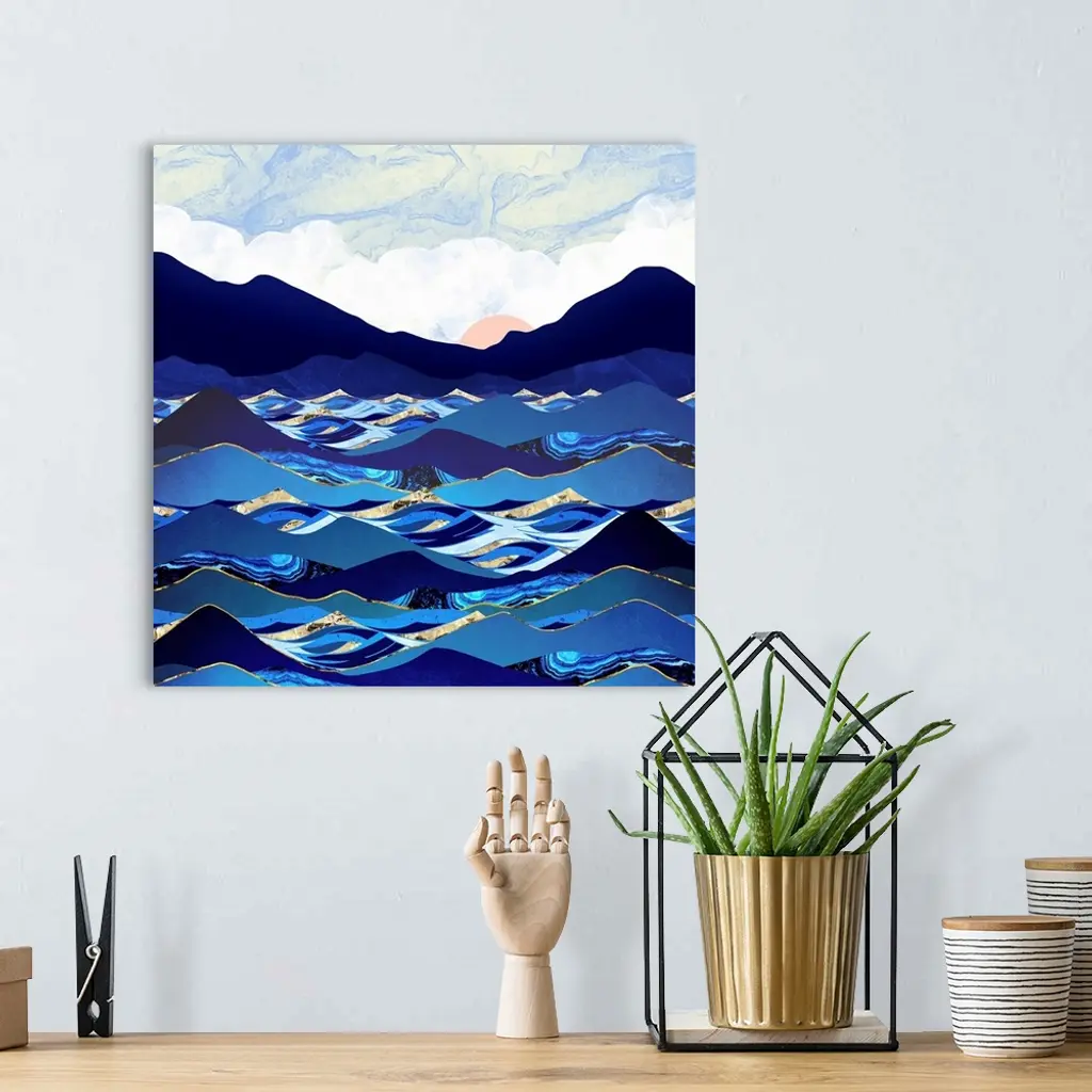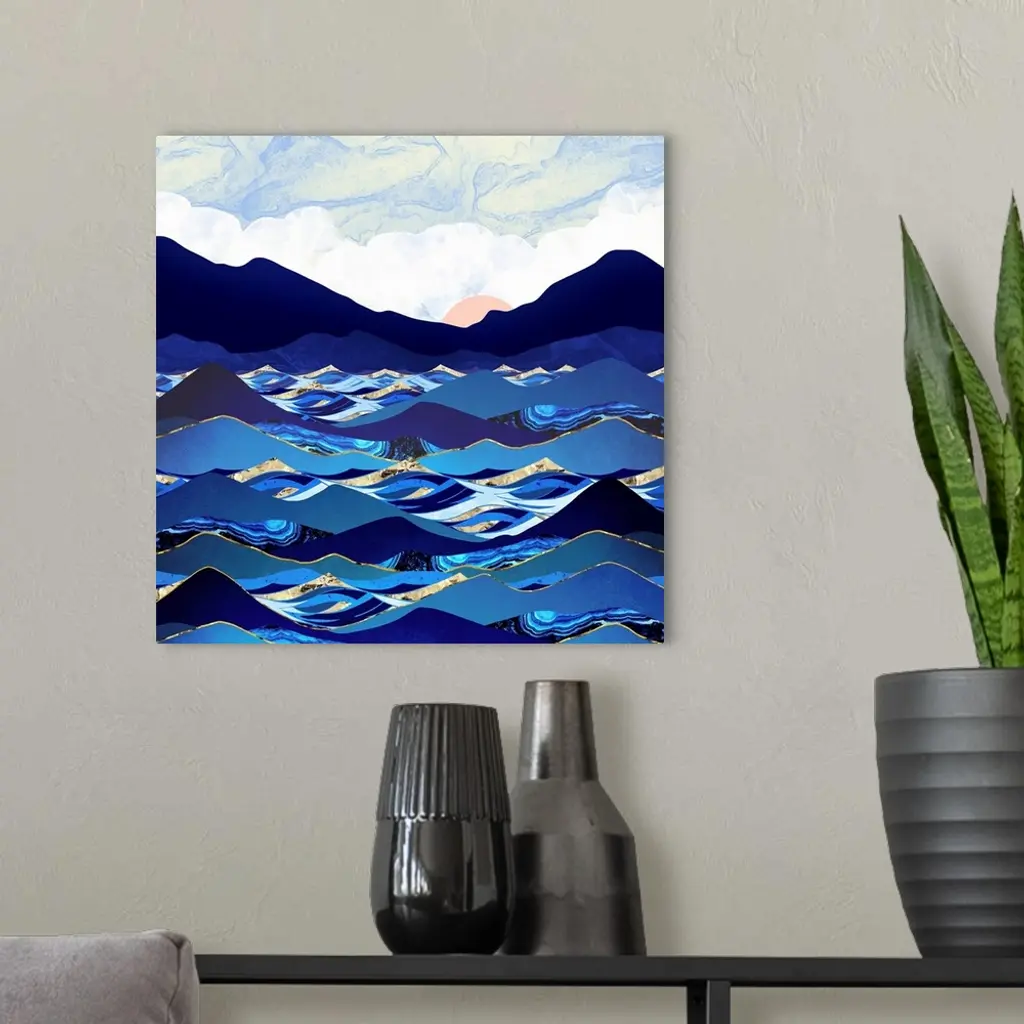 Abstract depiction of the ocean with waves, cobalt, blue, gold and pink.