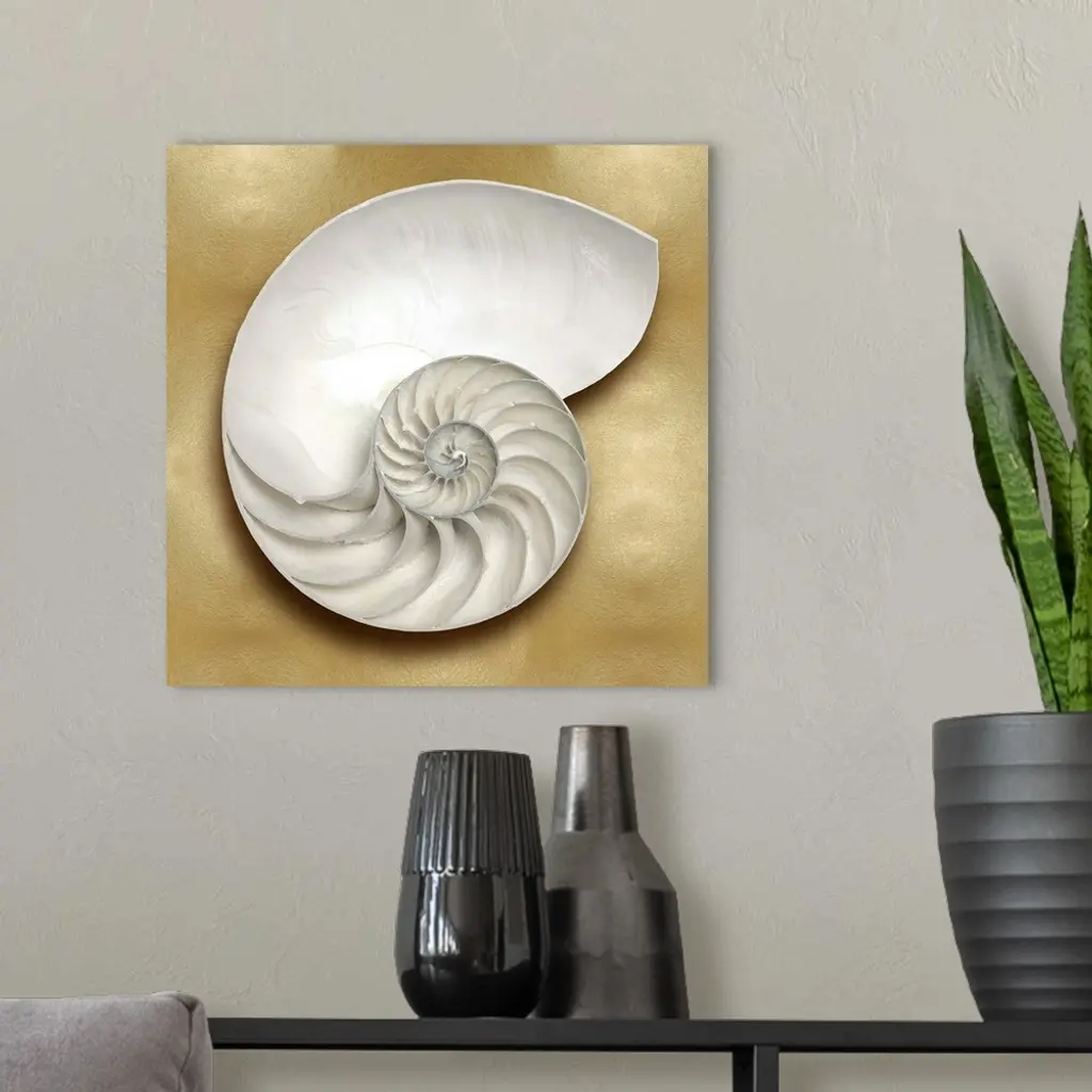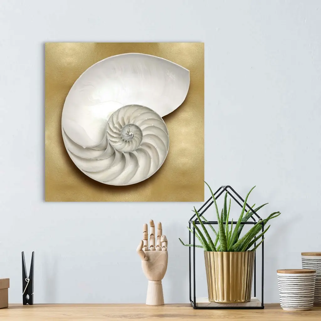 Square beach decor with a nautilus shell on a gold background.