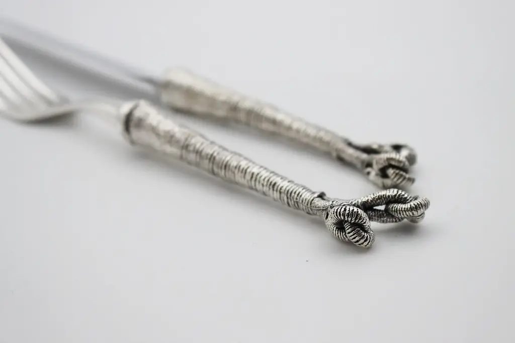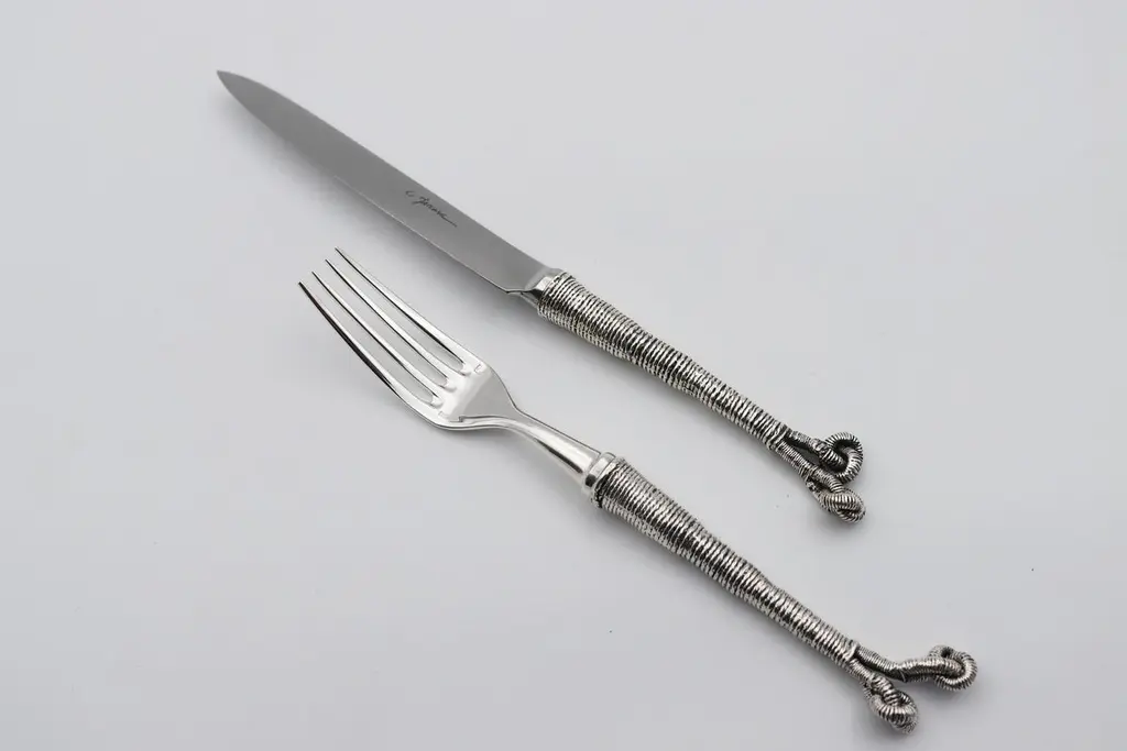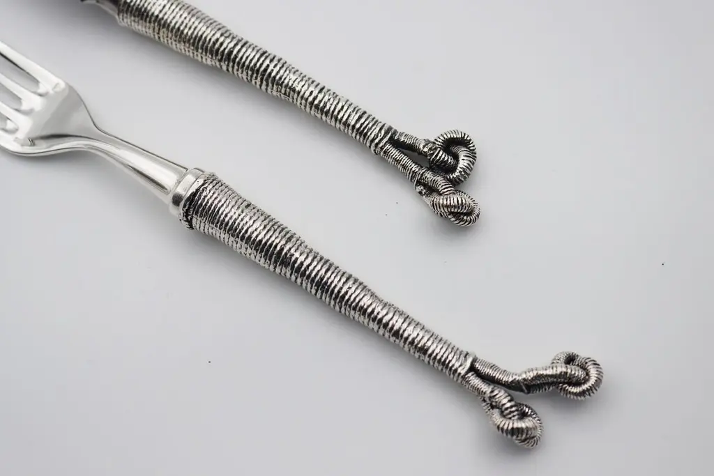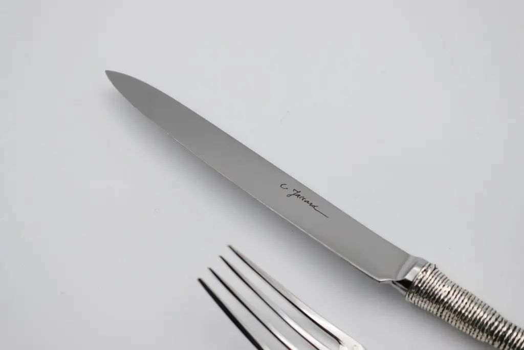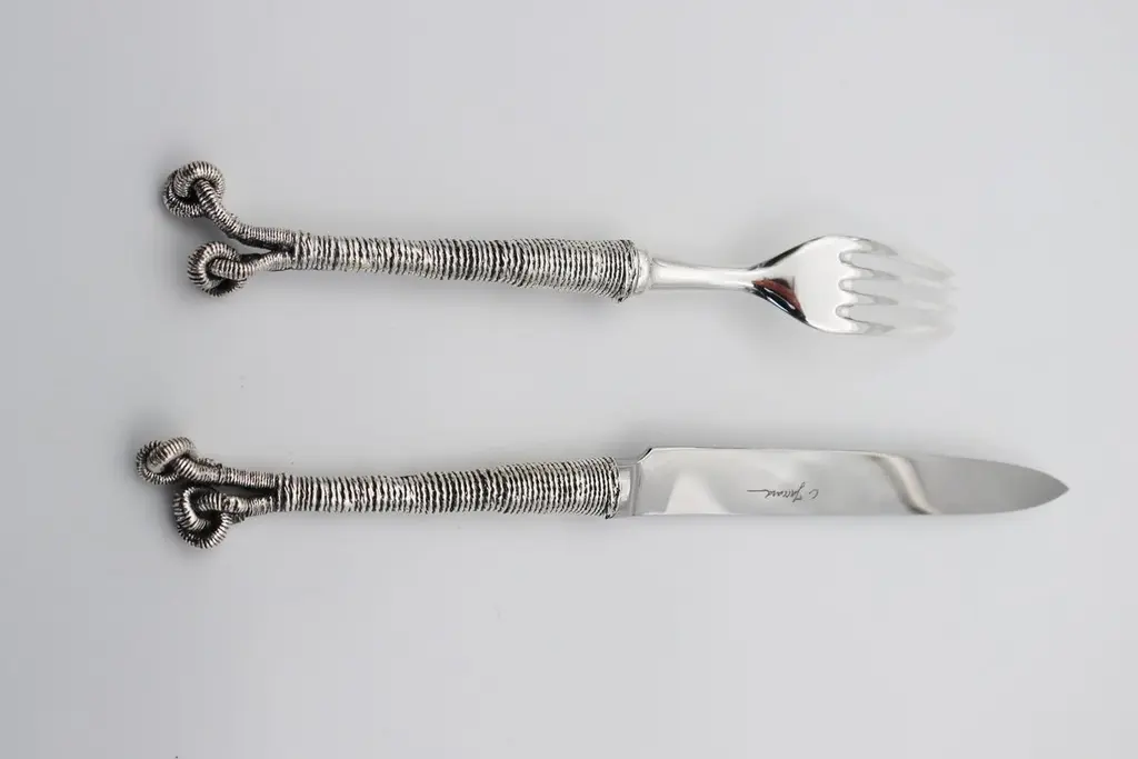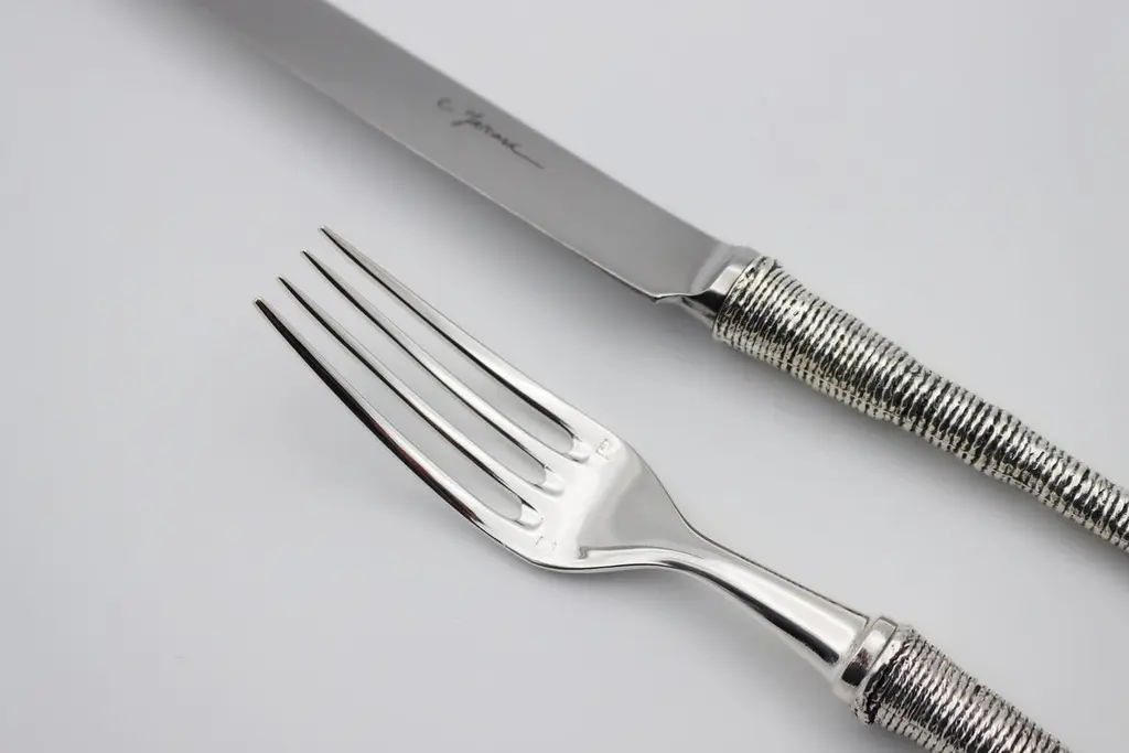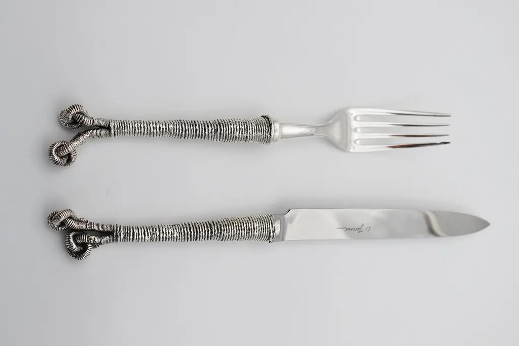 Set of 2 pieces in Silver Bronze or Gold BronzeSet of 2 pieces (table forks/fish, table knife or meat/fish knife) in silver bronze 35/42 micronsIt is possible to order all products separately or set of 4 pieceTable spoonTable forkTable knife/meat knifeFish knifeFish forkDessert/cake/juice/tea-coffee spoonDessert forkDessert knifeThese pieces are the handmade work of French designer Richard Lauret.These pieces are unique OR made to order.The products can be personalised with customised engraving (price on quotation).In the same collection are presented SERVICE PIECES, TABLE ACCESSORIES, INDIVIDUAL COVERS