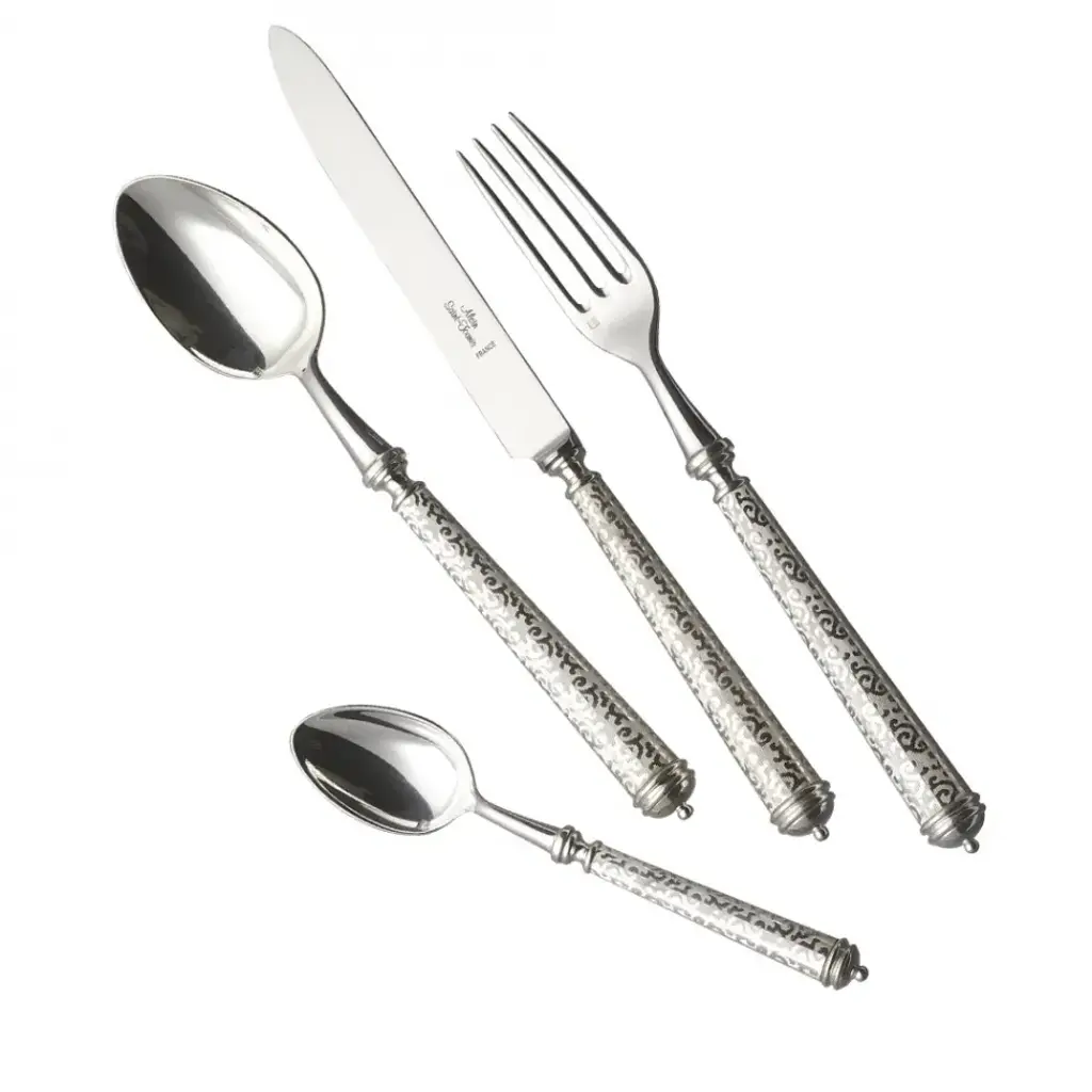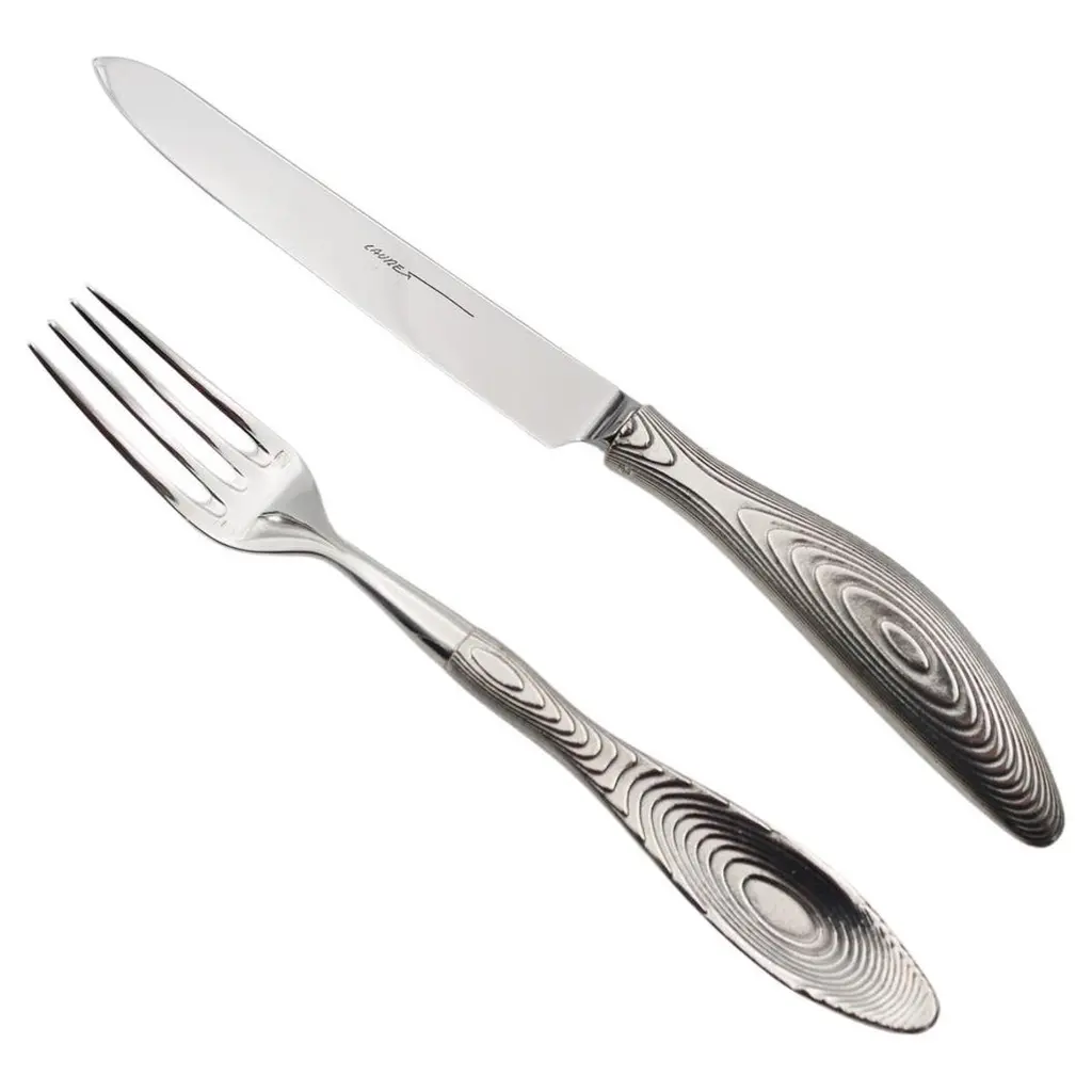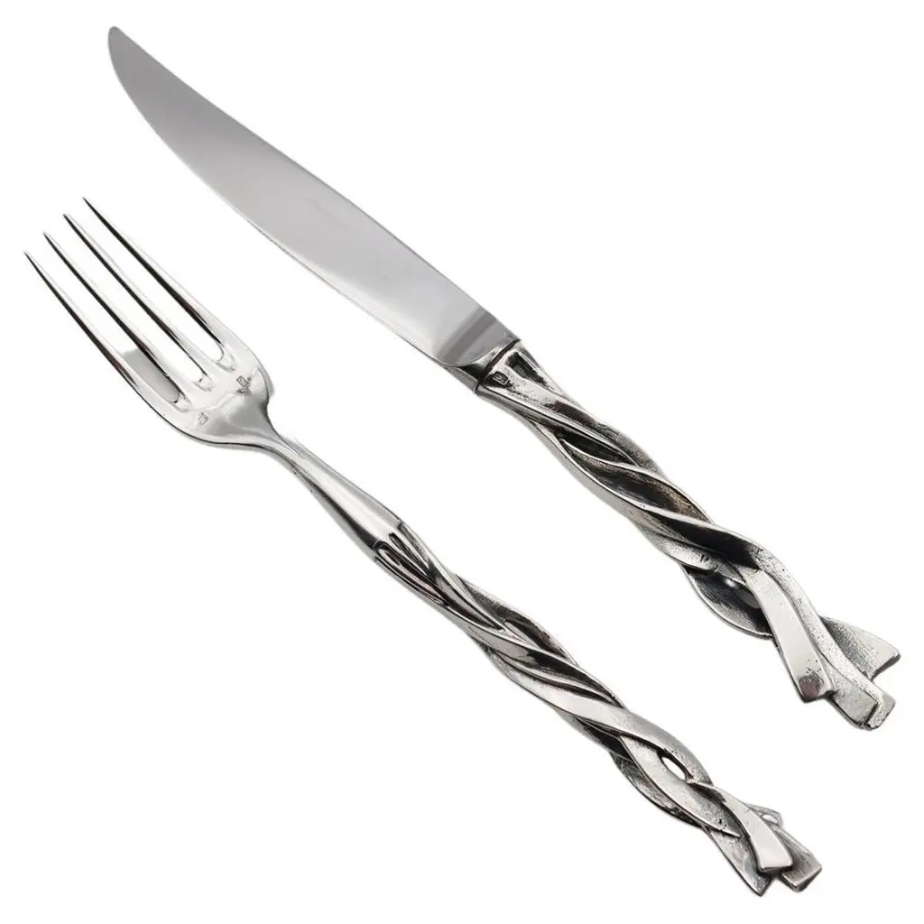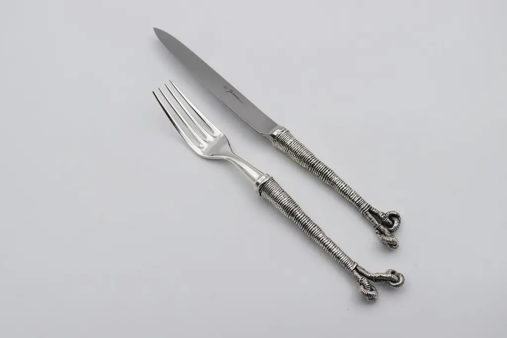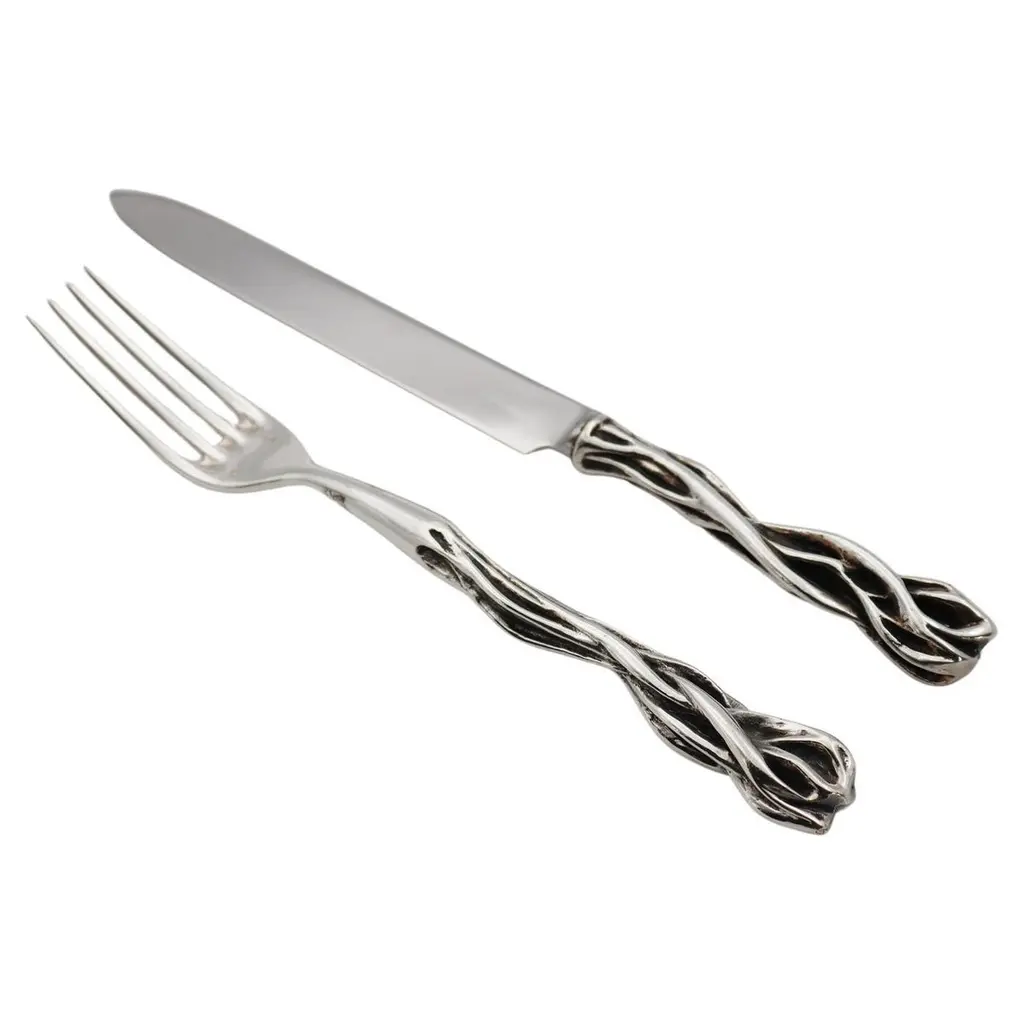 Set of 2 pieces in Silver Bronze or Gold BronzeSet of 2 pieces (table forks/fish, table knife or meat/fish knife) in silver bronze 35/42 micronsIt is possible to order all products separately or set of 4 pieceTable spoonTable forkTable knife/meat knifeFish knifeFish forkDessert/cake/juice/tea-coffee spoonDessert forkDessert knifeThese pieces are the handmade work of French designer Richard Lauret.These pieces are unique OR made to order.The products can be personalised with customised engraving (price on quotation).In the same collection are presented SERVICE PIECES, TABLE ACCESSORIES, INDIVIDUAL COVERS