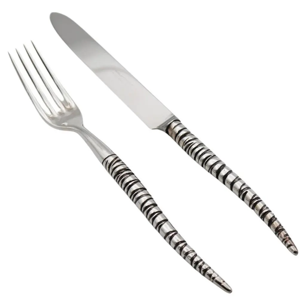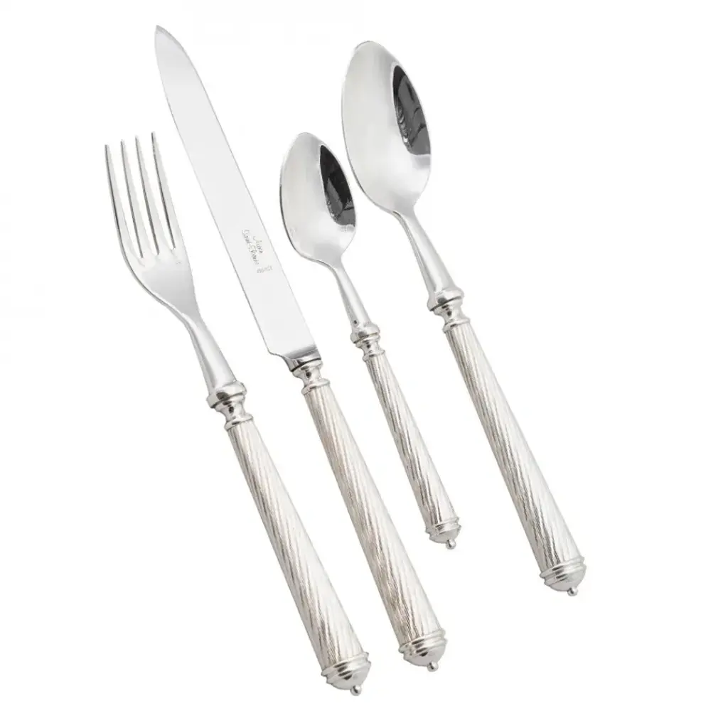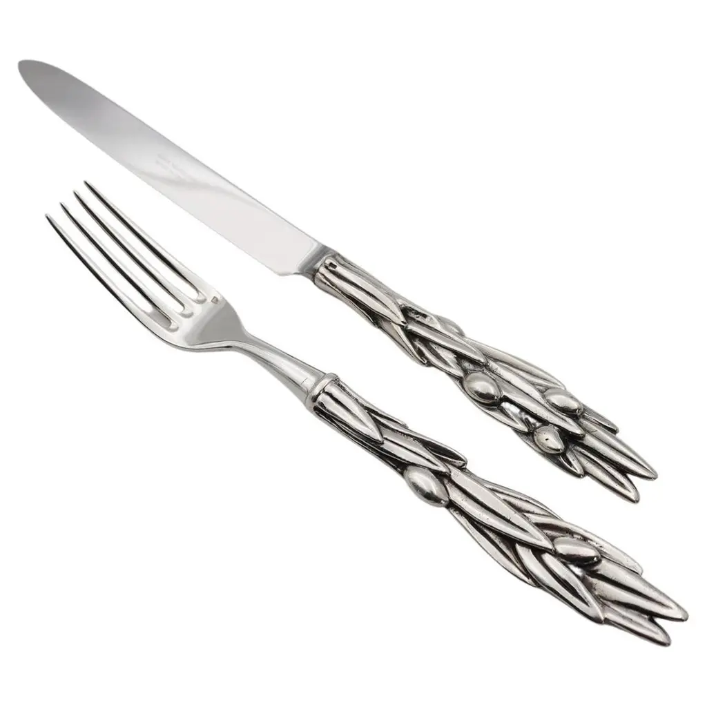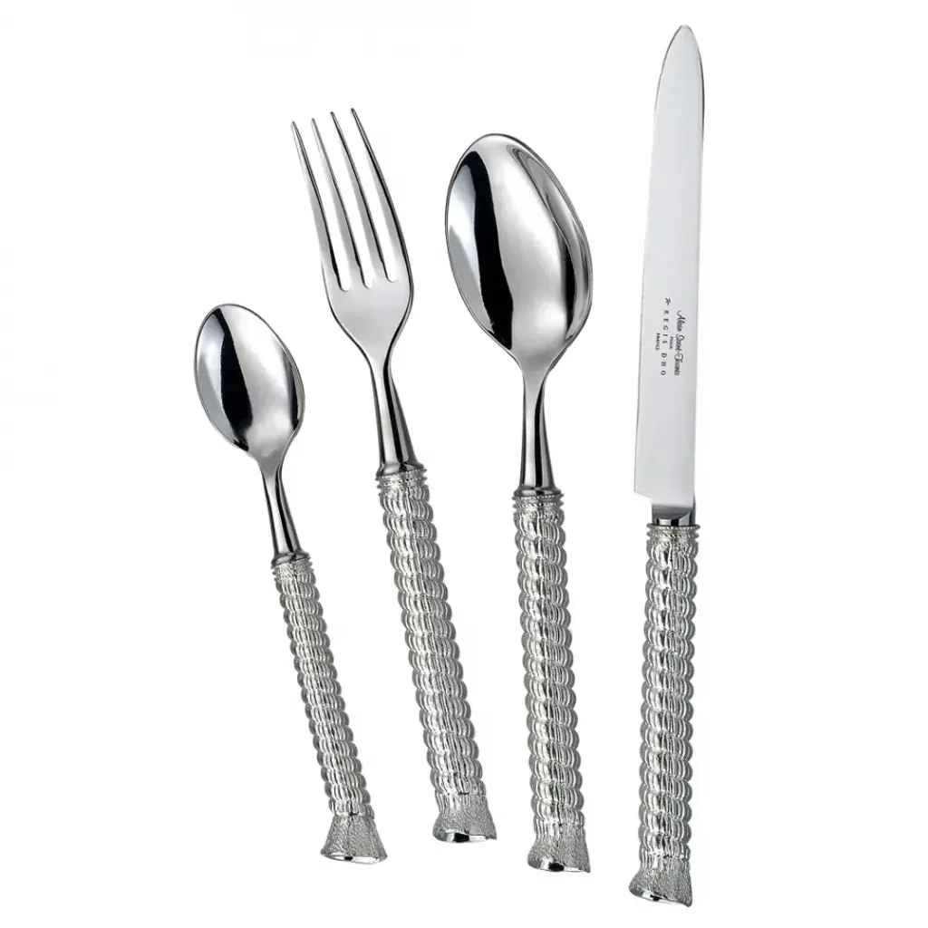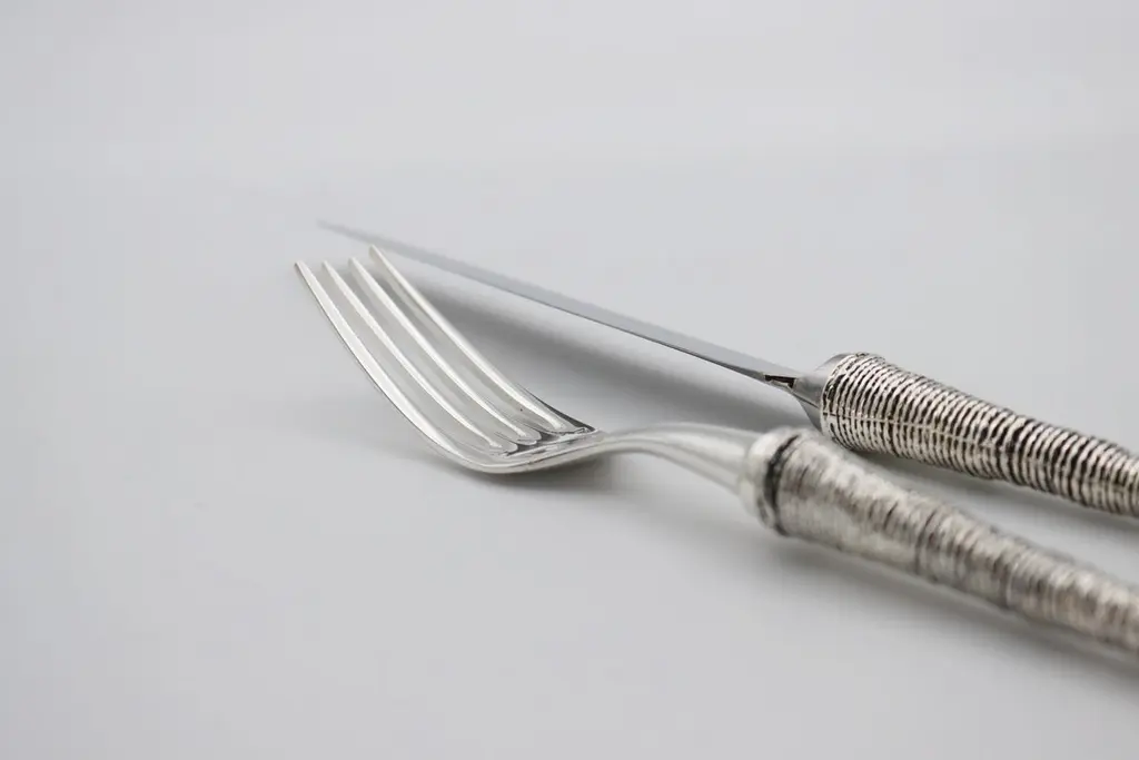 Set of 2 pieces in Silver Bronze or Gold BronzeSet of 2 pieces (table forks/fish, table knife or meat/fish knife) in silver bronze 35/42 micronsIt is possible to order all products separately or set of 4 pieceTable spoonTable forkTable knife/meat knifeFish knifeFish forkDessert/cake/juice/tea-coffee spoonDessert forkDessert knifeThese pieces are the handmade work of French designer Richard Lauret.These pieces are unique OR made to order.The products can be personalised with customised engraving (price on quotation).In the same collection are presented SERVICE PIECES, TABLE ACCESSORIES, INDIVIDUAL COVERS