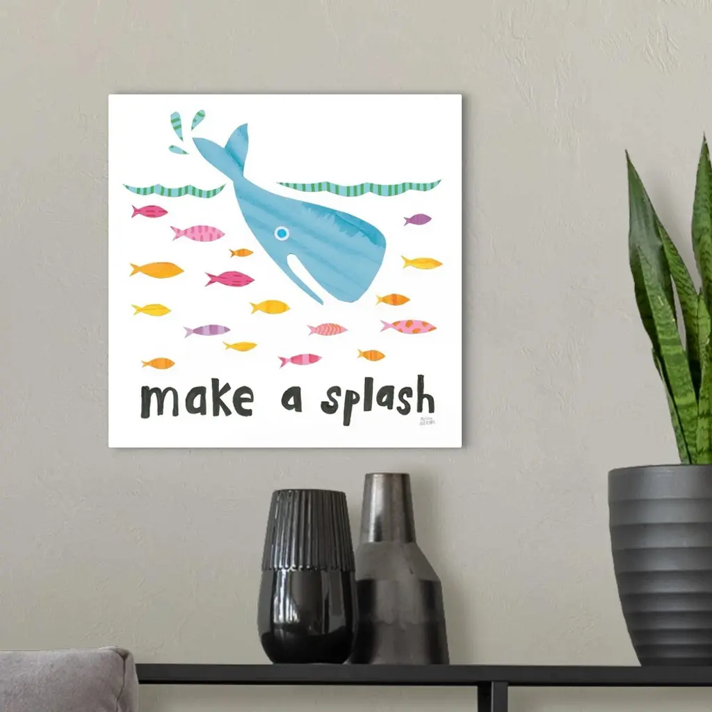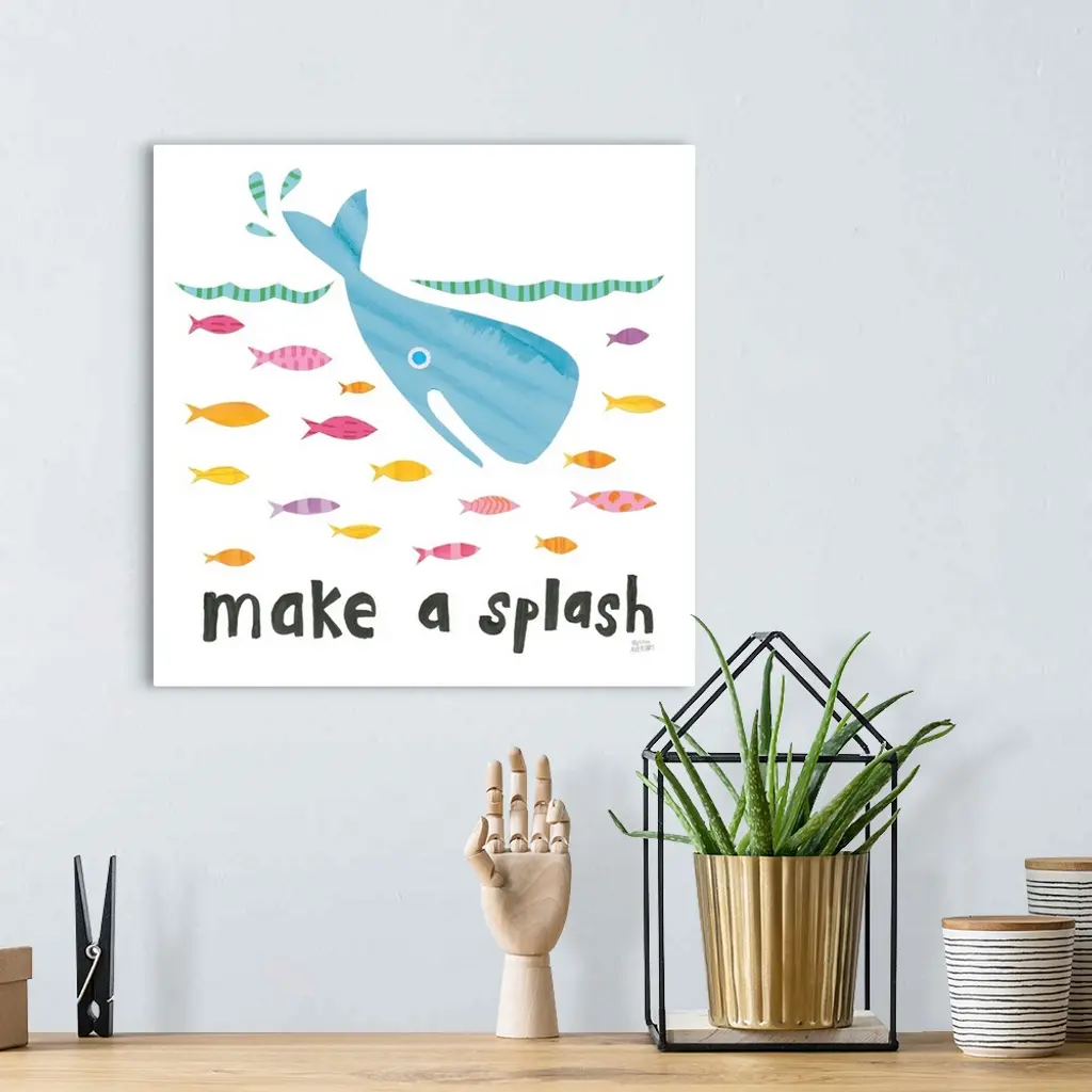 "Make a Splash" written in black underneath a whale and fish in the ocean, made from individual cut out pieces and placed on a white background.