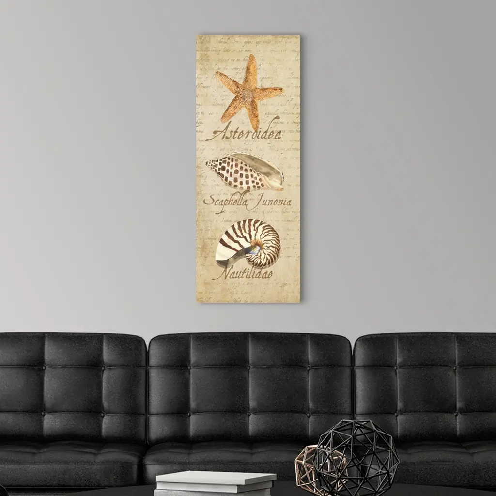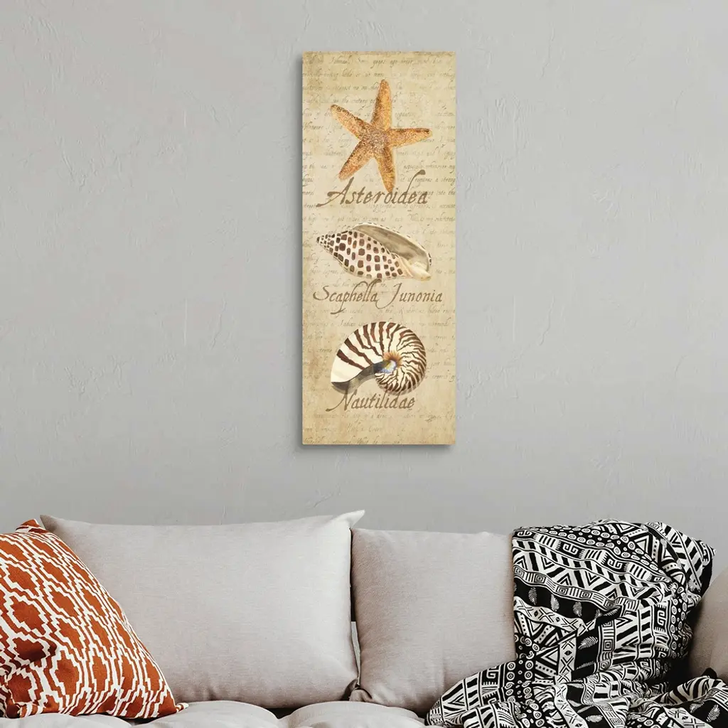 Decorative design of shells on a beige background with faded text and 'Asteroidea, Scaphella Junonia, Nautilidae'.