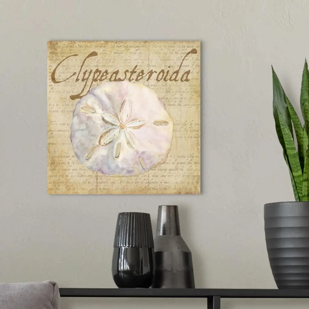 Decorative design of a shell on a beige background with faded text and 'Clypeasteroida' on the side.