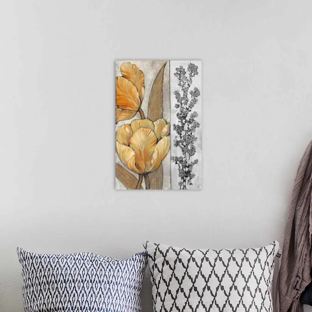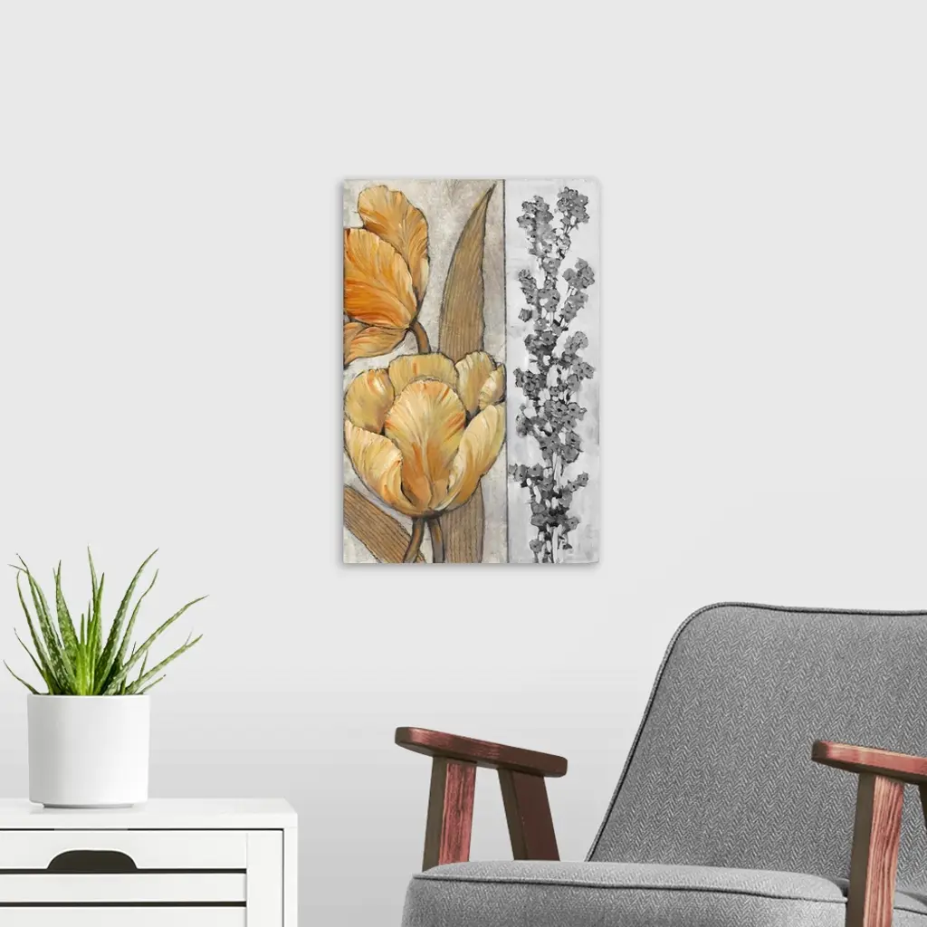 Lively brush strokes create warm golden tulips over a textured gray background with strip of gray flowers on the right side.