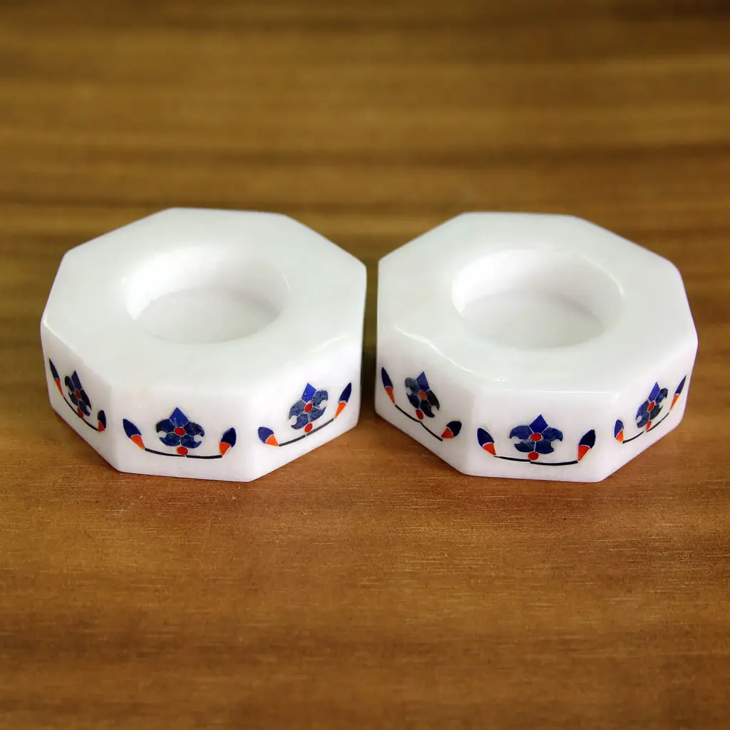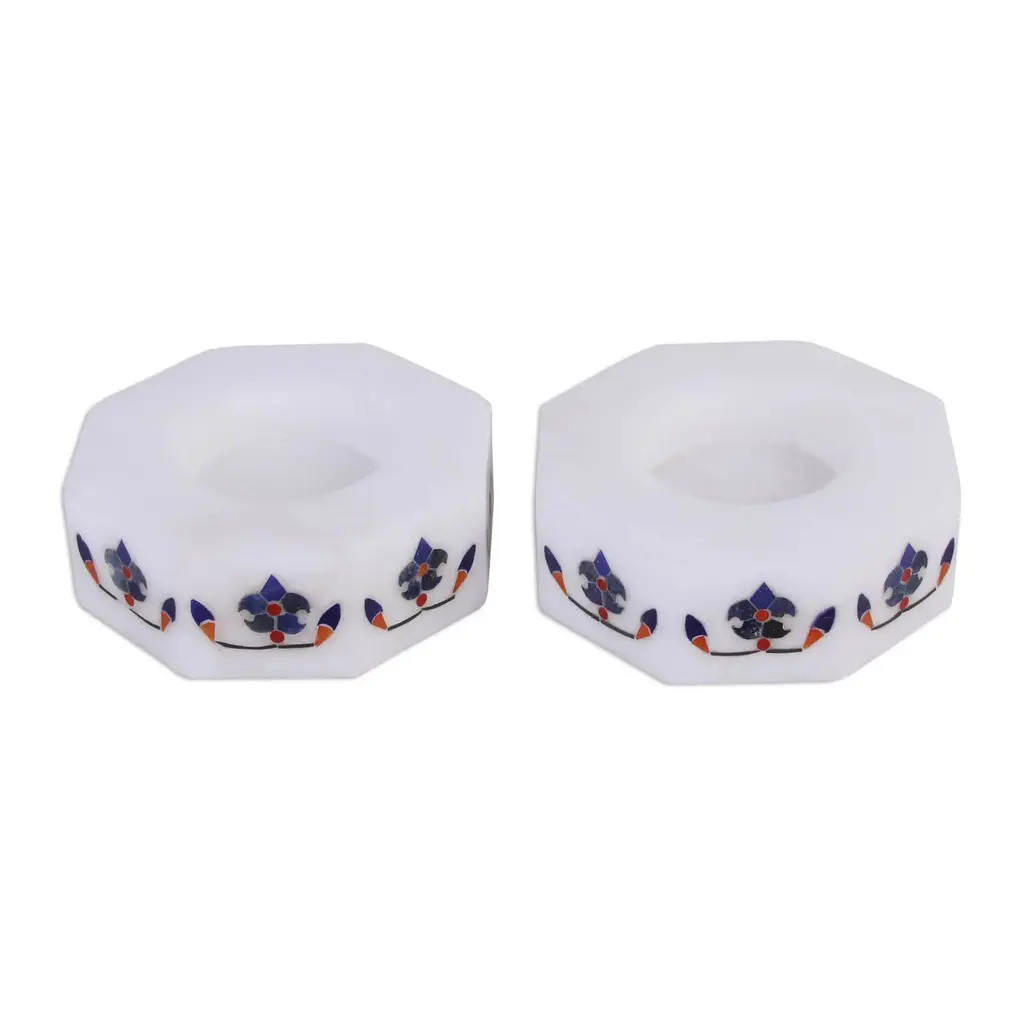 Elegantly crafted from white marble, this pair of octagonal tealight holders from Raj Kumari and Raja Ram of India provides functional and stylish decor for your home. The two tealight holders feature a vibrant floral design that portrays the progression of a flower's growth. A blue flower is displayed at the center of each side, surrounded by two smaller buds. Deep orange and red accents add contrast against the white background.