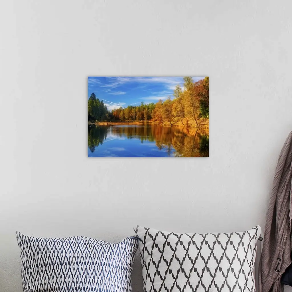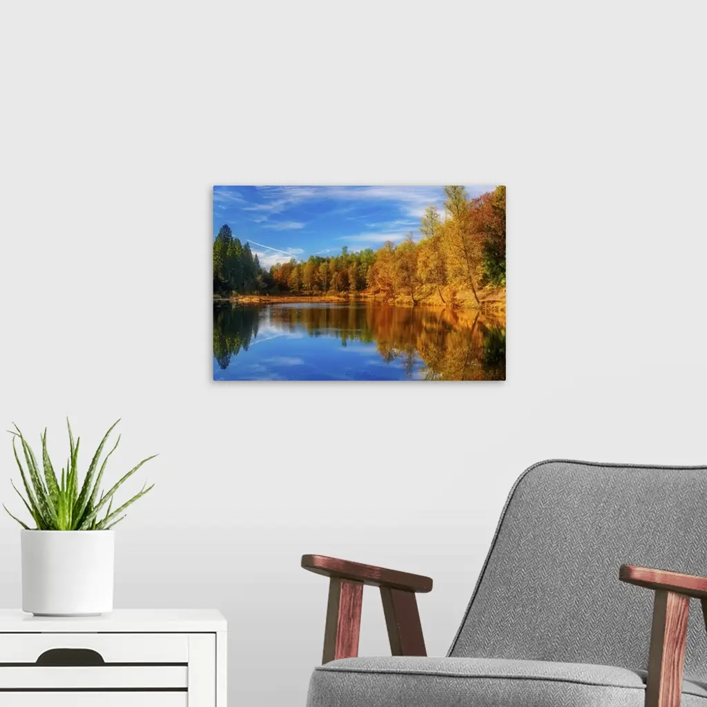 Trees in a variety of fall colors mirrored in a lake with a blue sky above.