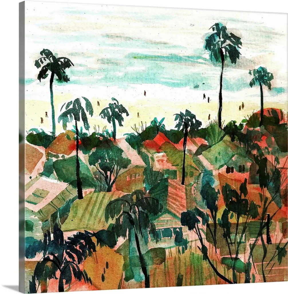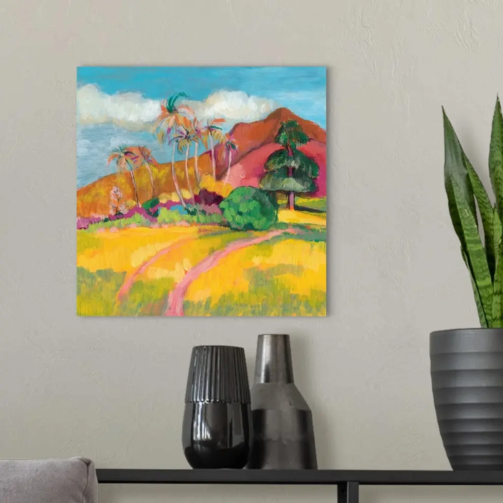 This contemporary landscape features short vertical brush strokes to create a bright tropical mountainous landscape.