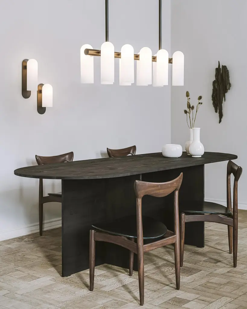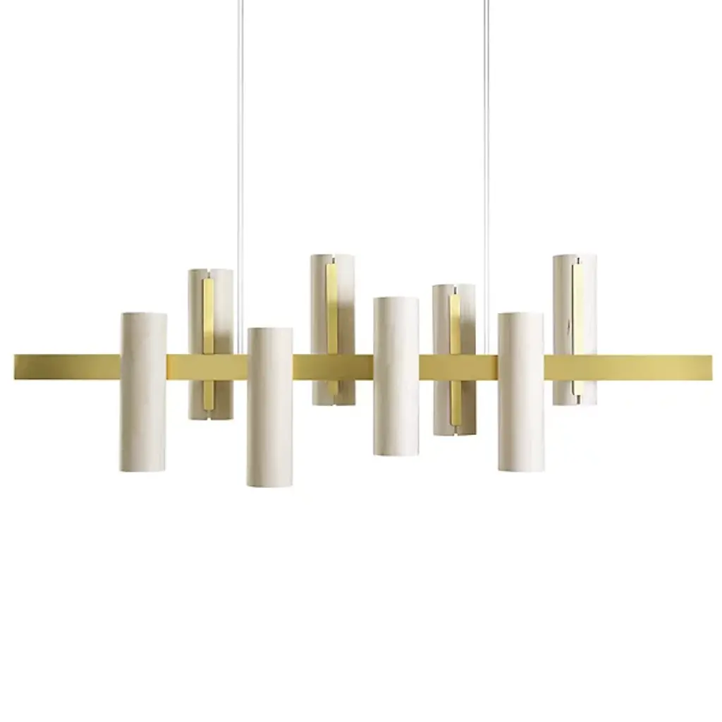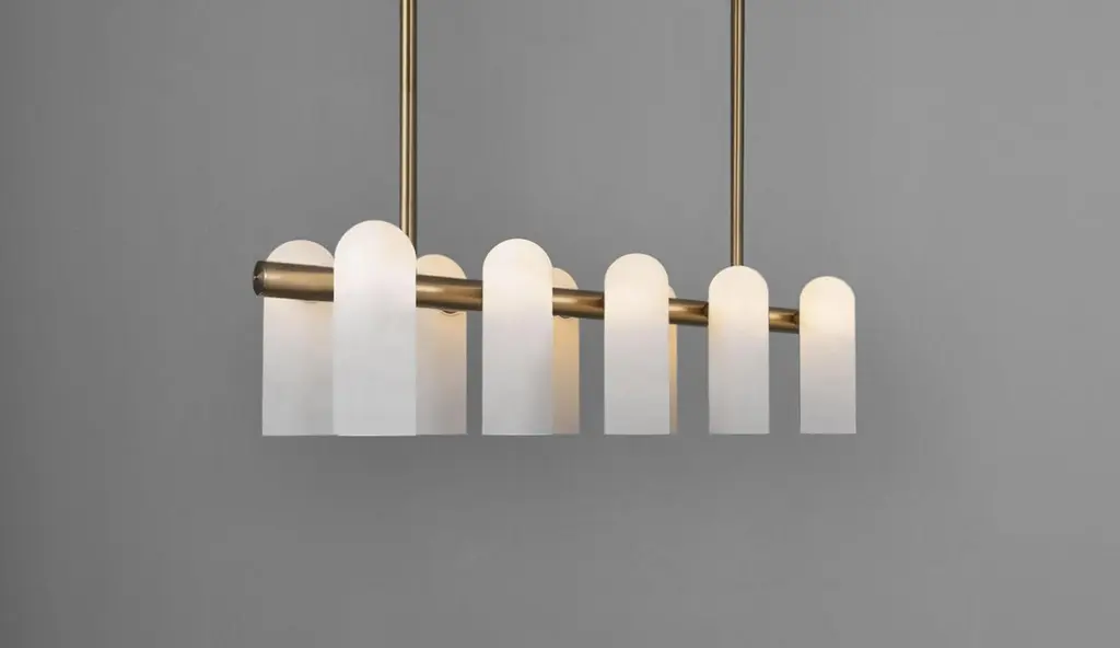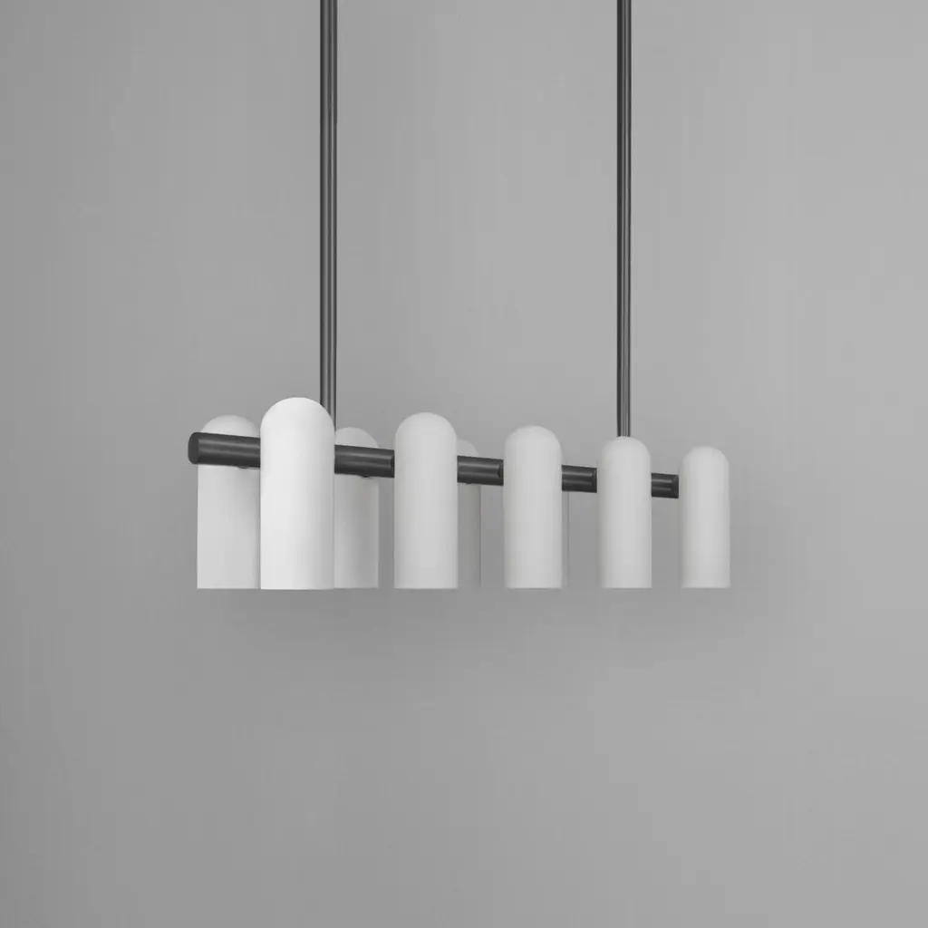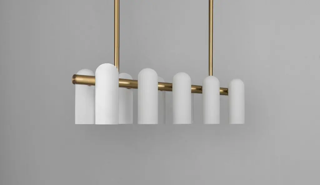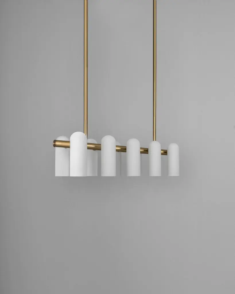 A colonnade of light sources. This delicate engine of frosted glass generates a luminous environment while contrasting brass elements create a sense of stability.Available in our three signature finishes: Lacquered Burnished Brass (LBB); Black Gunmetal (BGM); Polished Nickel (PN)Odyssey CollectionCome with us on a voyage. To a distant dreamscape where curious wanderers roam. Captured in motion, these gentle machines are destined for the future even as they recall the comfort of home.Playful varieties of shape are composed through a geometric language of pure form, transporting us to scales, and places from our memory and imagination.Dimensions:Globe Diameter: Ø 100 mm / Ø 3.9''Depth: 314 mm / 12.4”Width: 1143 mm / 45”Length: 424 mm-1324 mm / 16.7?-52.1?(Extension rods included)Weight:15.6 kg / 34.4 lbLight sources available:LED Bulb (included) 10 x 5 W.