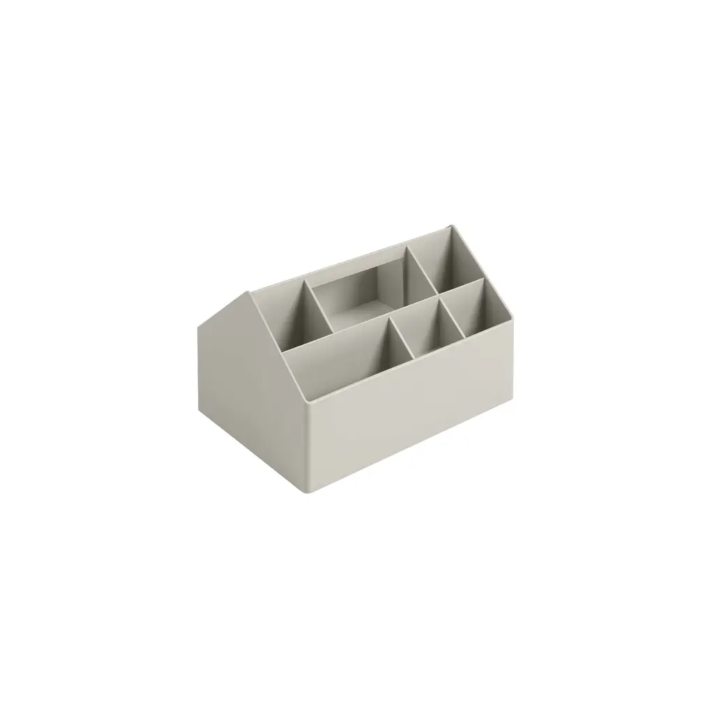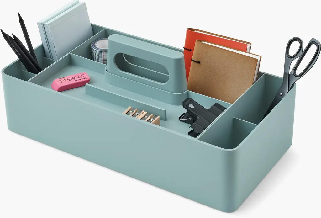 An essential modern organizer based on a utilitarian classic, the OE1 Workbox (2023) helps keep tools and personal items at hand throughout a busy workday. Part of the OE1 Collection, it was designed by Kim Colin and Sam Hecht to declutter home or office while offering easy portability. Made from 99% recycled plastic, the convenient catch-all has an ergonomic handle, multi-size compartments, and a cover/tray to organize essentials - from power cords and chargers to office or craft supplies - and you'll find it comes in just as handy in the bath, kitchen, and playroom. Made in U.S.A.