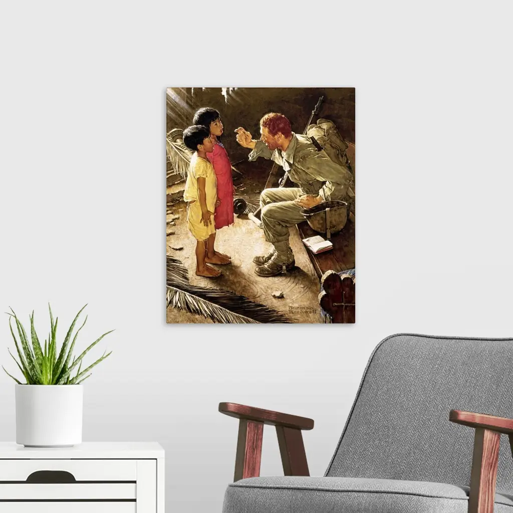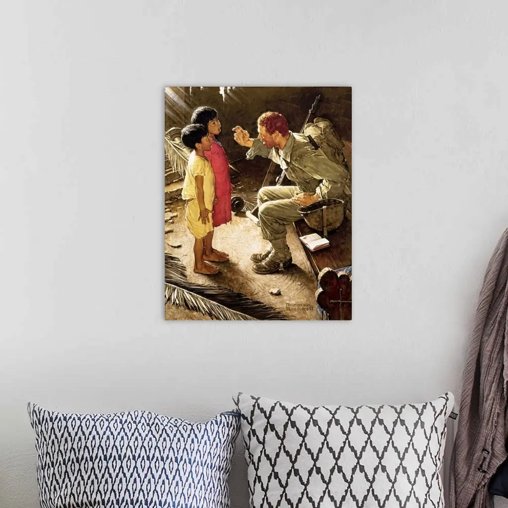 Distant from the activities of the war raging in Europe, Norman Rockwell was challenged to record his interpretation of the effects of World War II on servicemen, and on Americans at home. Alternate Title Soldier With Two Children. Approved by the Norman Rockwell Family Agency