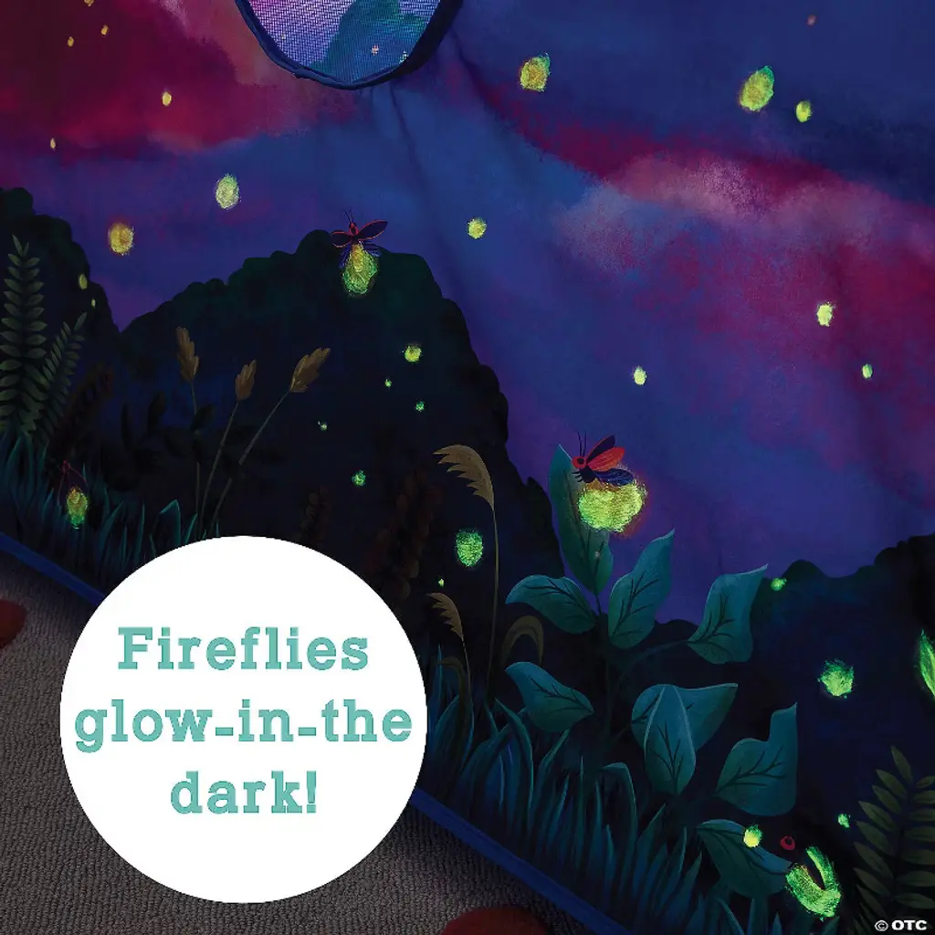 Let your imagination run wild under a canopy of twilight skies and glow-in-the-dark fireflies. Three simple steps has this indoor tent set up in just a few seconds, ready to transport children to a twilight meadow scene aglow with the soft luminescence of fireflies against a backdrop of pink and purple skies. At 3 feet tall with a base of nearly 4 feet x 4 feet, this tent comfortably seats several young explorers. Expose the tent to light for at least 15 minutes, then go lights out and watch the glow-in-the-dark paint light up your space! When playtime is over, the tent easily collapses into its compact storage bag, making clean-up a breeze. Perfect for making everyday moments sparkle, this tent is a must-have for imaginative play that lights up the night.