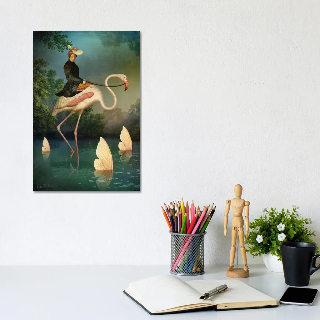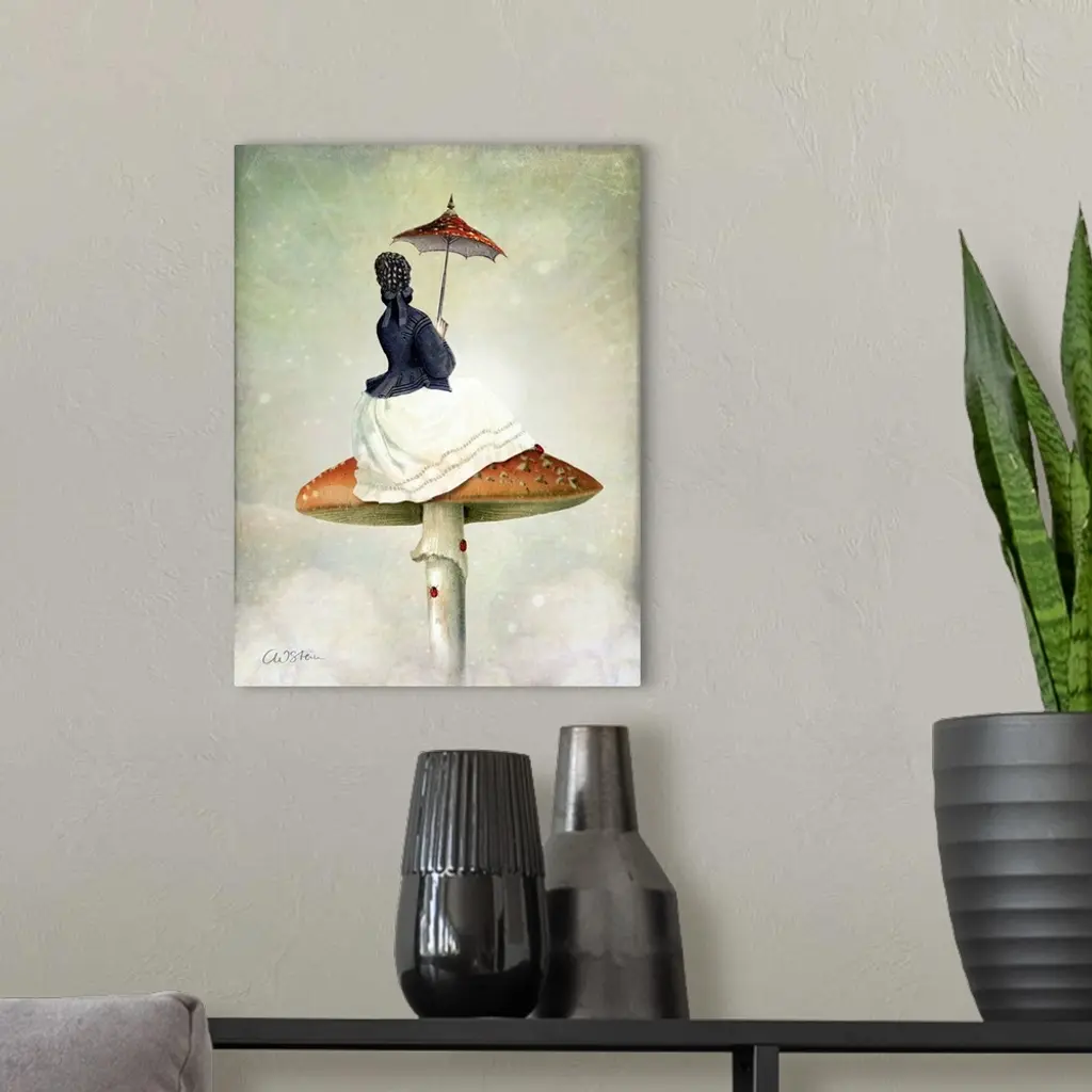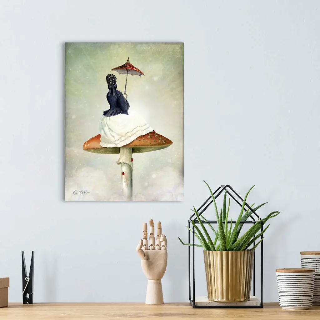 A lady with a small umbrella is sitting on a mushroom as lady bugs crawl on it.