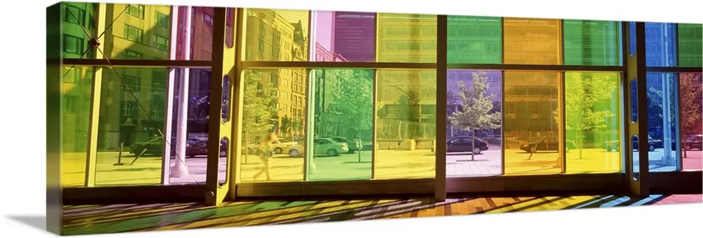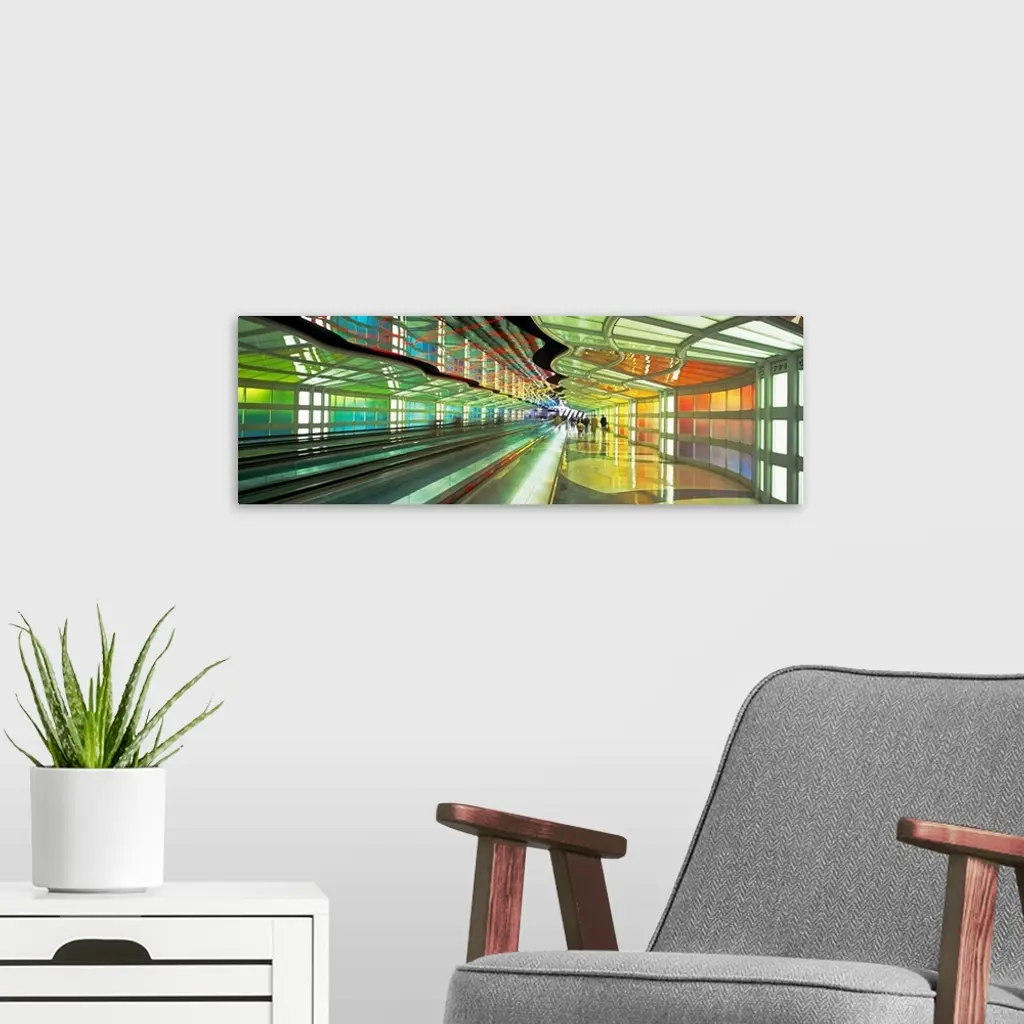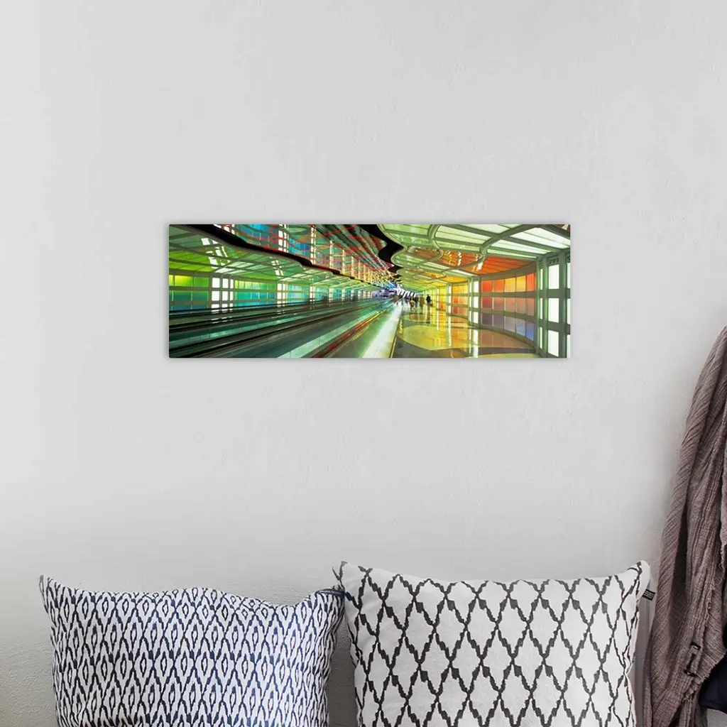 Panoramic photograph of moving sidewalk in airport terminal with people in the distance.