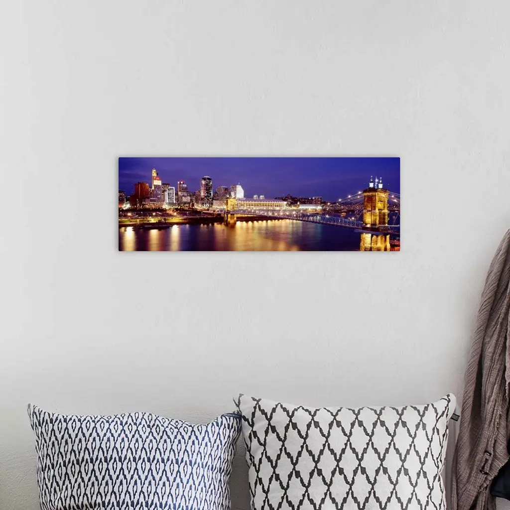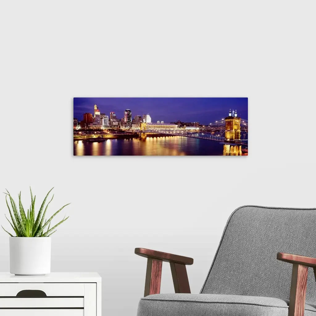 Horizontal photograph on a large canvas of the night lights of Cincinnati's downtown waterfront and bridge over the Ohio River.