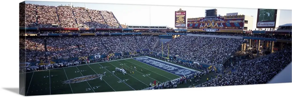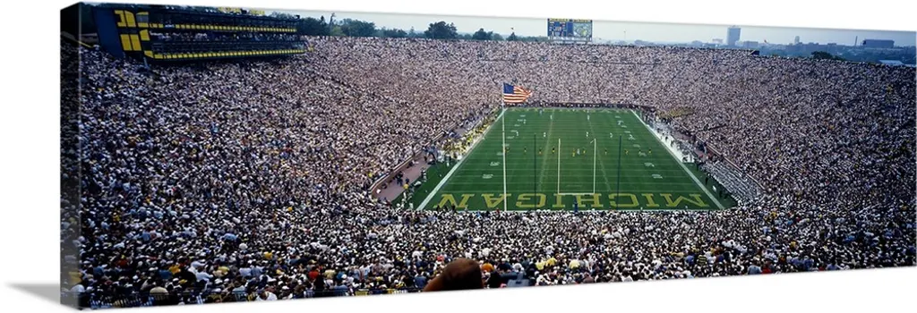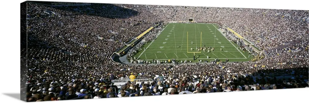 This panorama of Ohio Stadium showcases The Ohio State University Marching Band performing 'script Ohio, moments before The Ohio State Buckeyes played to victory over the Wisconsin Badgers. Of all the traditions in Ohio State's great football history, the most widely recognized and greatest spectacle in college sports is the Script Ohio, the formation performed by the band each and every game day. In addition, the tradition of dotting the I dates back to 1936 and was invented by a sousaphone player. To this day, only sousaphone players with a minimum of 4 years membership are allowed to dot the I.
