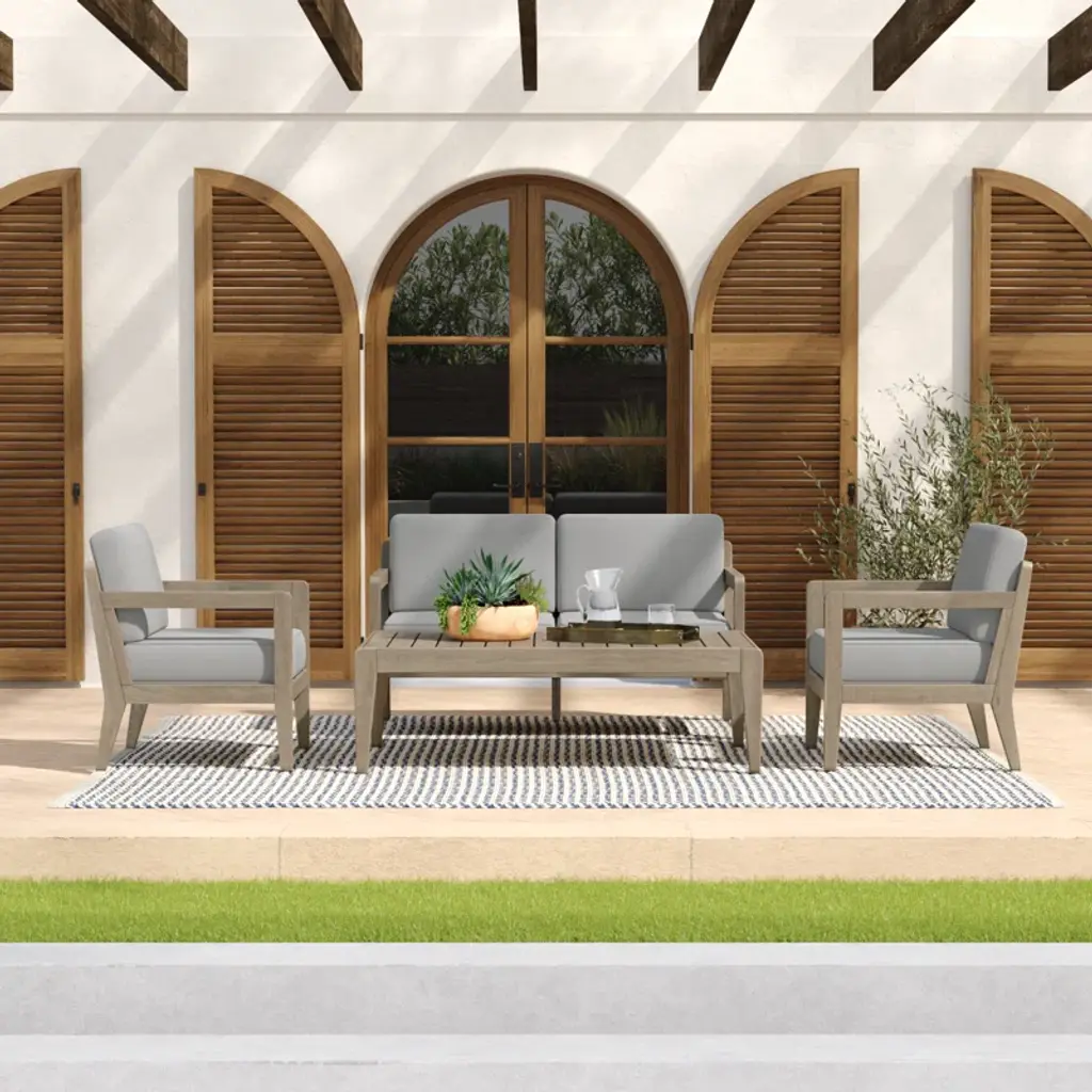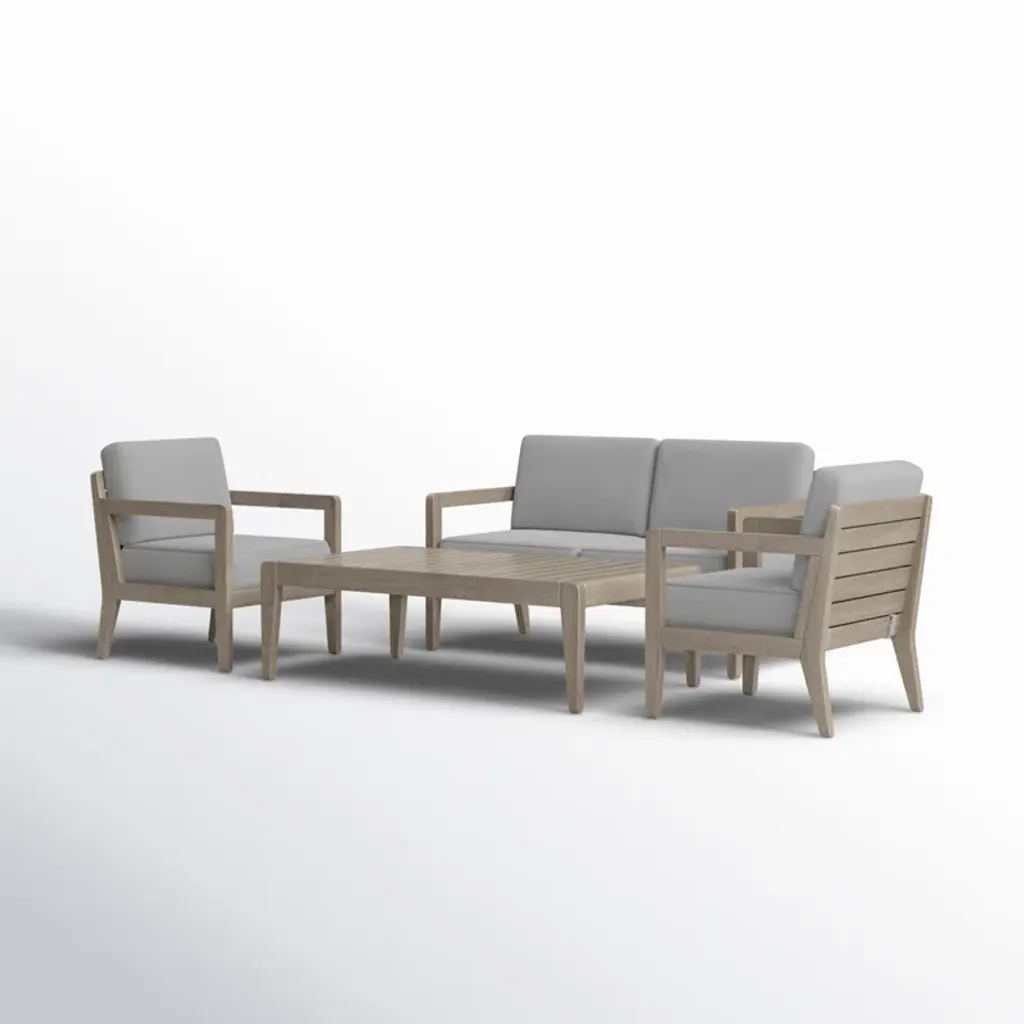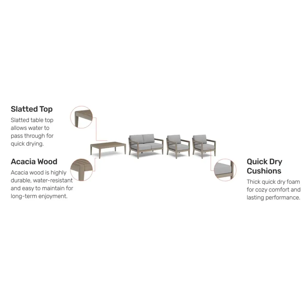 Any outdoor space becomes a desirable destination for entertaining or relaxing with our 4-piece seating group. It includes a loveseat, two club chairs, and a coffee table. Each piece is crafted from solid acacia wood with a warm brown finish that highlights a natural wood grain variation for a more organic vibe. The slatted surfaces lend an open look to the overall design. Gray water- and UV-resistant cushions are filled with foam to provide just the right amount of support as you sit and relax.