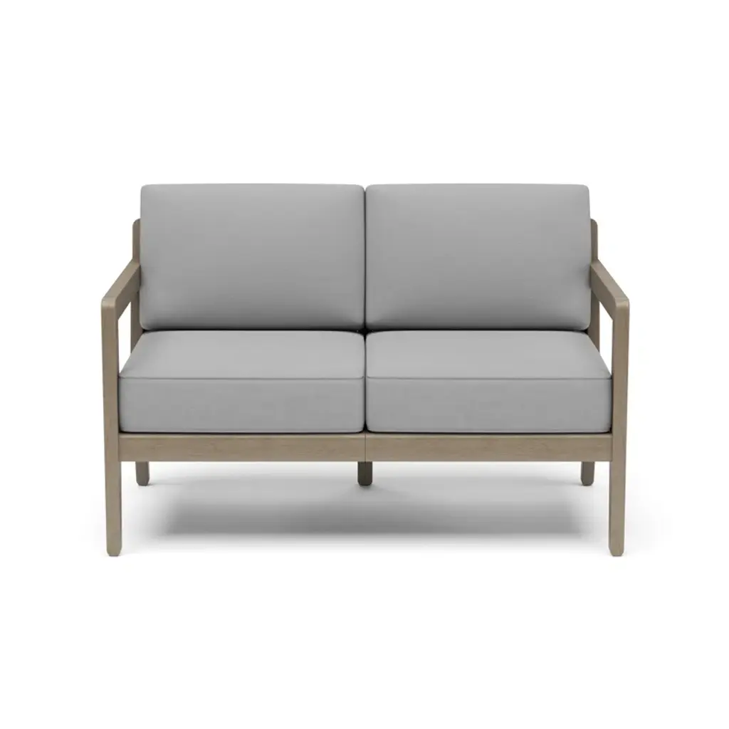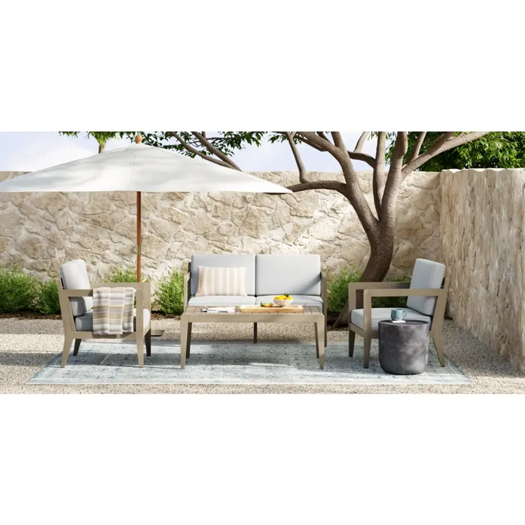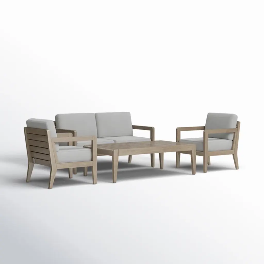 Any outdoor space becomes a desirable destination for entertaining or relaxing with our 4-piece seating group. It includes a loveseat, two club chairs, and a coffee table. Each piece is crafted from solid acacia wood with a warm brown finish that highlights a natural wood grain variation for a more organic vibe. The slatted surfaces lend an open look to the overall design. Gray water- and UV-resistant cushions are filled with foam to provide just the right amount of support as you sit and relax.