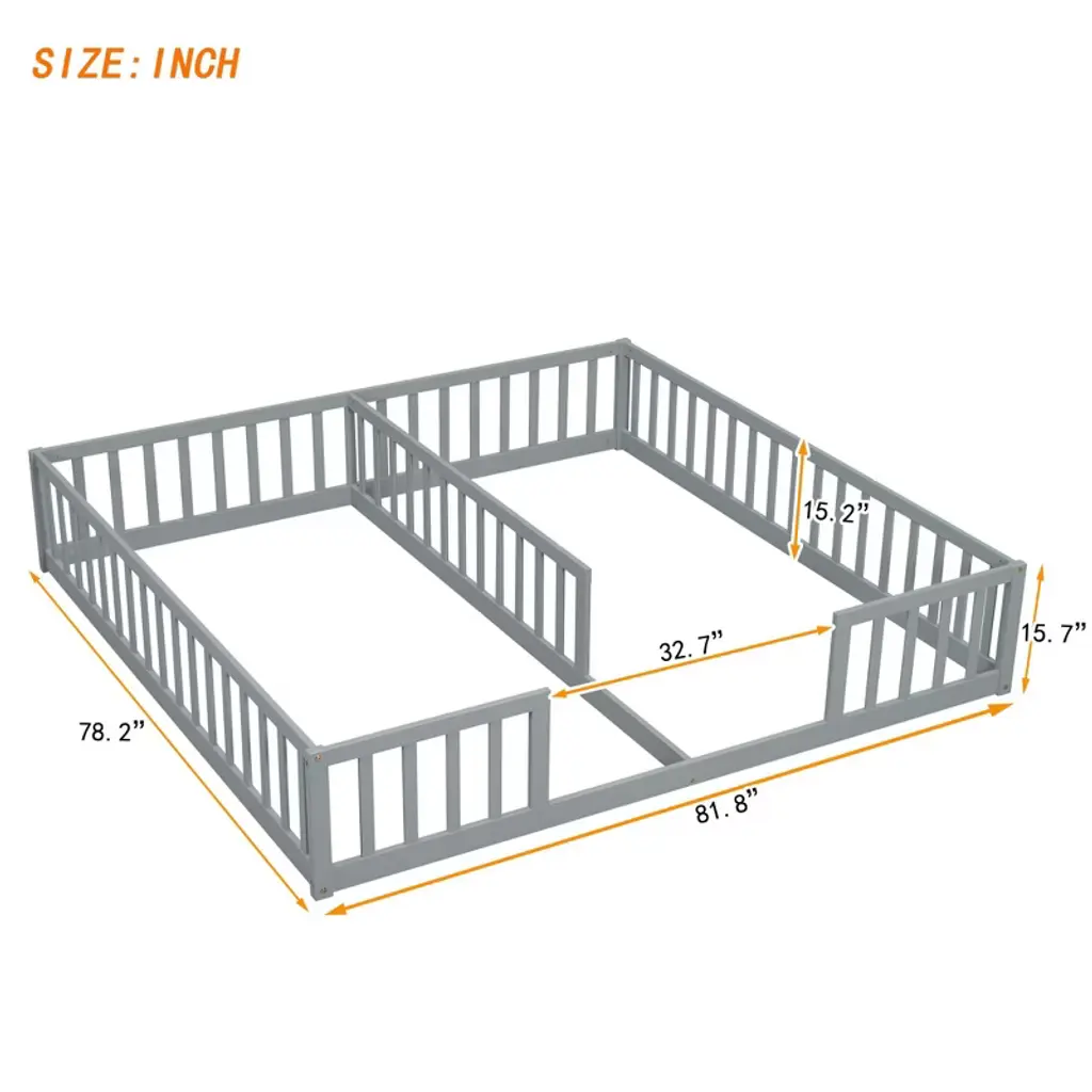 Okak Double Twin Bed Frame With Fence Guardrails, Without Door, Modern Floor Bed For Toddlers/kids Bedroom,grey