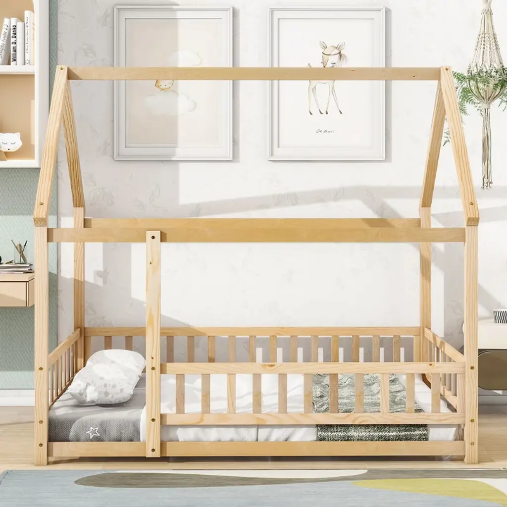 Okak Full Size Bed Frame With House-style Roof & Fences Guardrails, Modern Floor Bed For Toddlers/kids Bedroom,natural