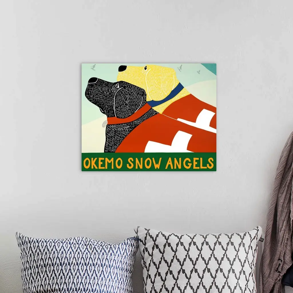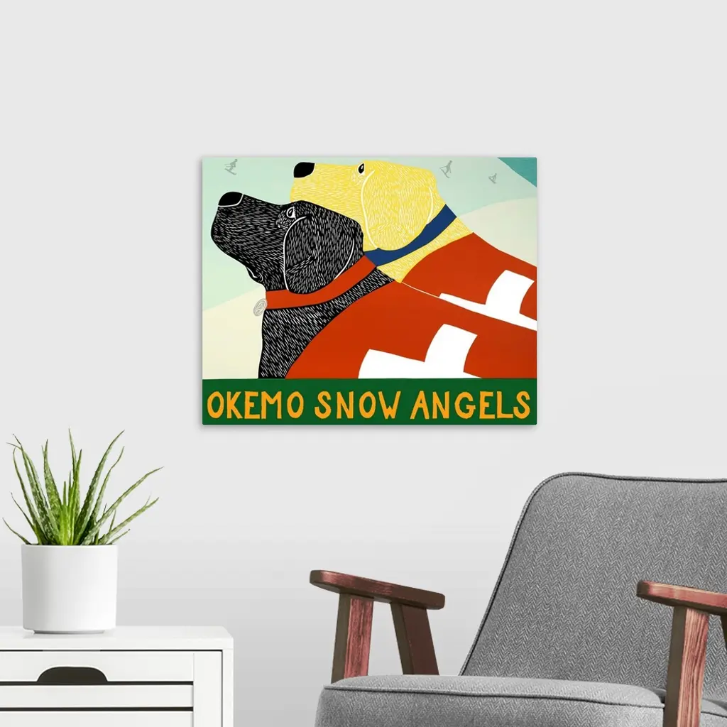 Illustration of a black and yellow lab dressed in ski patrol uniforms looking up the slopes with the phrase "Okemo Snow Angels" written on the bottom.
