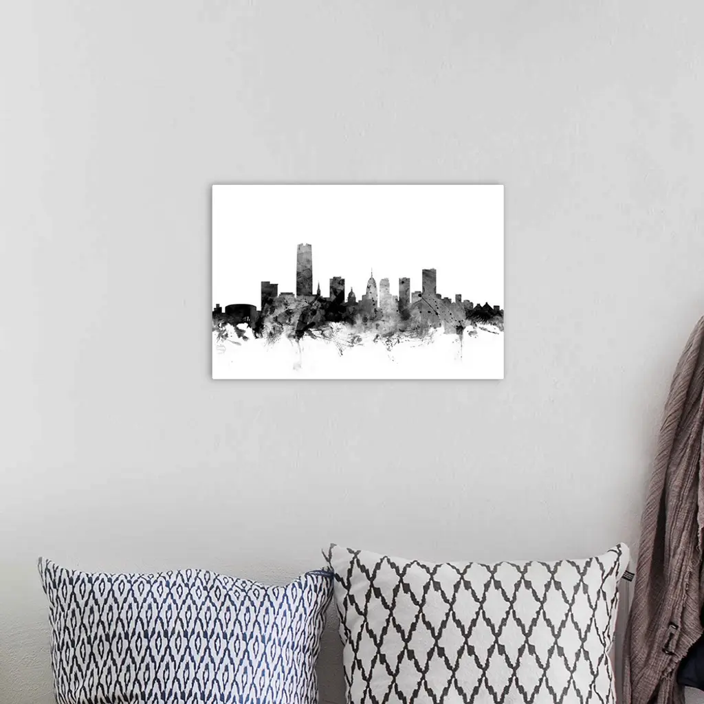 Smokey dark watercolor silhouette of the Oklahoma city skyline.