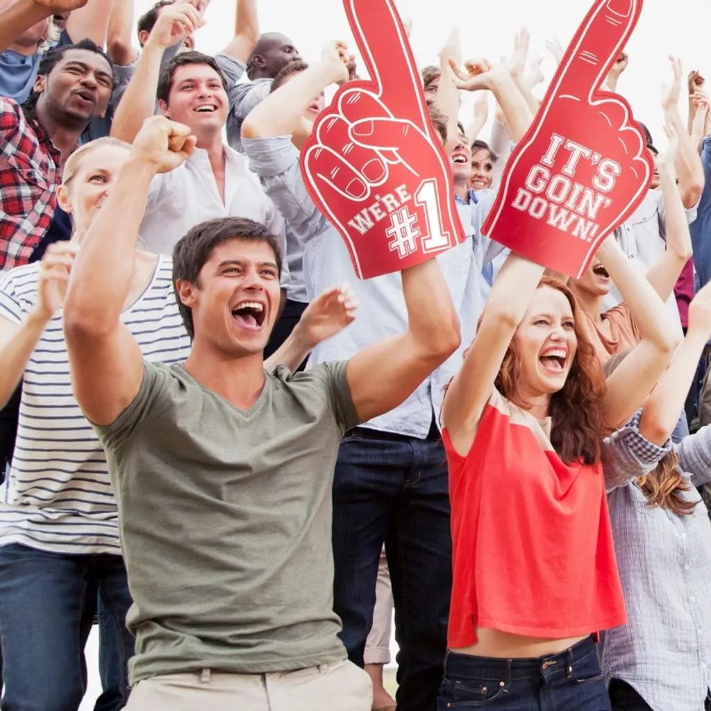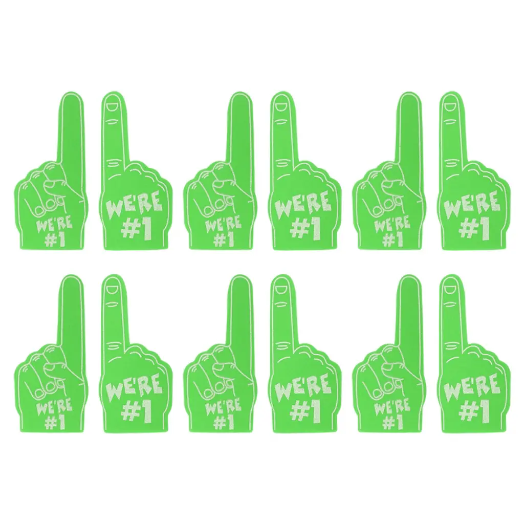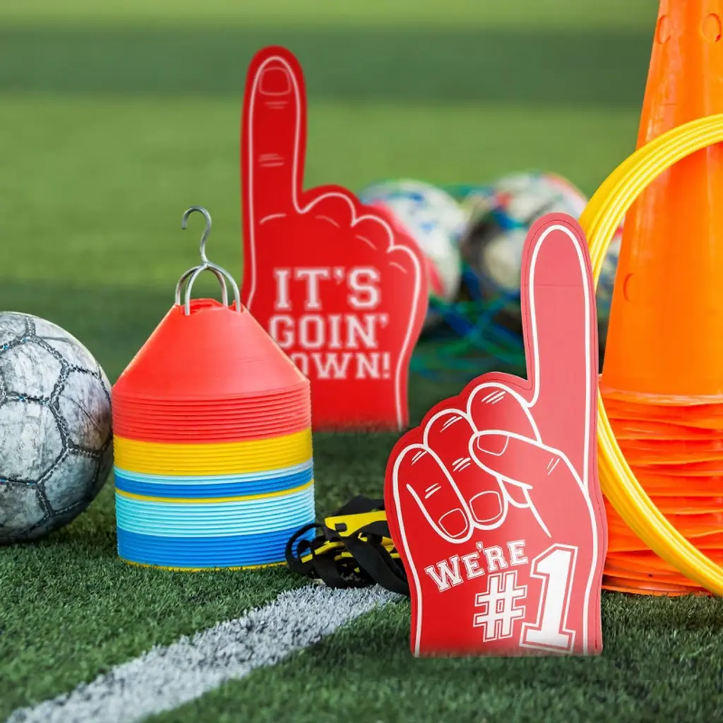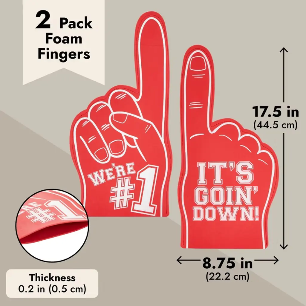 Elevate your fan game with these giant foam fingers for sports, creating unforgettable moments during games and boosting the overall fan experience. Each foam hand is a powerful expression of team pride, fostering a sense of community and camaraderie among fans. Whether you're at a soccer match, football, baseball, or basketball game, this foam finger set is the ultimate accessory to passionately showcase your team spirit. Measuring 8.75 x 17.5 x 0.2 inches, these foam fingers are the perfect size for easy carrying and waving, making them ideal for tailgate parties, sporting events, or any gathering where team spirit takes center stage. Crafted from quality EVA foam material, these foam fingers are not only bold in design but also soft and comfortable to hold, ensuring you can cheer, wave, and celebrate every victory without any discomfort. In this sports fan pack, you'll receive two foam finger hands, each making its unique statement — one proudly proclaiming "We're #1" and the other boldly stating "It's Going Down." Together, they create the ultimate team spirit package for every passionate fan. Show your unwavering support and let your presence be known with this dynamic foam finger set! More Color Available.