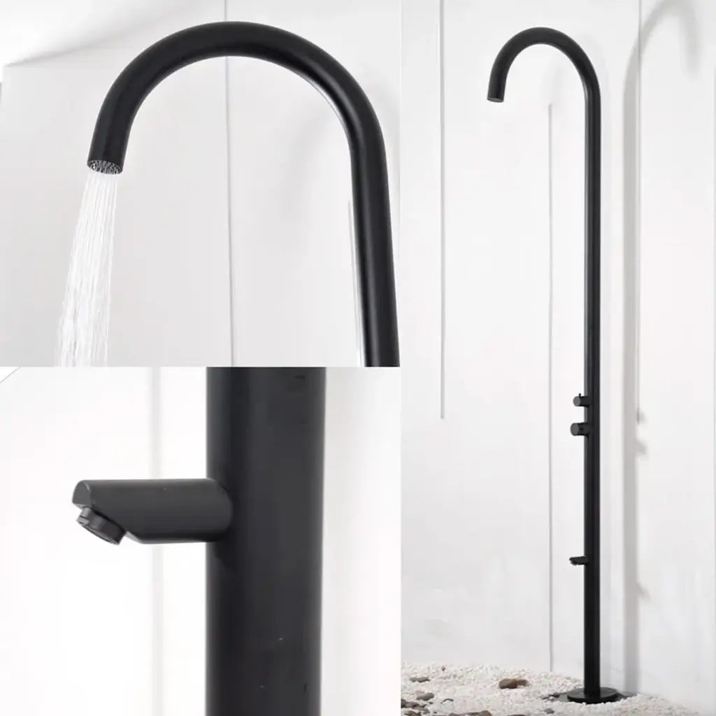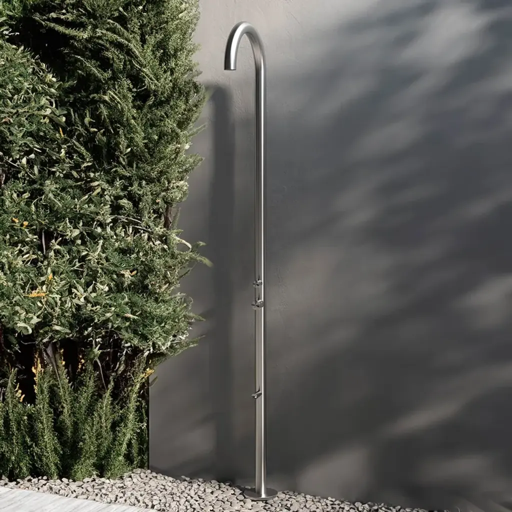 The Sined OLBIA Shower in 316L Nautical Stainless Steel represents a leading innovation in the outdoor shower scene, combining sophisticated design with advanced functionality and excellent materials. With a height of 243.9 cm and a diameter of 6 cm, this shower not only visually enhances the outdoor space in which it is installed but also offers an unparalleled user experience, providing strength, durability and a unique touch of black elegance.Made entirely of 316L stainless steel, the BLACK OLBIA is designed to withstand the most severe conditions, including maritime environments where salinity could compromise less noble materials. This type of steel, known for its anti-corrosion properties, ensures that the shower maintains its beauty and functionality over time, resisting weather, humidity and prolonged exposure to the sun.The assembly, simplified by the C-BOX system, ensures extreme stability and durability. This innovative solution allows safe and quick installation, giving the shower a solidity that few other systems can offer. The weight of 16 kg testifies to the sturdiness and reliability of the structure, making it a durable investment for any outdoor environment, from home to garden, swimming pool to hotel, B and B to bathing establishment, and even boat.The integration of a hot and cold water mixer directly into the showerhead allows intuitive and immediate temperature control, offering a customizable bathing experience to the highest degree. Added to this is a footwash mixer, which further enhances the convenience of use by allowing sand, soil or other impurities to be removed before entering the water or re-entering the home.Ease of connection to the existing hot and cold water system makes the OLBIA NERA shower extremely versatile and suitable for a variety of configurations and needs, without requiring complex plumbing work. This feature, combined with its remarkable aesthetics and construction quality, makes it the ideal solution not only for residential environments but also for hospitality facilities that wish to offer their guests a luxurious outdoor experience.All the included accessories are also made of 316L stainless steel, ensuring a visual harmony and material consistency that help define a high standard of quality and beauty. The combination of these features makes the OLBIA NERA an unparalleled outdoor shower, capable of combining performance and design in an excellent way.Choosing the OLBIA NERA for your outdoor space means opting for a product that elevates the experience of daily use by transforming it into a moment of pure pleasure and relaxation. It is an investment in quality, design and durability, transforming the simple act of taking a shower into a luxury experience, aesthetically enriching the environment and enhancing its value.The Sined OLBIA NERA 316L Nautical Stainless Steel Shower is not just an outdoor accessory, but a distinctive element that testifies to attention to detail, innovation and luxury. With its commanding presence, exceptional performance and impeccable aesthetics, it is the ultimate choice for those who want the best for their home, garden, pool, hotel, B and B, bathing establishment or boat, offering an unforgettable experience of comfort and style.