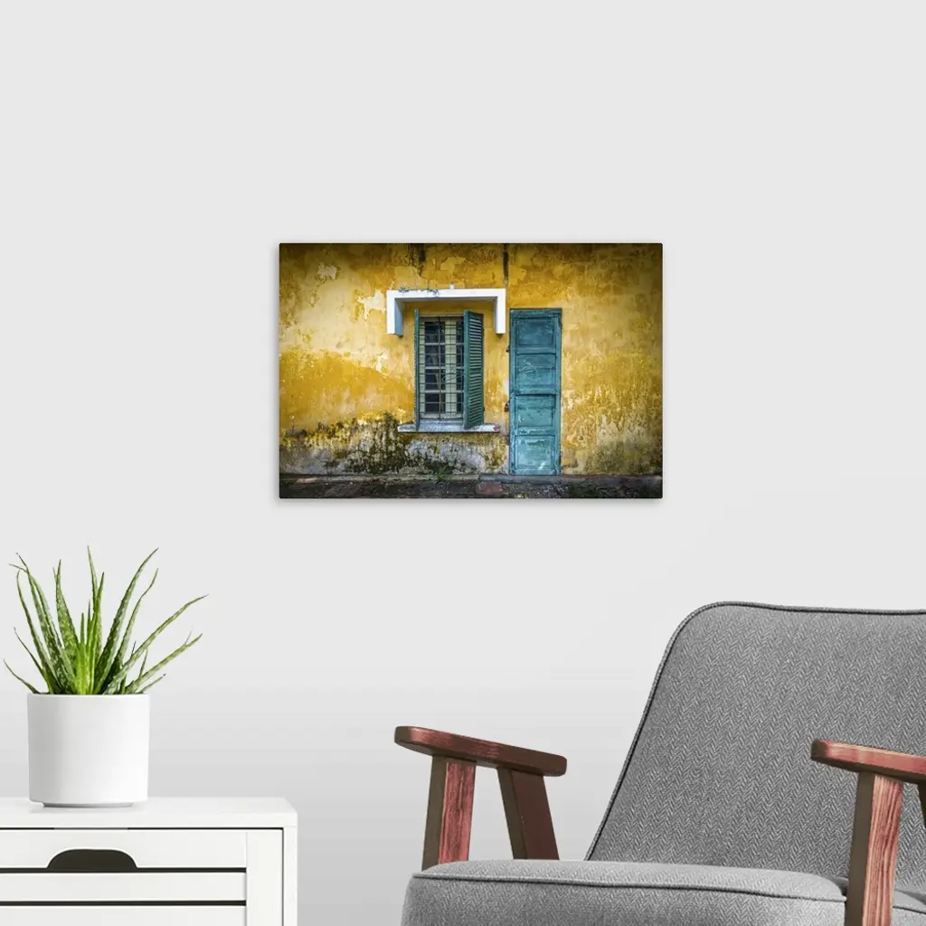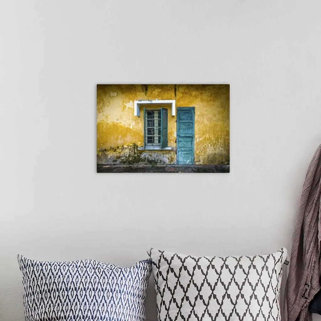 Outside view of deserted house with details in Vietnam. Old and grungy yellow wall with window and worn blue door. Abandoned place with lock.