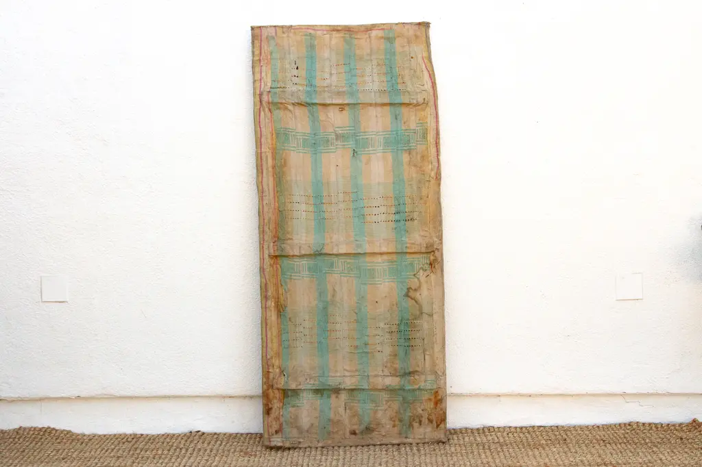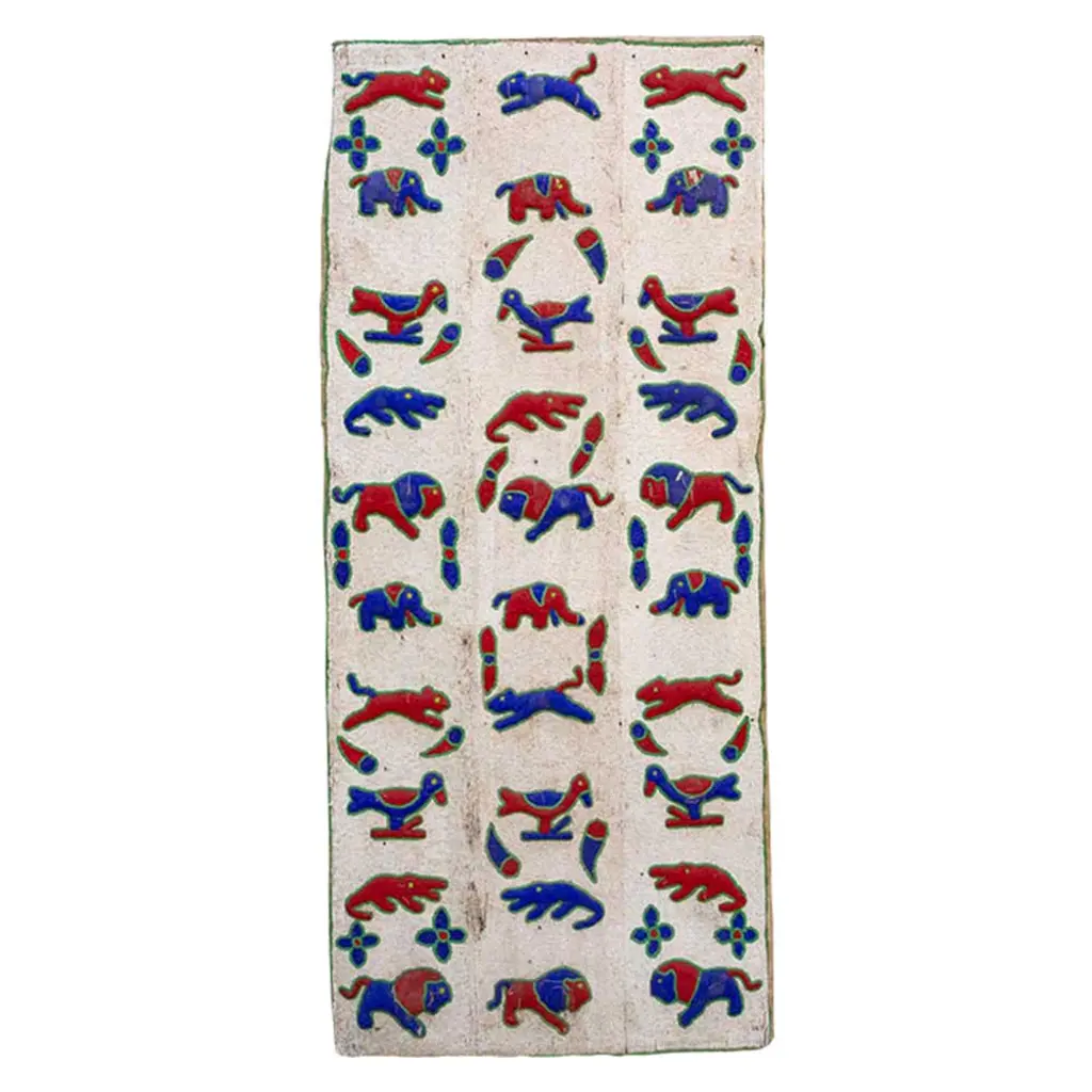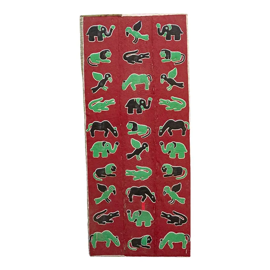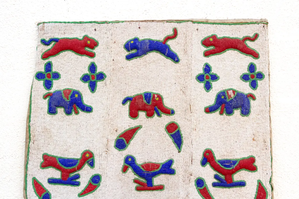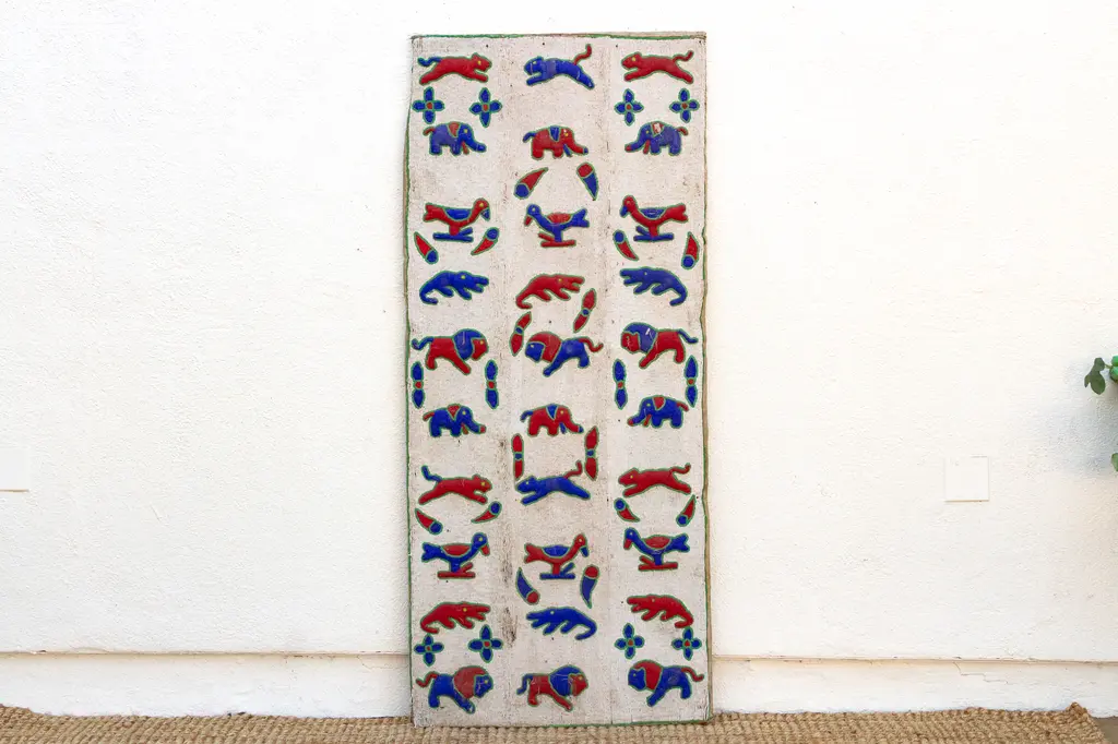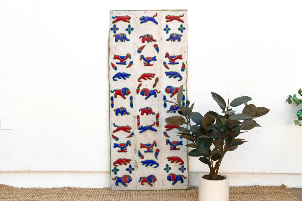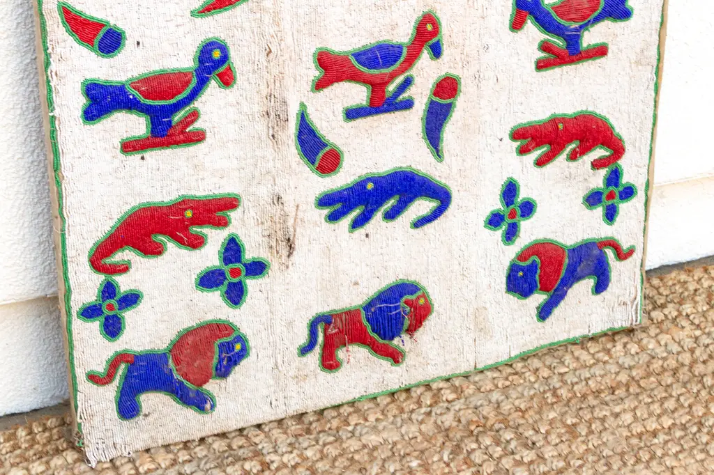 Embark on a Visual Safari with this Beaded Wall Panel: This impressive vintage beaded wall panel, standing tall at 70 inches, invites you on a visual safari through the African savanna. A vibrant menagerie of animals — lions, elephants, crocodiles, birds — is meticulously rendered in colorful beads against a dramatic black backdrop. Has some age wear, blemishes and missing beads.