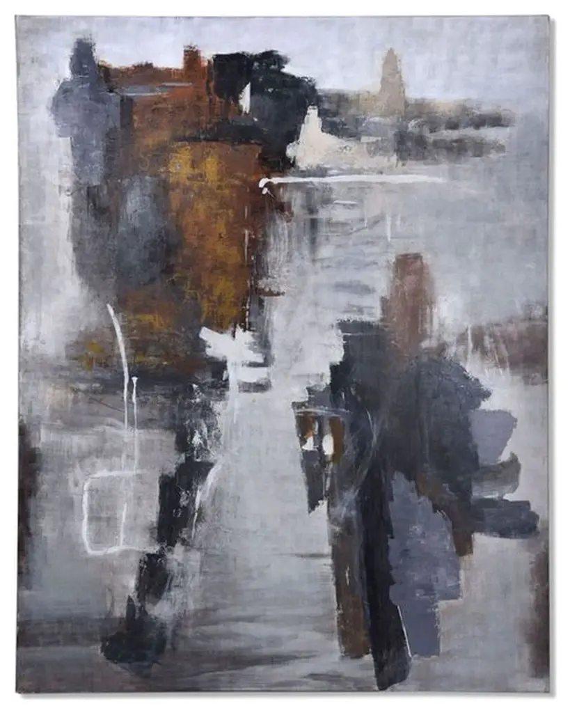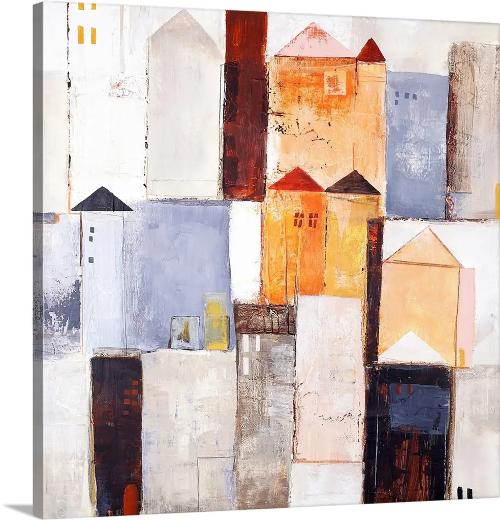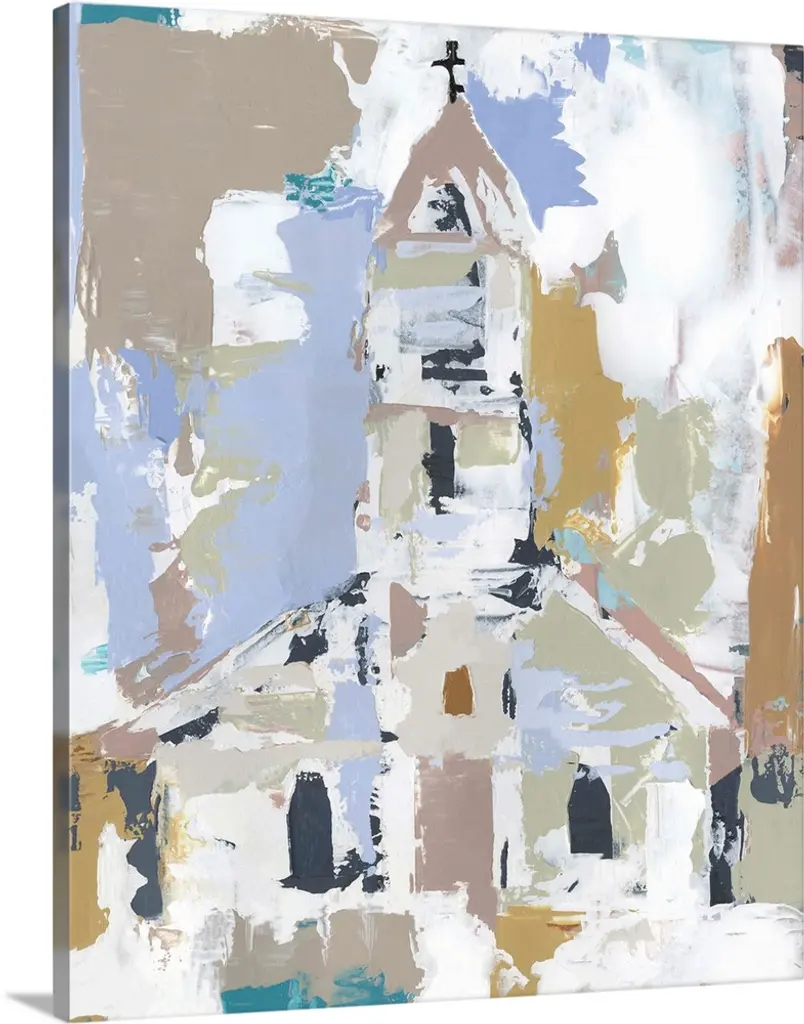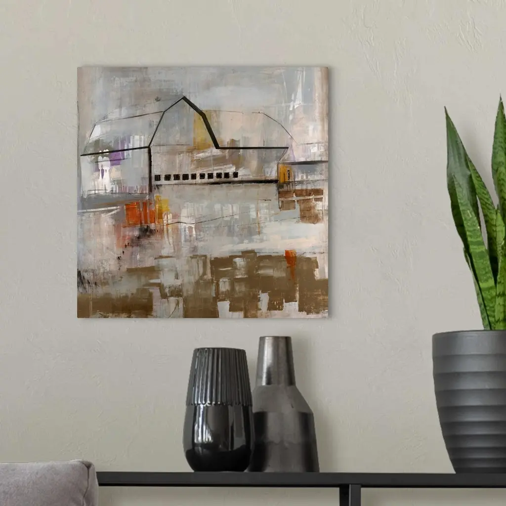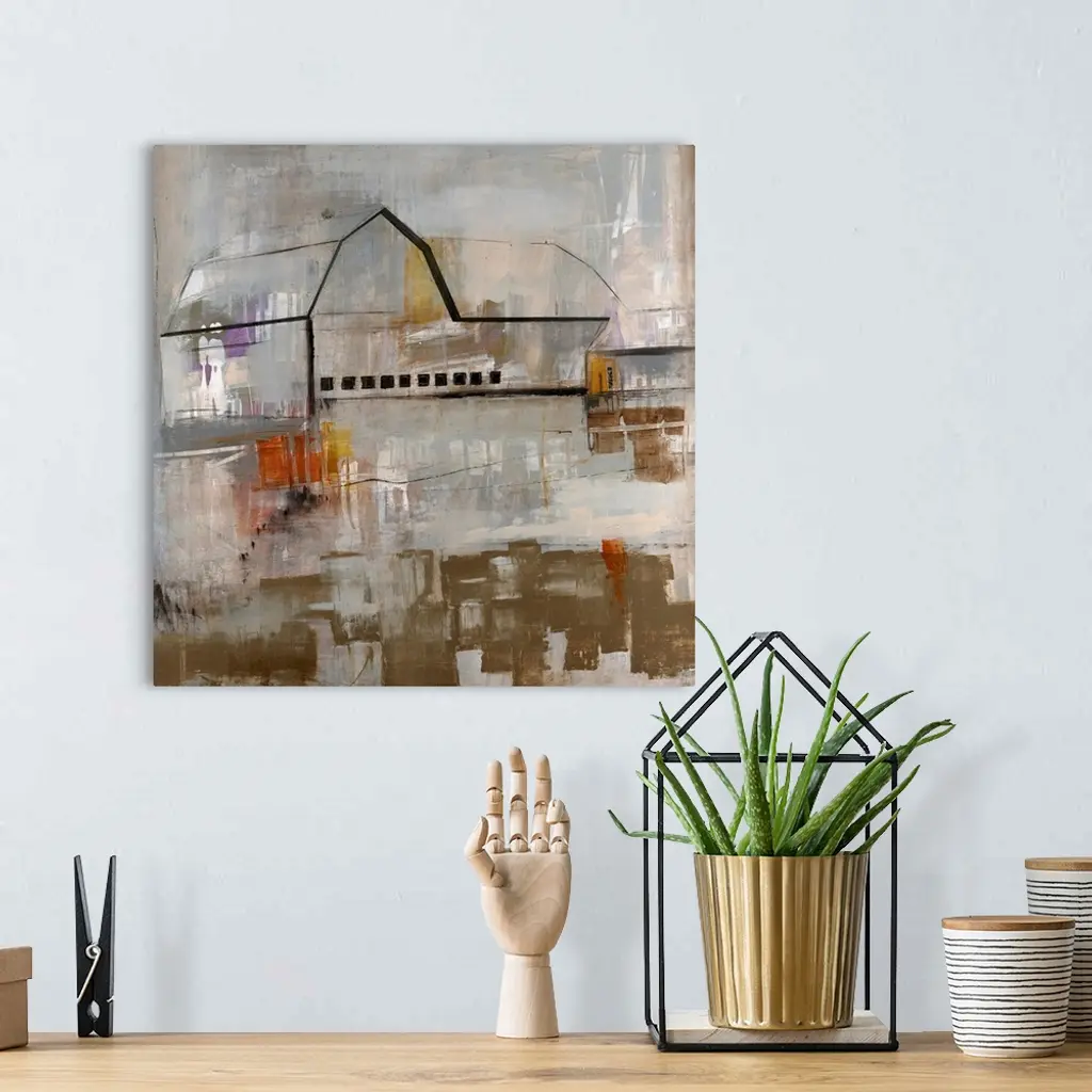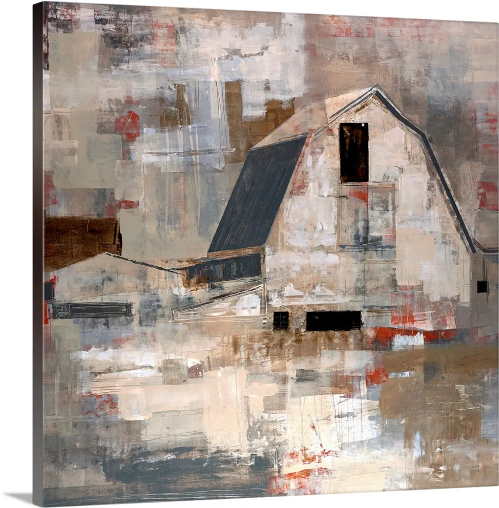 A contemporary and simplistic drawing of an outline of a barn with a mostly off white background and patches of brown at the bottom.