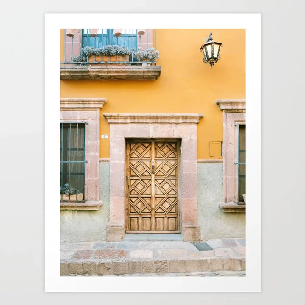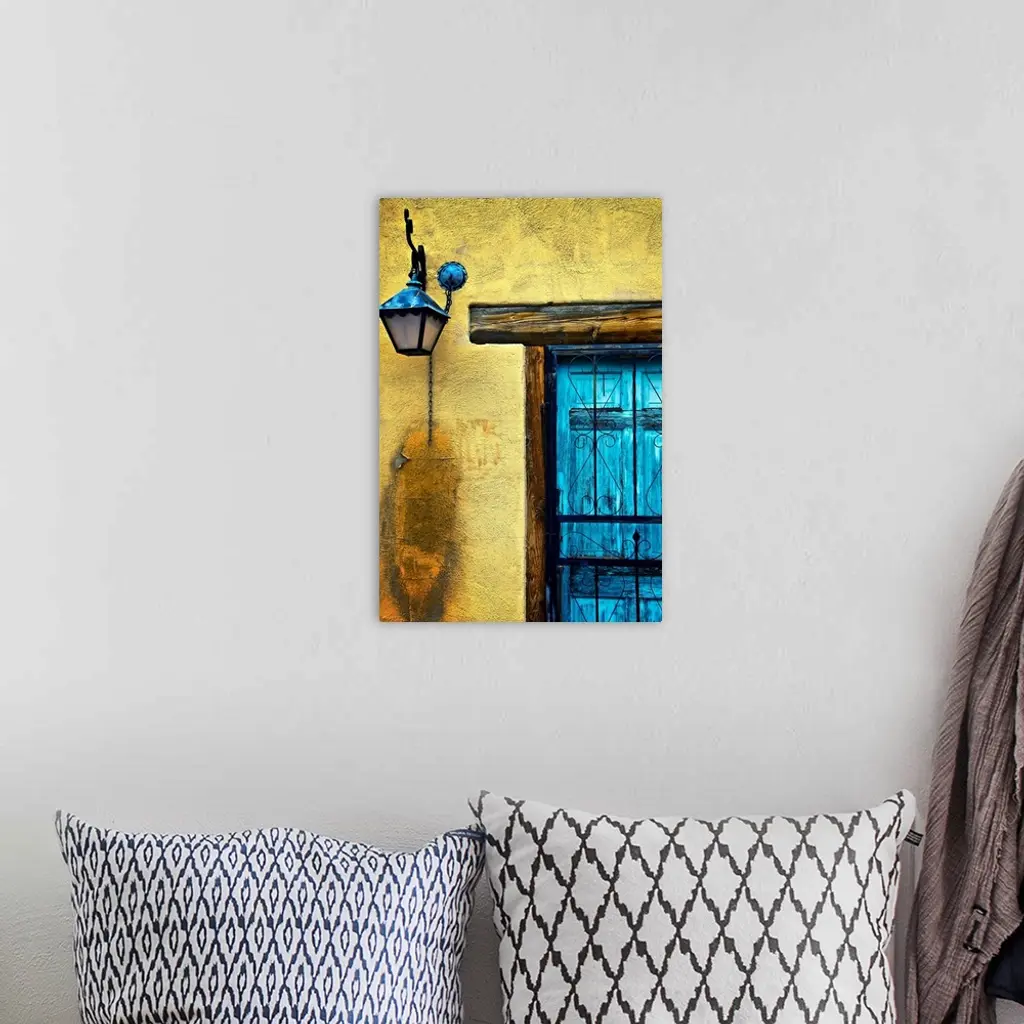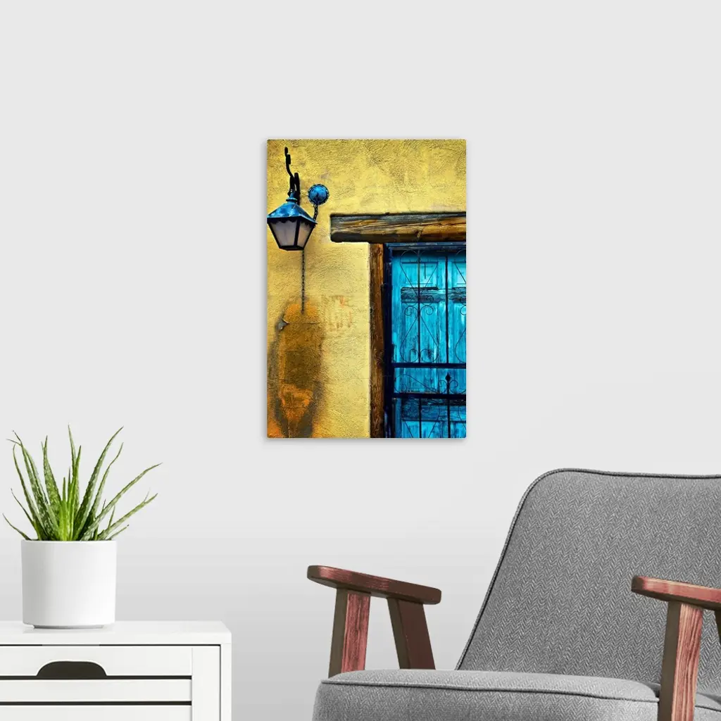 Vertical panoramic photograph of bright colorful door on stone wall.