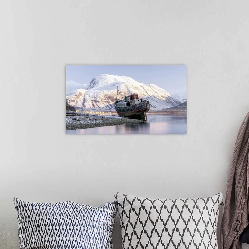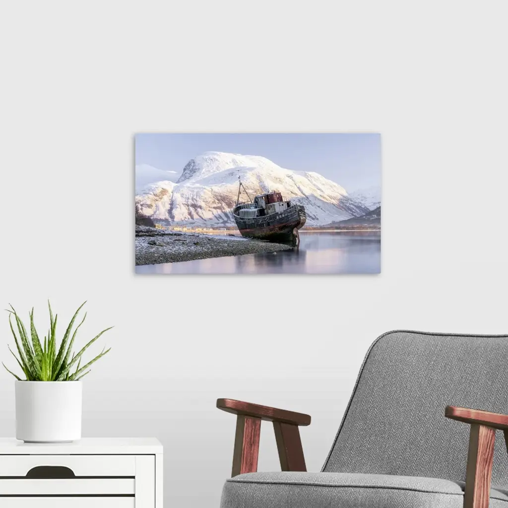 Old Boat Wreck At Caol With Ben Nevis In The Background, Scottish Highlands, Scotland