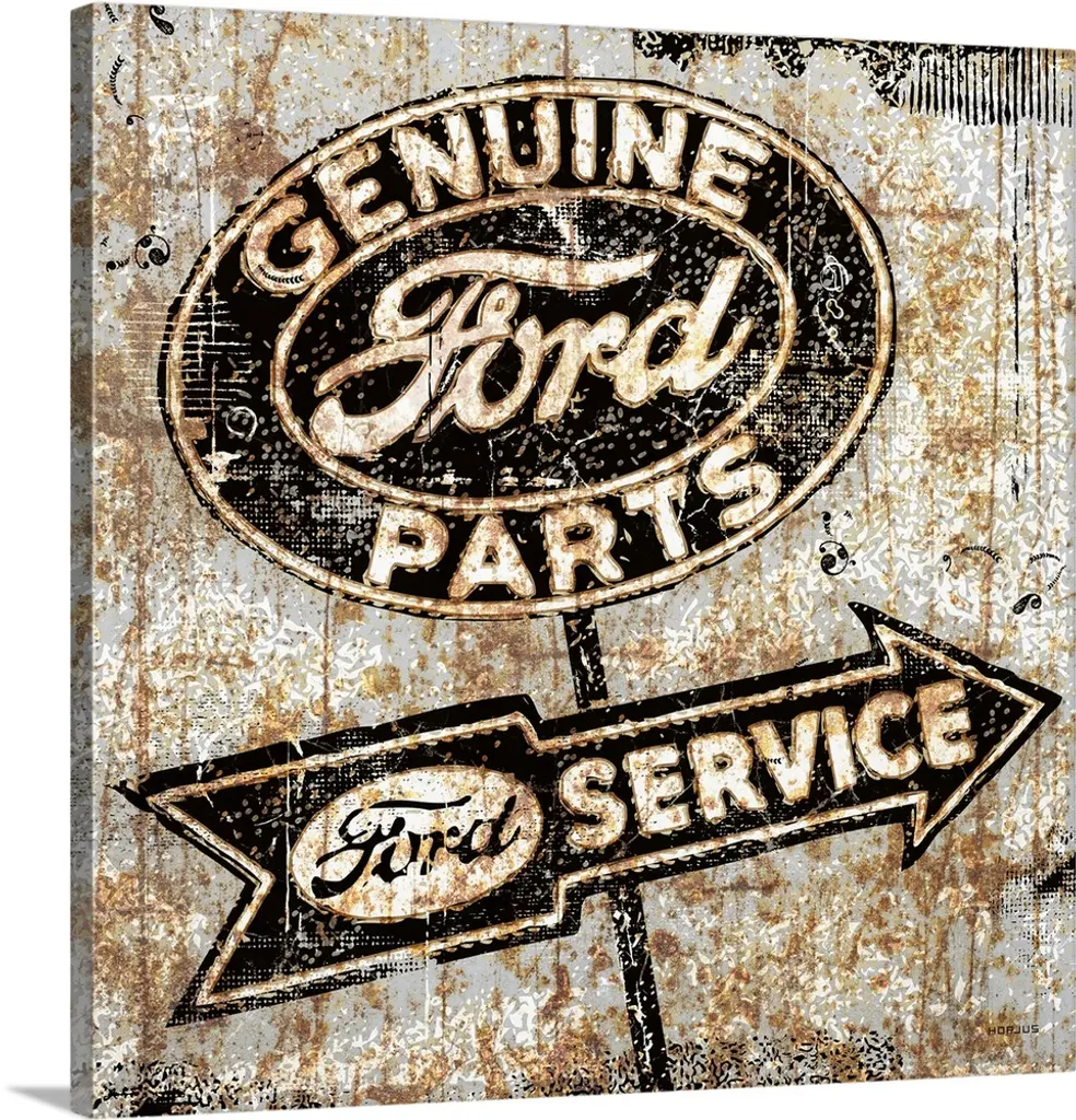 A worn, distressed, cracked and rusty Ford Genuine Parts sign.