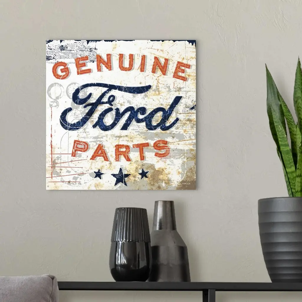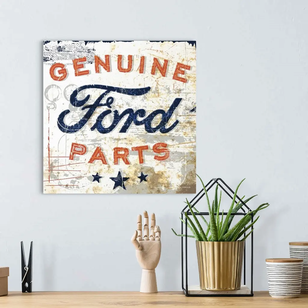A worn, distressed, cracked and rusty Ford Genuine Parts sign.