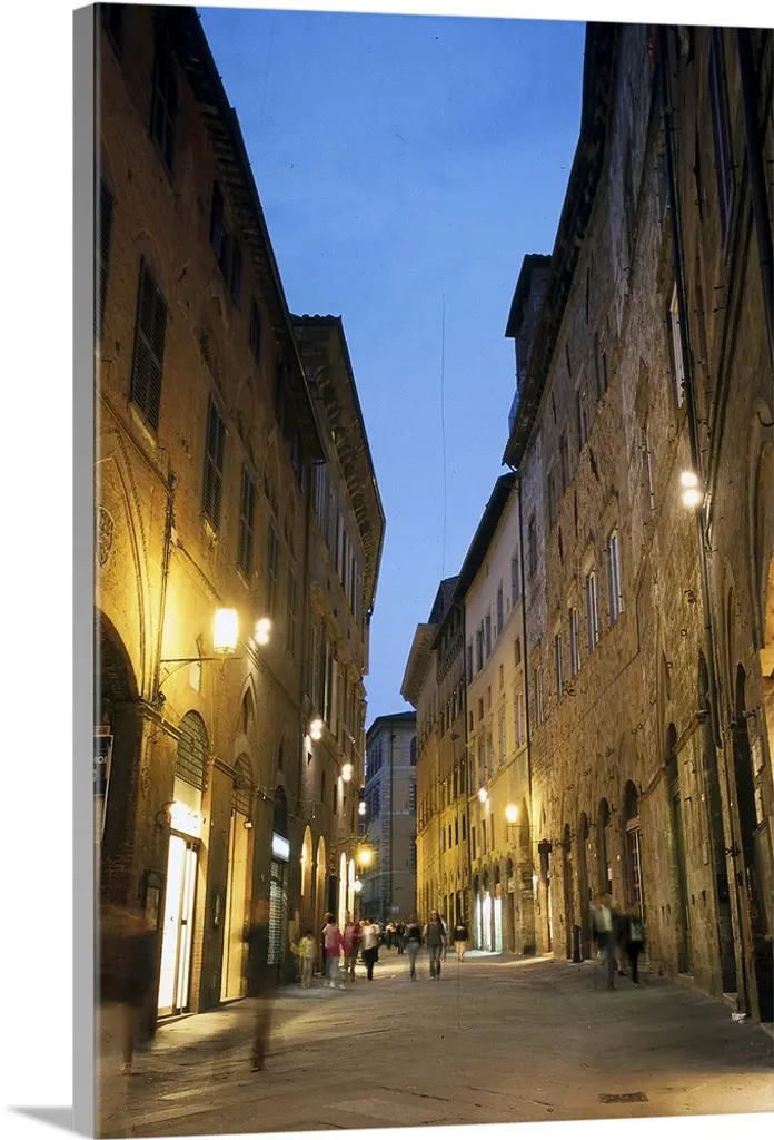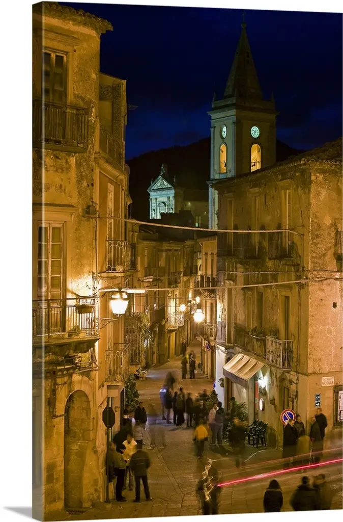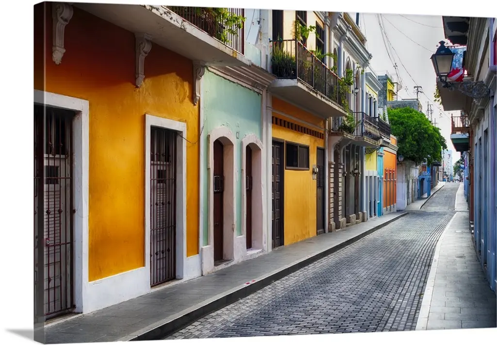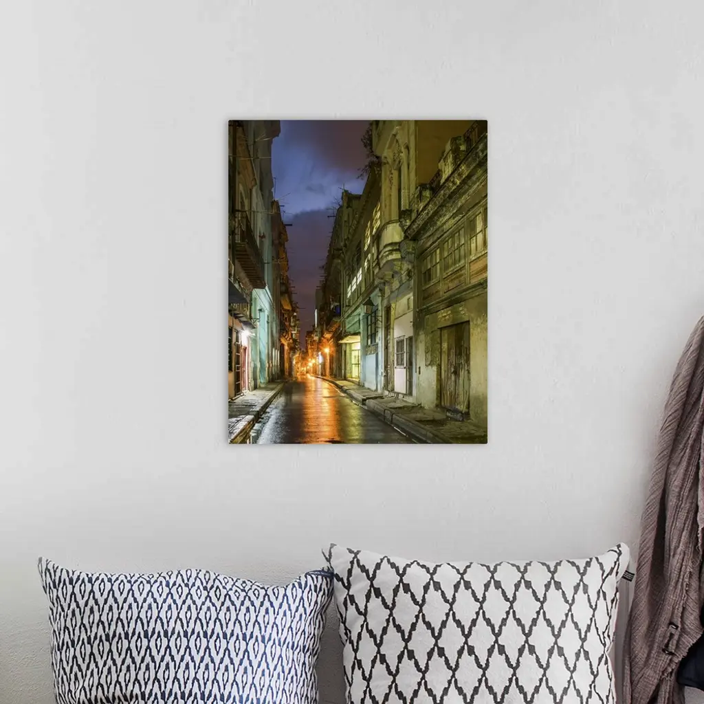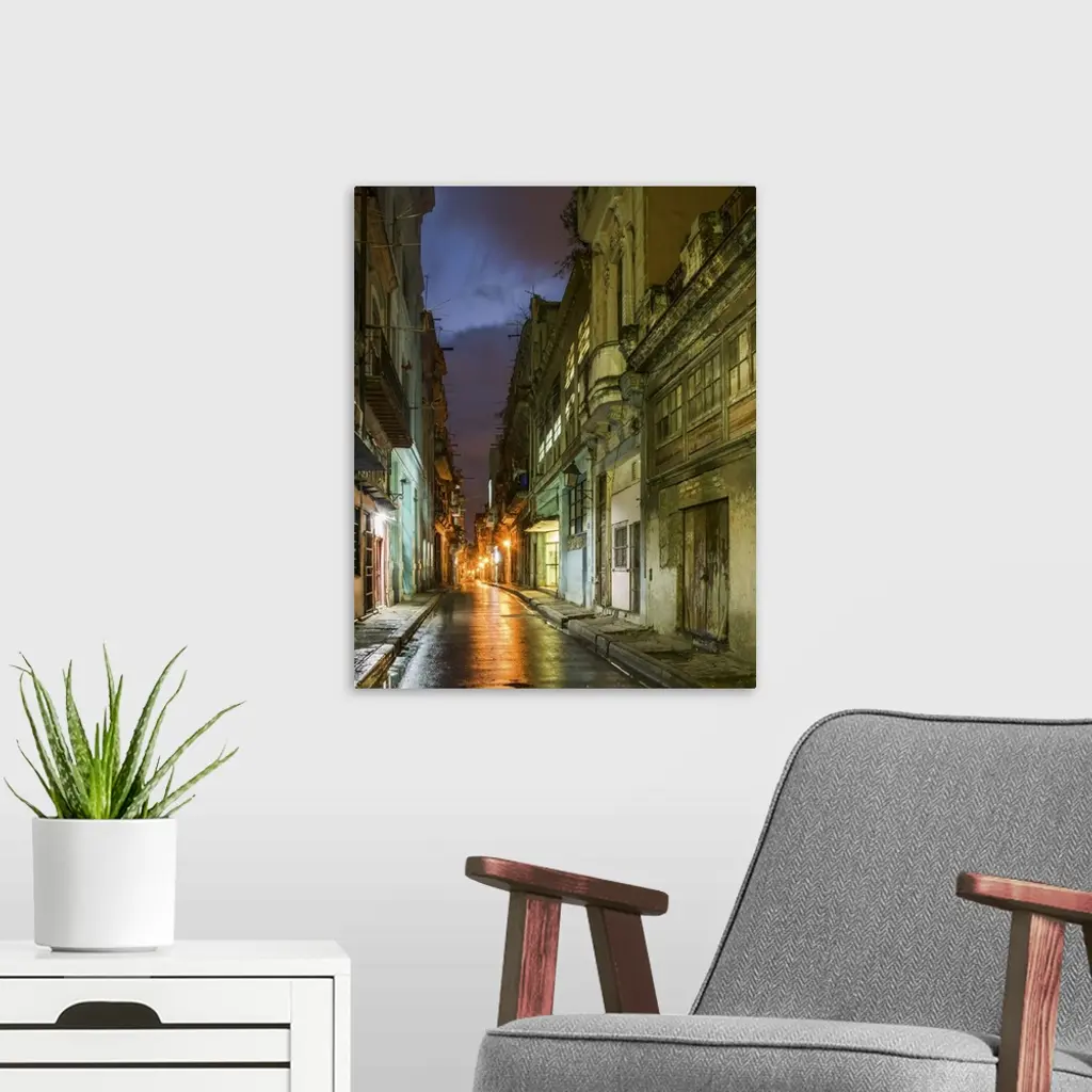 Lights from old buildings reflected on rainy streets in an alley in Havana, Cuba.